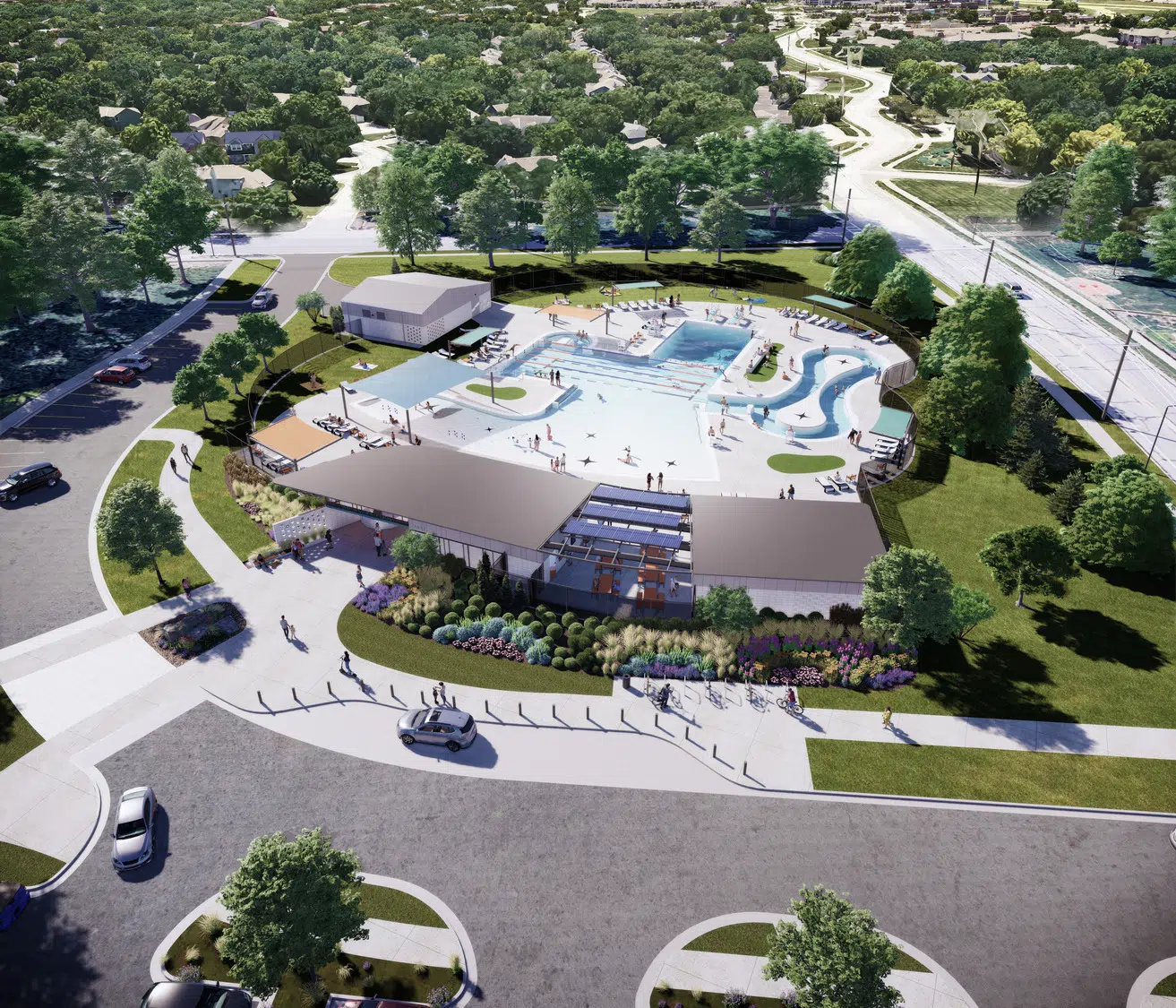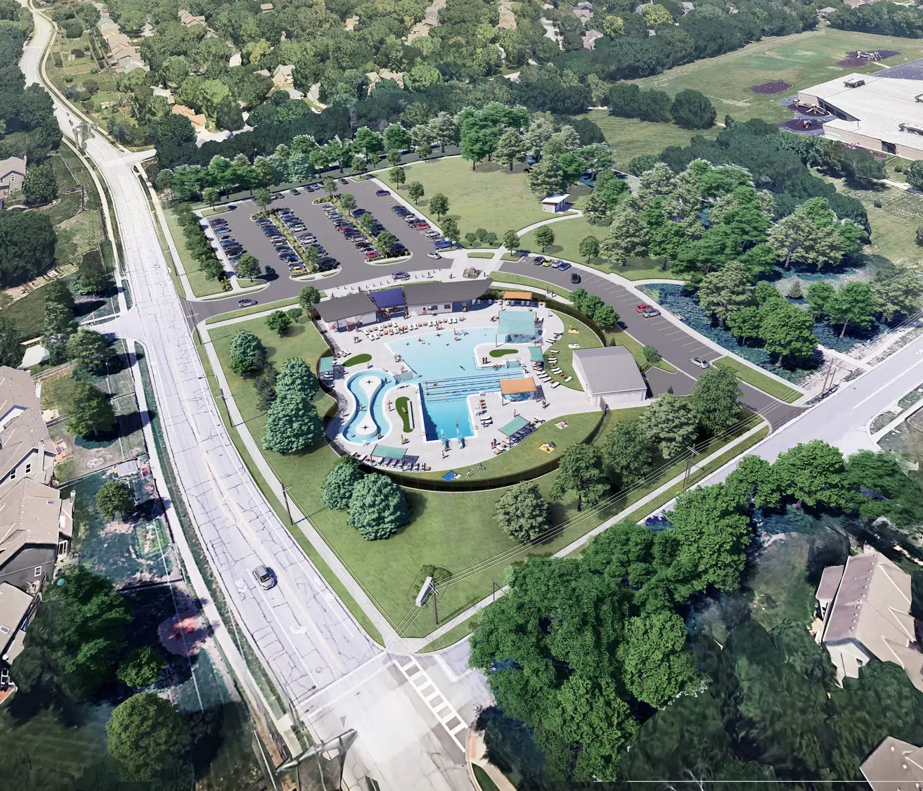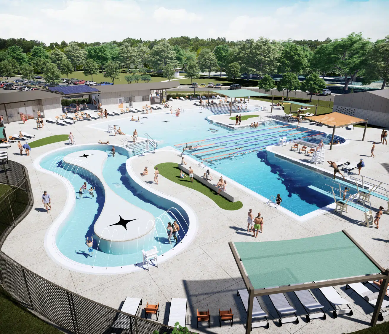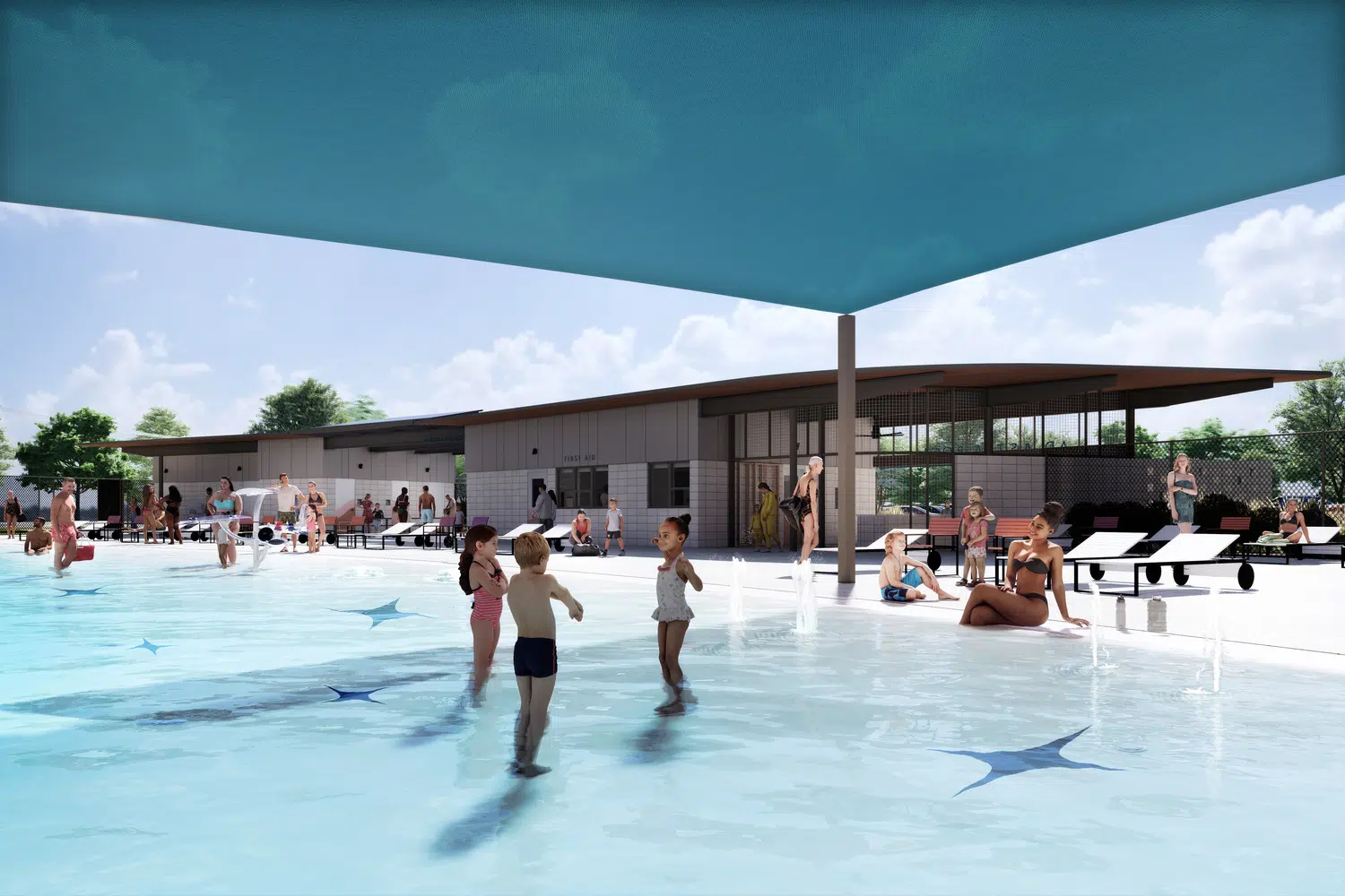The final design reflects the community's priorities which made the Ad Astra Pool a favorite in the neighborhood. Open water with lap lanes, resort-inspired social pool amenities, expansive pool deck and lawn areas, ample shade, a current channel, and water depths range from a zero-depth entry to a deep water diving well make this neighborhood pool packed with features.