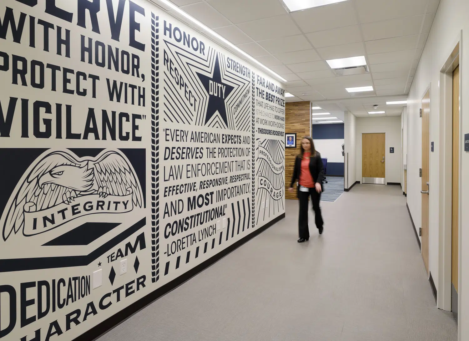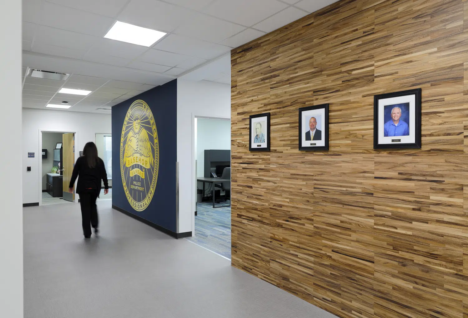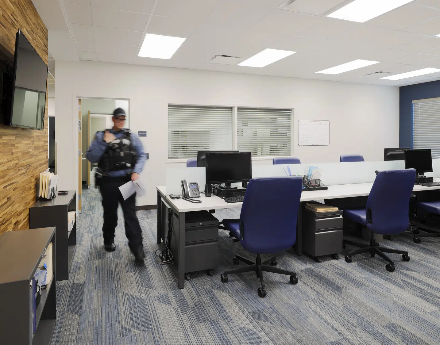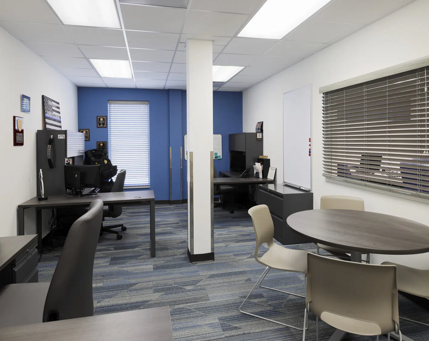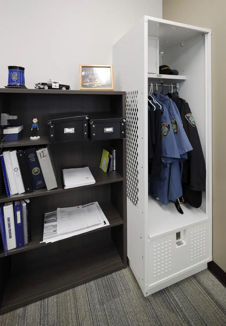 The city subsequently purchased an existing 5,200 square foot office building to be utilized by the department. The city also purchased one acre of land to the west of the building for which SFS provided a master plan concept anticipating department growth, future firing range, and potential co-location of city council and municipal courts functions. SFS assisted the city with program confirmation and provided full architecture, engineering and construction administration services to transform the existing building into the Basehor Police Station. The new station includes a training room, interview rooms, evidence storage and processing that meets proper chain of custody requirements and CALEA standards. Associated site work included new drives and covered parking for patrol vehicles to accommodate 20 sworn officers, civilian staff and marked department vehicles.