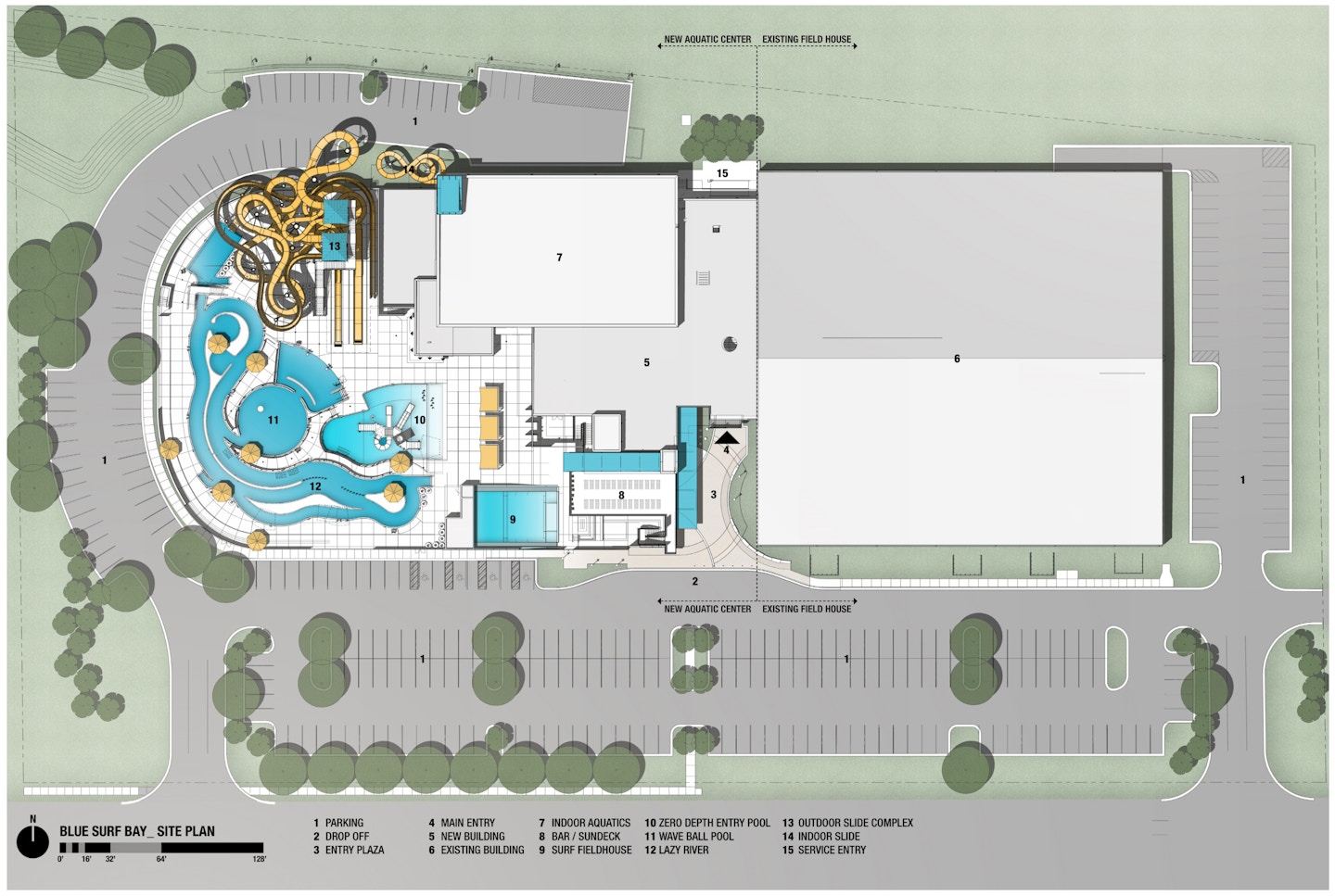 Additional amenities include event and party rooms, a branch health clinic, and universal changing facilities.