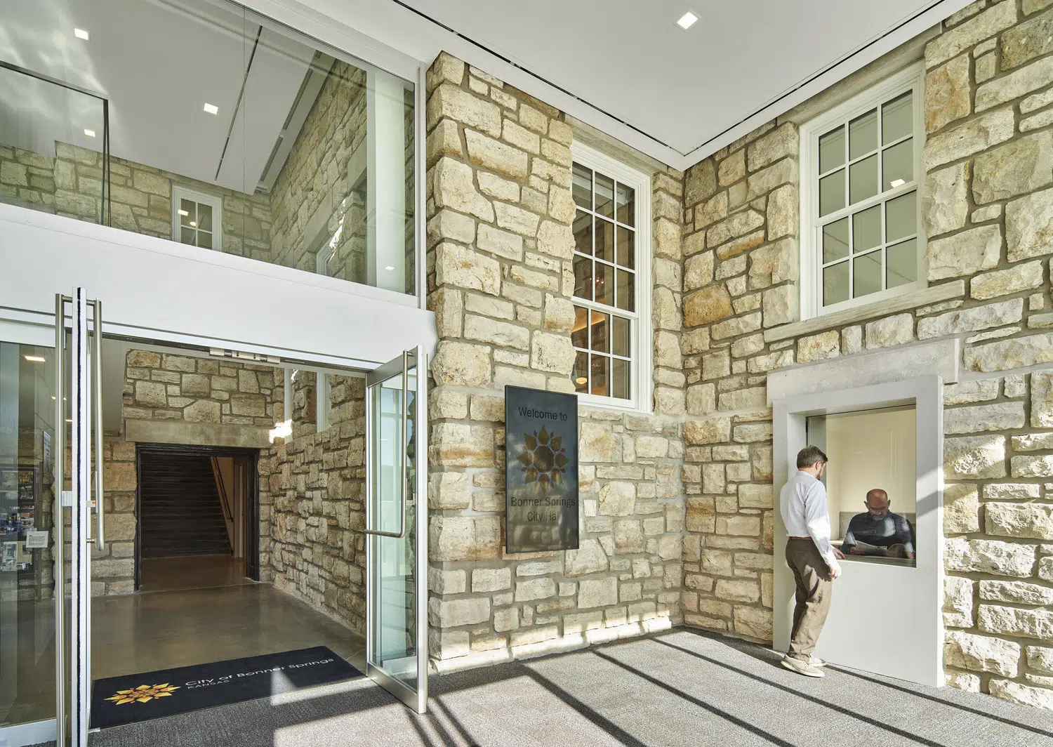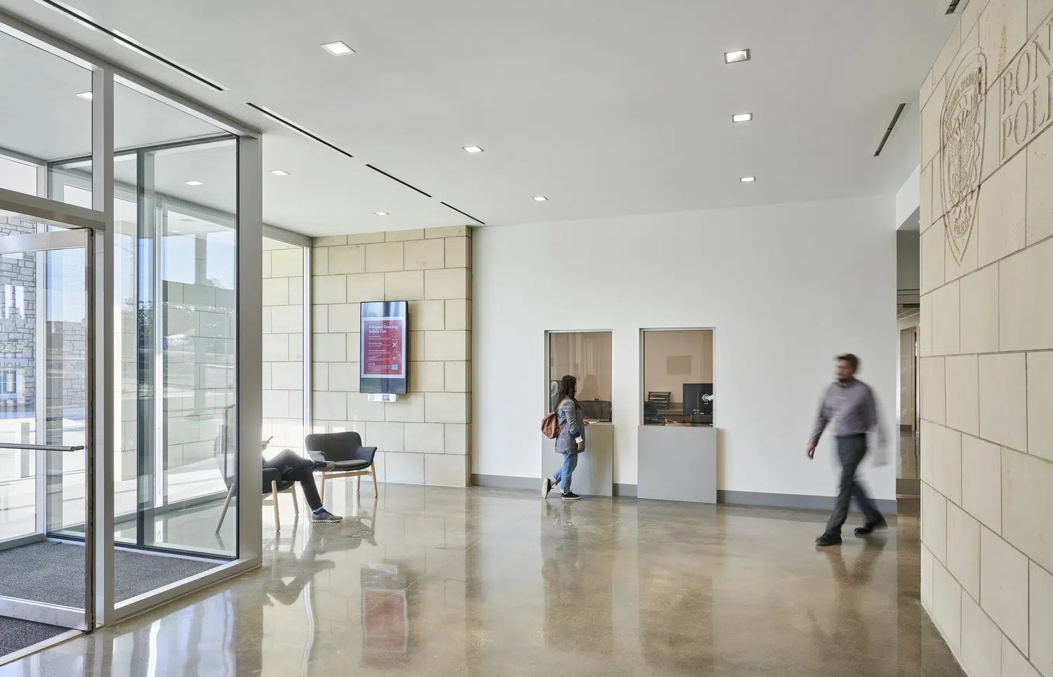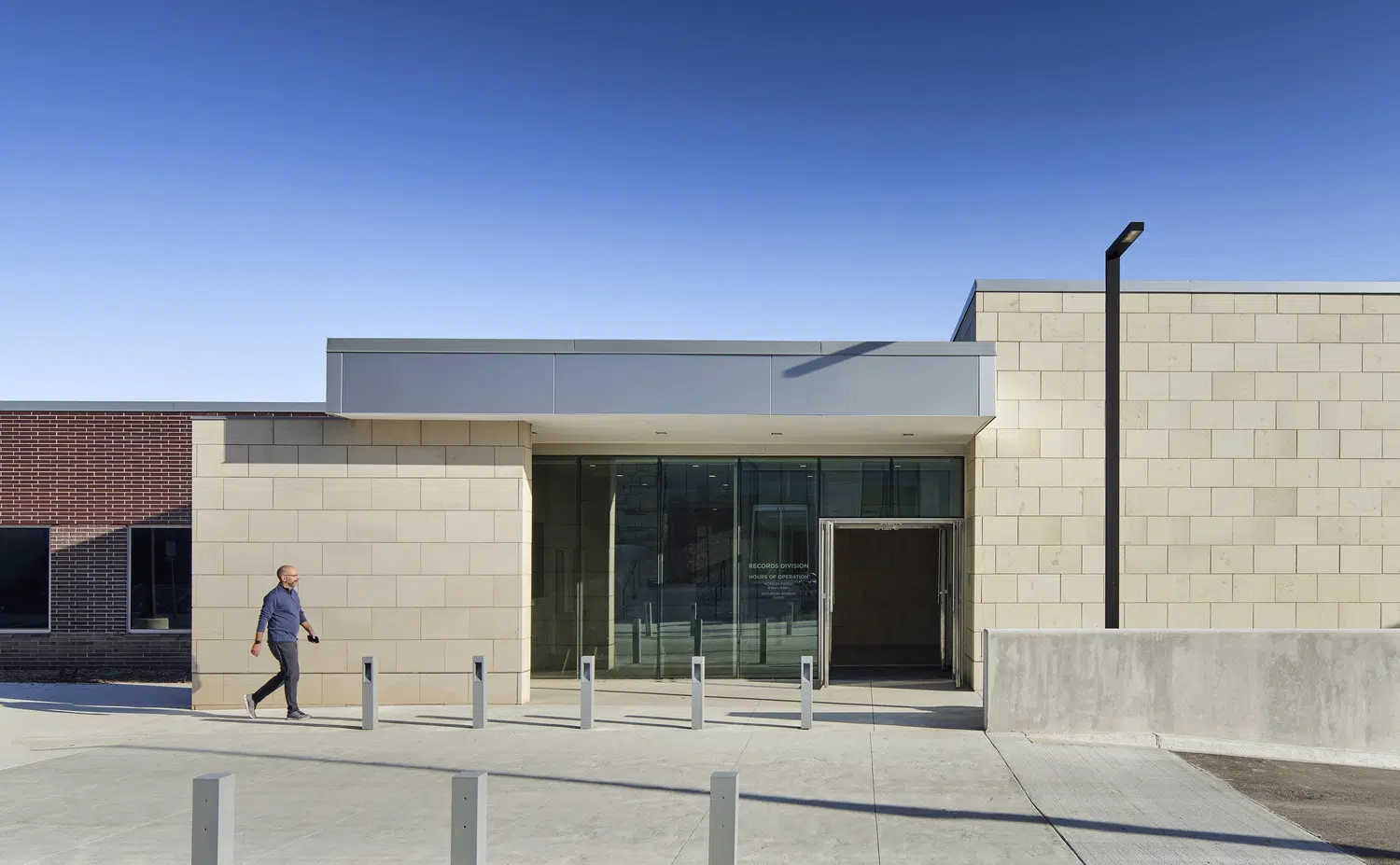 The design of the expansion and new police facility complement the historic building while remaining distinctly contemporary. Native Kansas limestone matching the 1918 building's limestone clads the addition and police facility with a honed finish in lieu of the rough-cut finish of the historic building. The base of the addition matches the datum line of the base of the historic building.