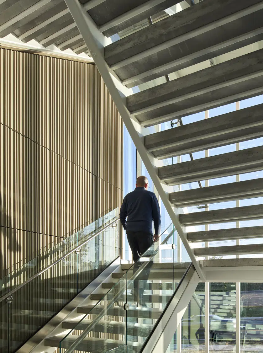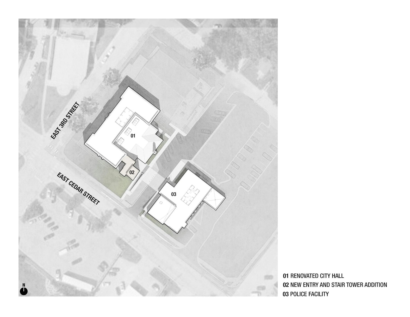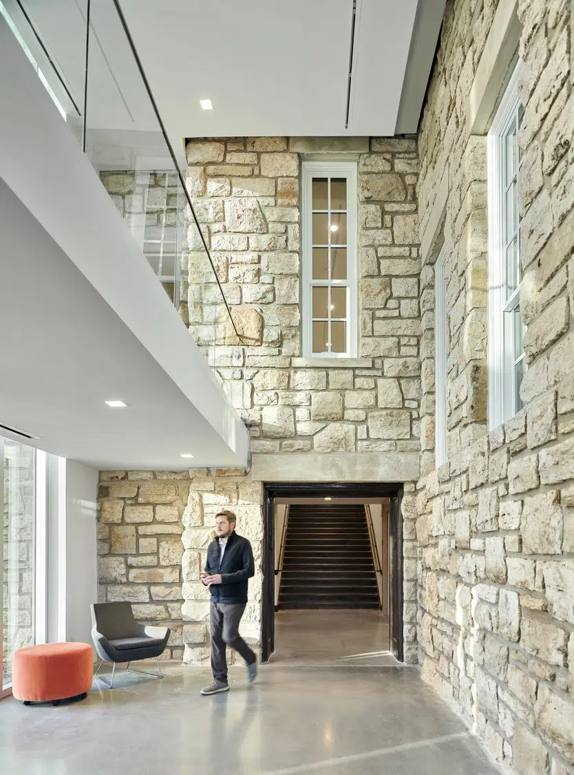 The design of the expansion and new police facility complement the historic building while remaining distinctly contemporary. Native Kansas limestone matching the 1918 building's limestone clads the addition and police facility with a honed finish in lieu of the rough-cut finish of the historic building. The base of the addition matches the datum line of the base of the historic building.