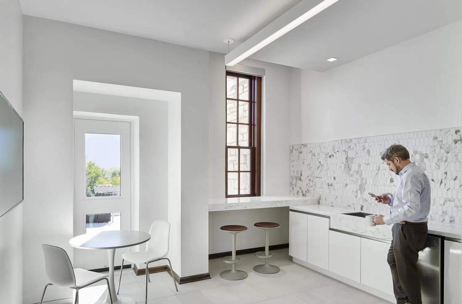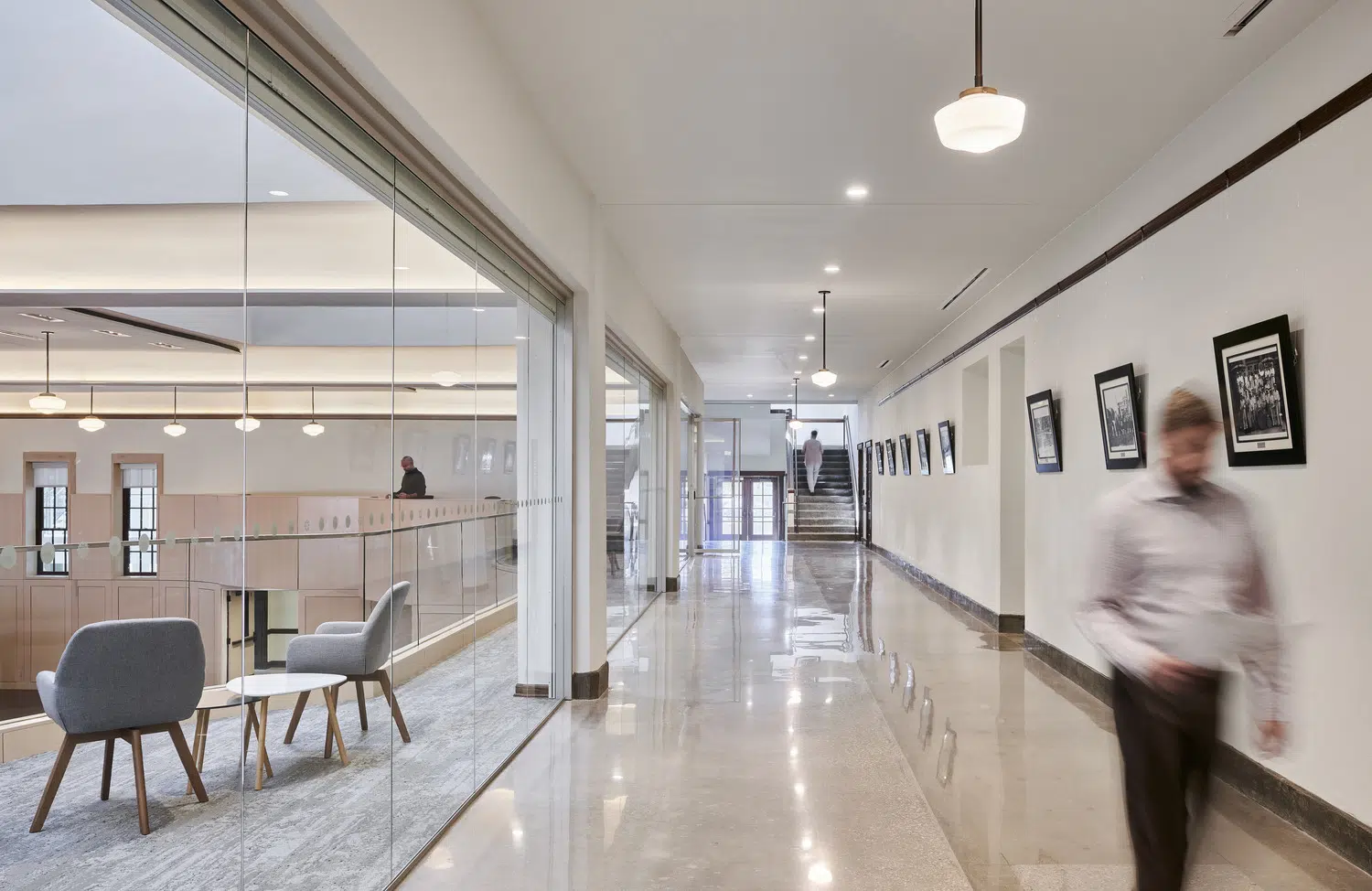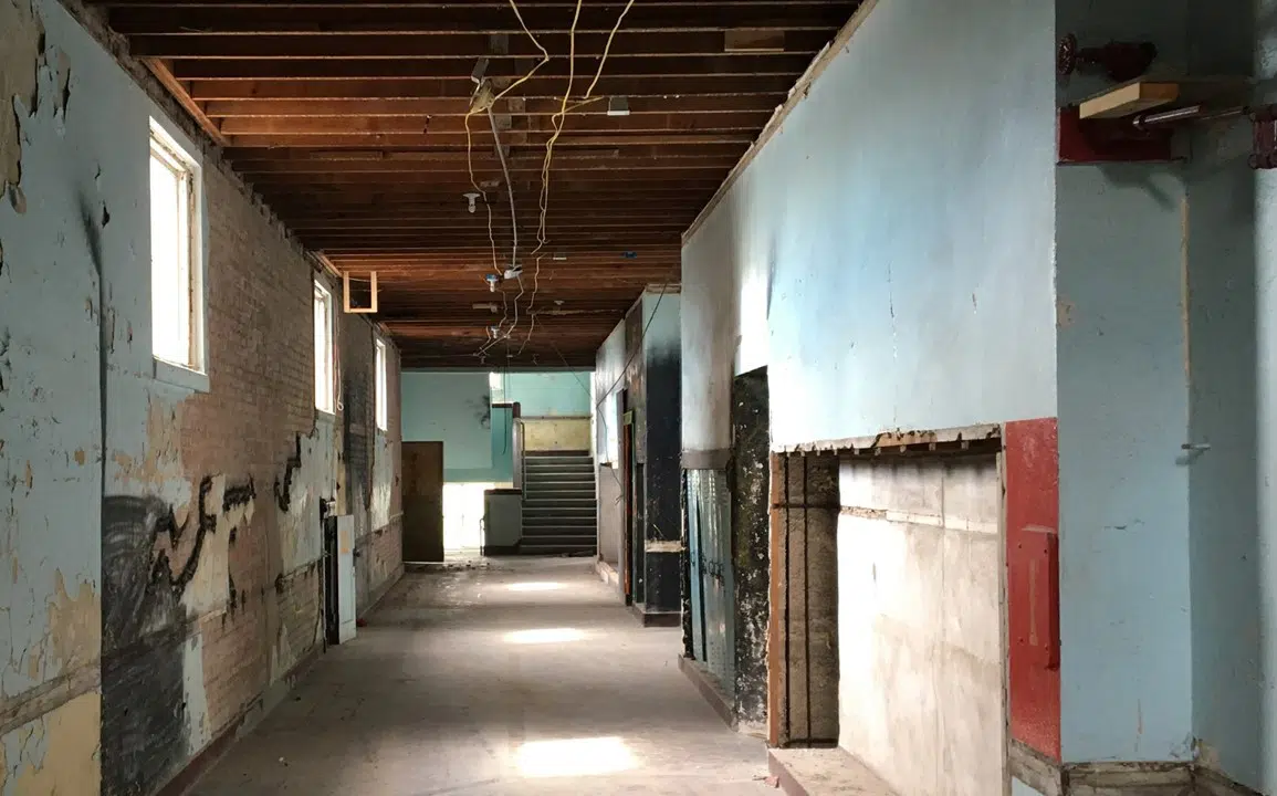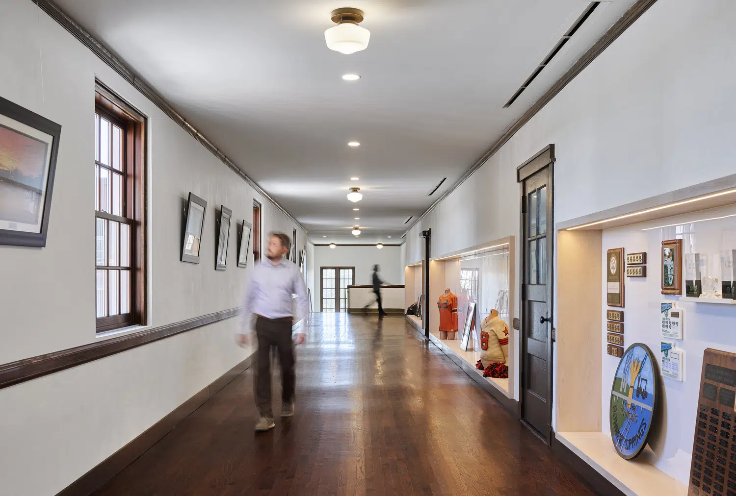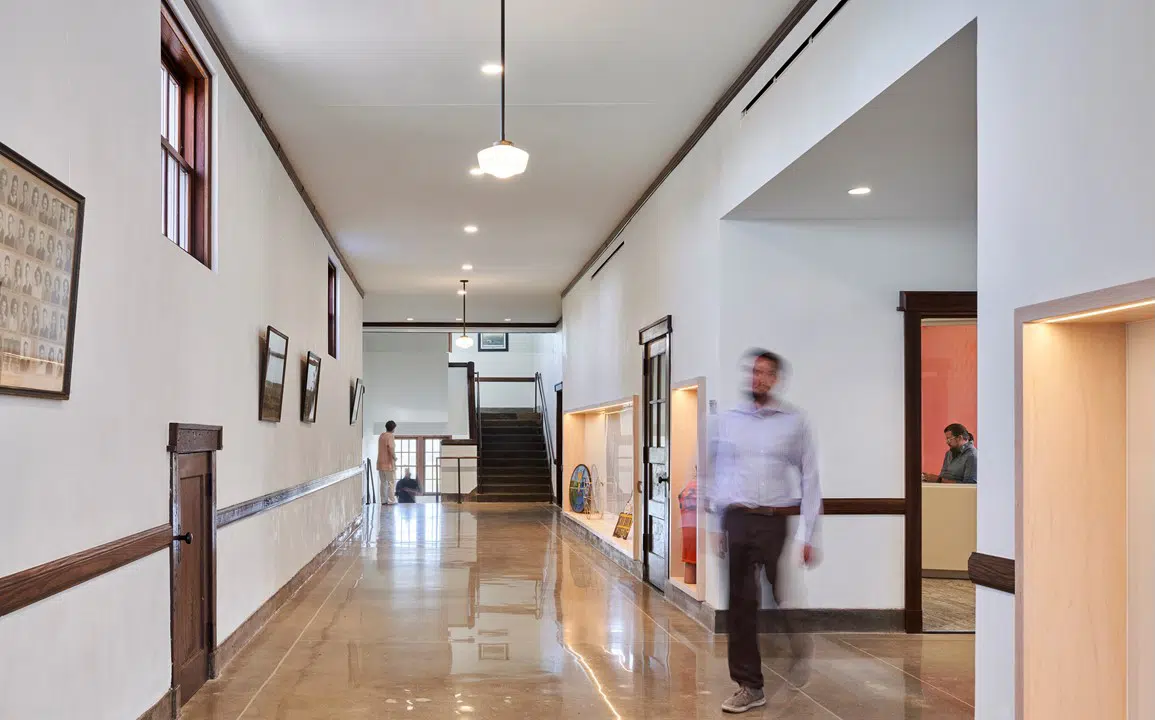 After nearly thirty years of sitting vacant and unconditioned, then occupied by a haunted house, the historic building’s interior features and finishes were greatly compromised. Restoration required an intensive effort with craftsmen repairing and replacing the building’s three-coat plasterwork, and restoring the original concrete floors, original multi-paneled wood doors, classroom bookcases and running trim.