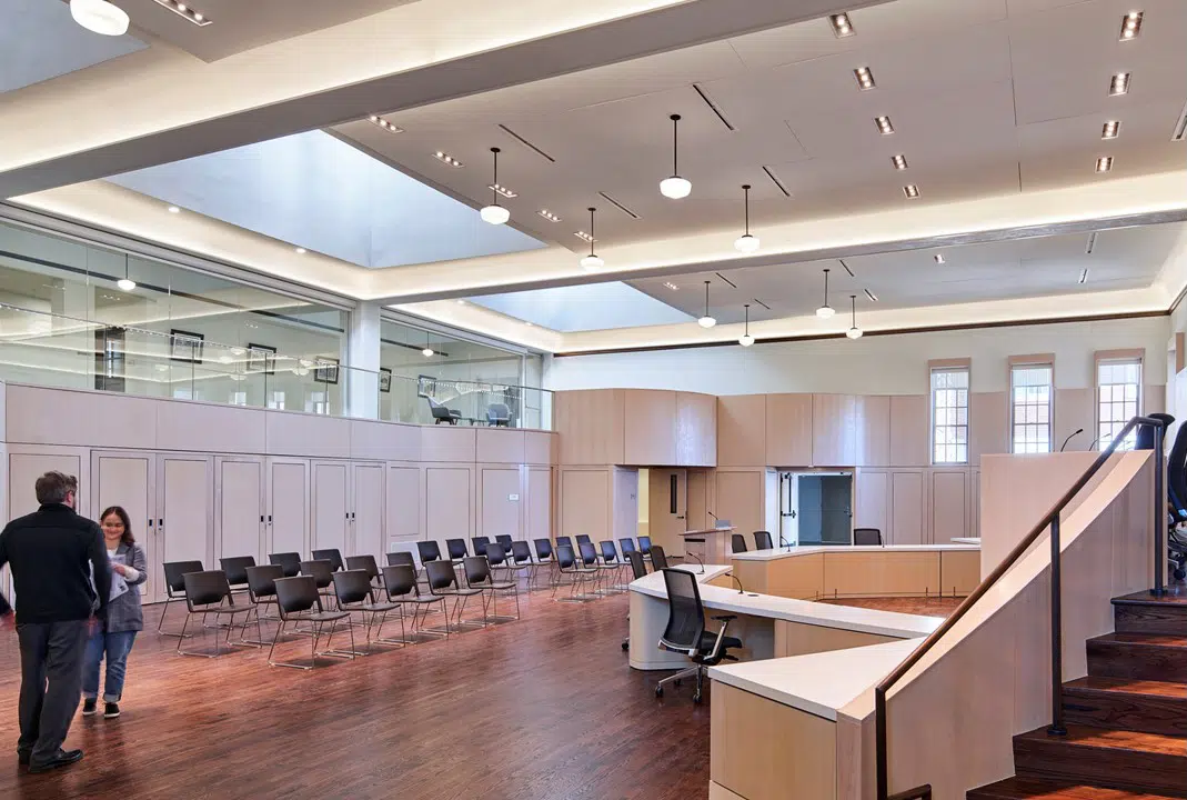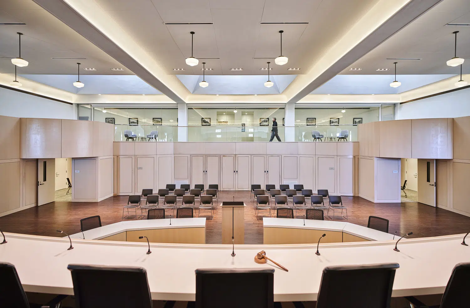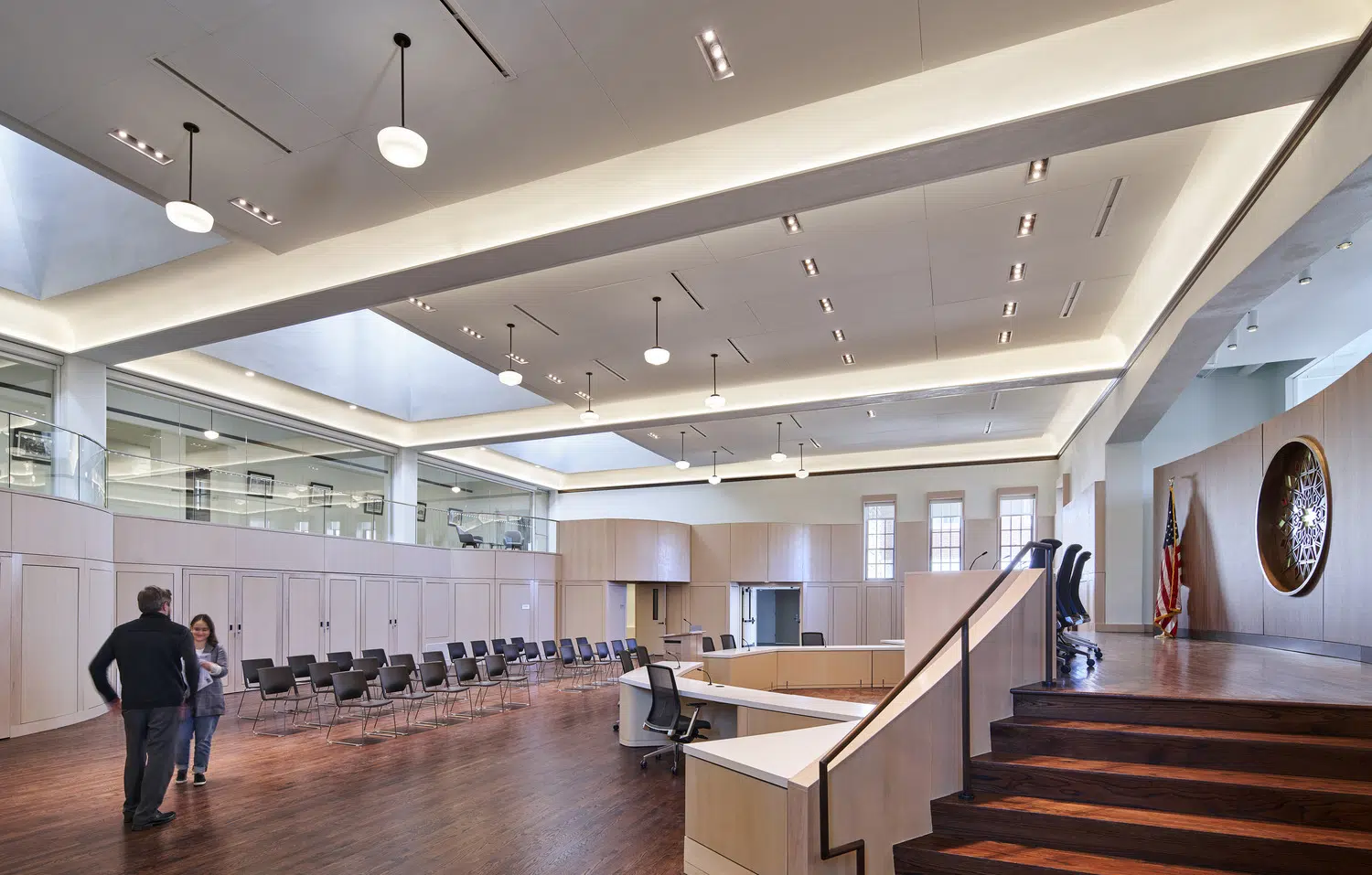 The original auditorium proscenium was restored for the backdrop of the new city council dais. New mechanical, electrical, plumbing and fire protection infrastructure utilized original horizontal and vertical chases to not destroy any historic spaces.