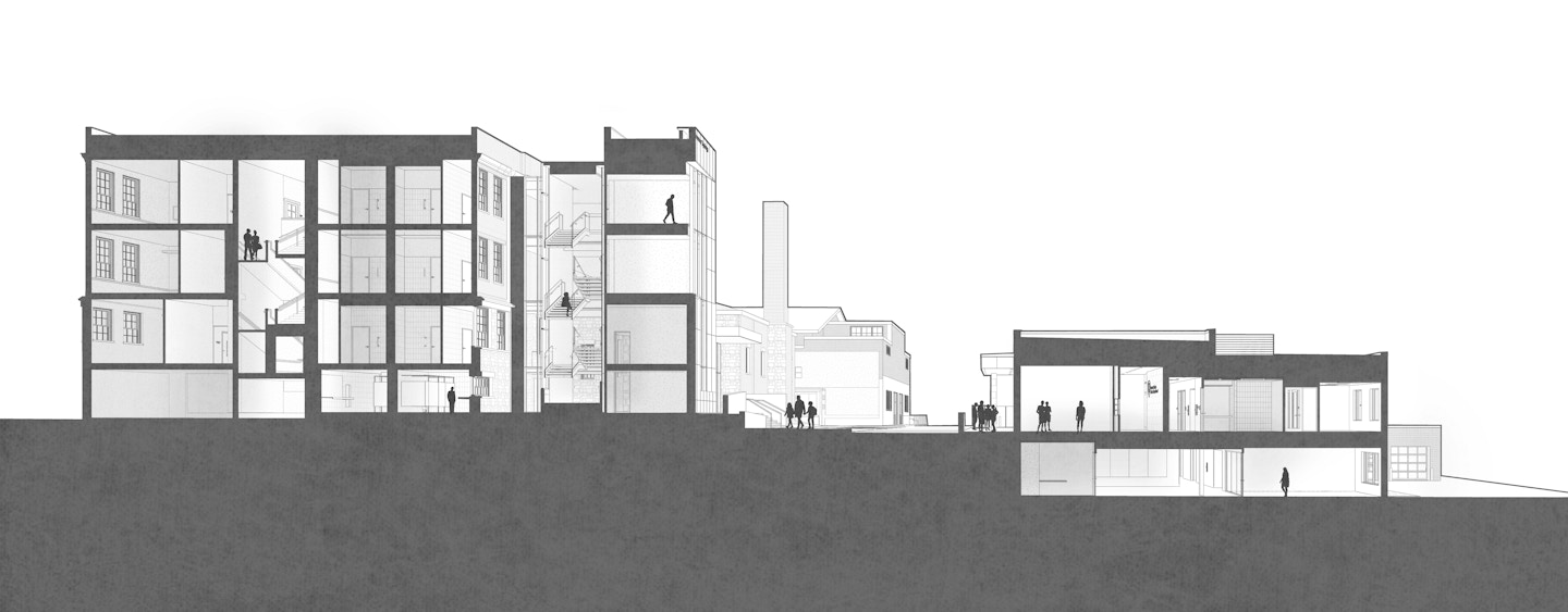 An addition to the rear facade of the historic building houses a new elevator, staircase and building entrance that visually connects to the new 13,800 square foot police facility across a public plaza