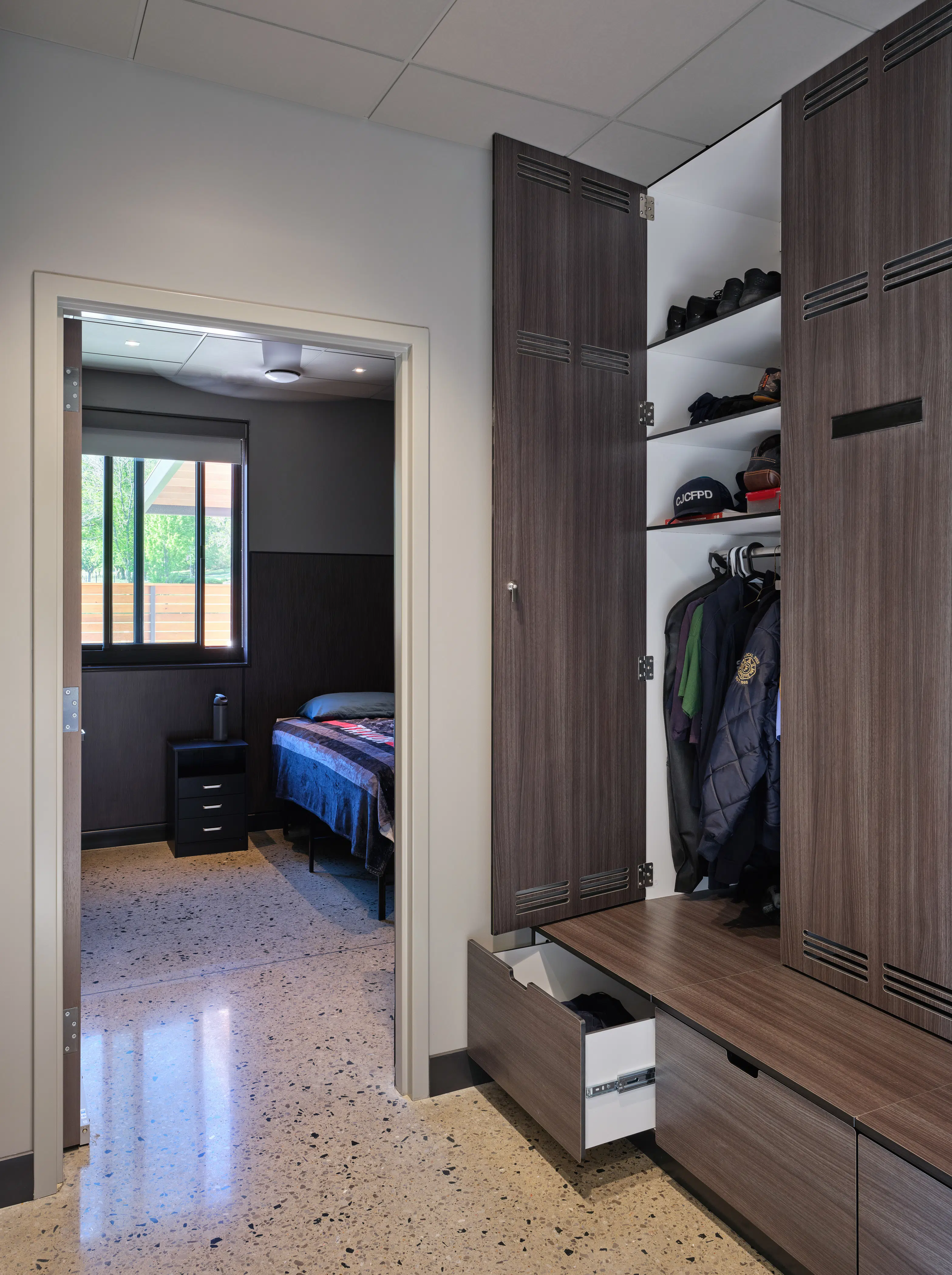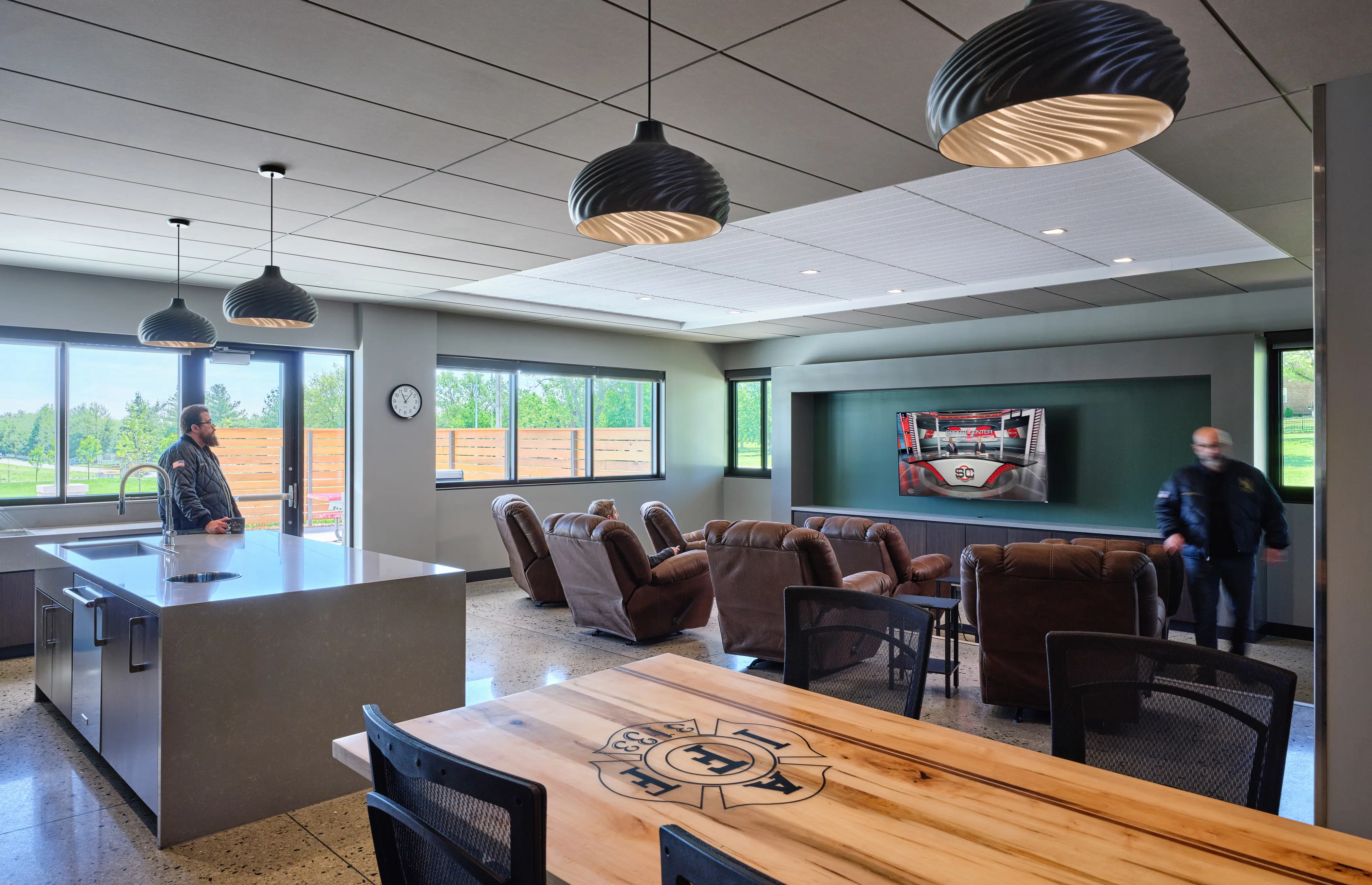 SFS organized the building into distinct hazard zones, classified by levels of carcinogen exposure. High hazard zones, including the four bay, double-deep, drive through apparatus bay accommodating heavy rescue, SCBA room, decontamination area, and gear storage areas, are designed to contain the highest risks. Moderate hazard transition zones function as buffers, limiting the transmission of and exposure to harmful carcinogens. Vestibules with hand-wash sinks, walk-off mats, and nearby shower rooms separate high-hazard zones from the station’s living quarters. Low hazard zones, which contain the station’s living spaces, provide a safe, 24-hour home for firefighters.