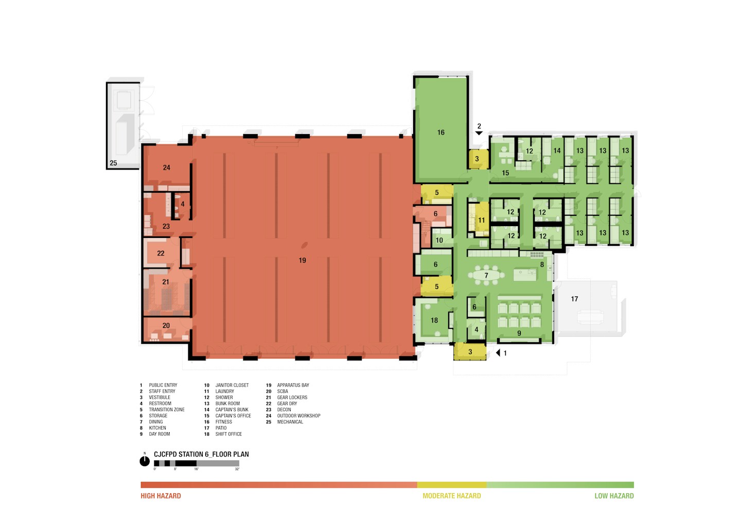 Dedicated to the health, safety, and well-being of first responders, Station 6 embodies advances in contemporary station design. By prioritizing occupational health through strict contamination control, the facility manages exposure to harmful chemicals through careful spatial organization.