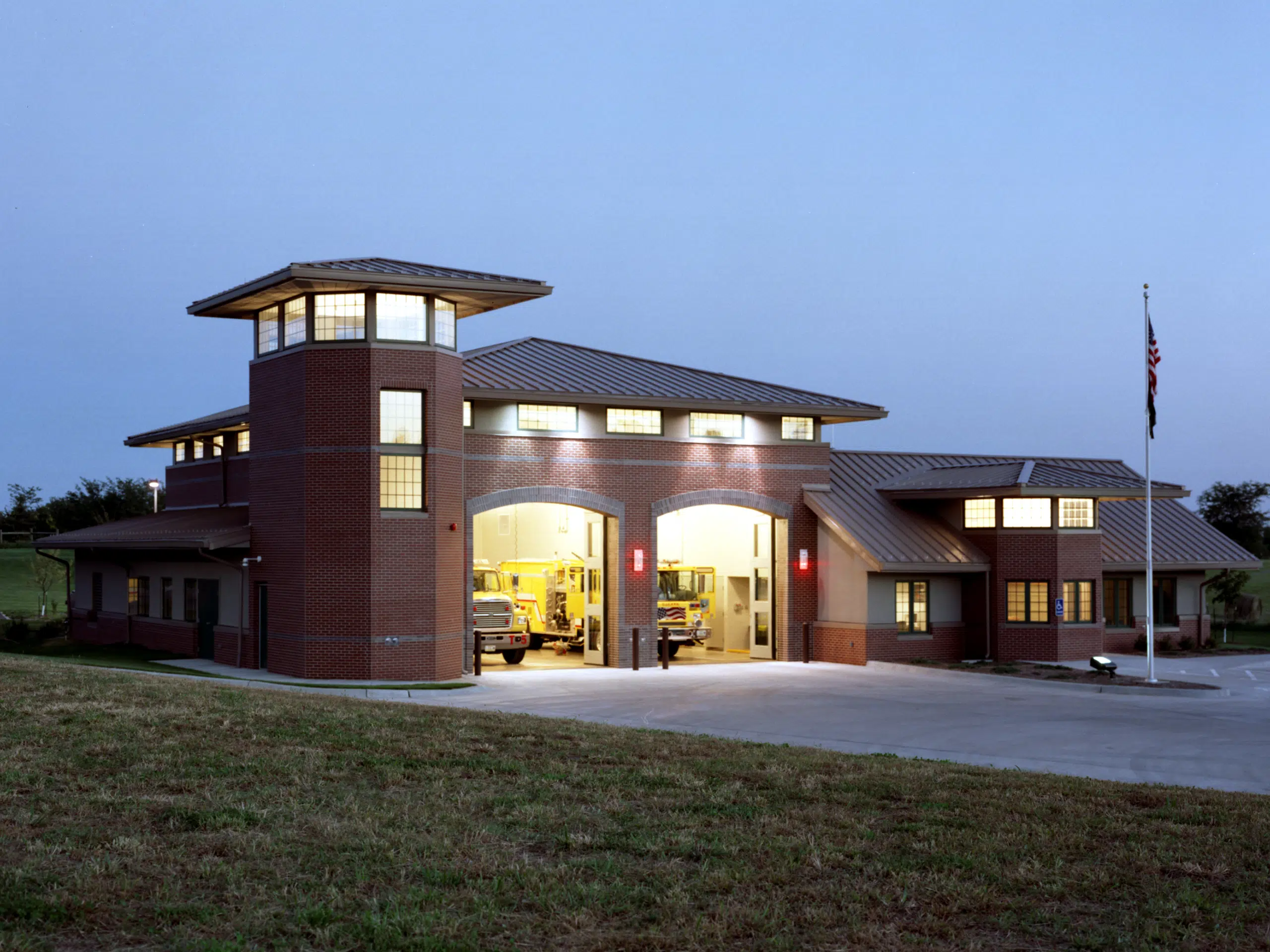 Located along the rapidly expanding Adams Dairy Parkway in Blue Springs, Missouri, the 8,200 square foot Fire Station 5 provides living accommodations for six firefighters and EMS personnel. The station’s design pays homage to long-standing firehouse traditions, with a working hose tower providing a vertical marker for the station and arched openings over the apparatus bay entries.