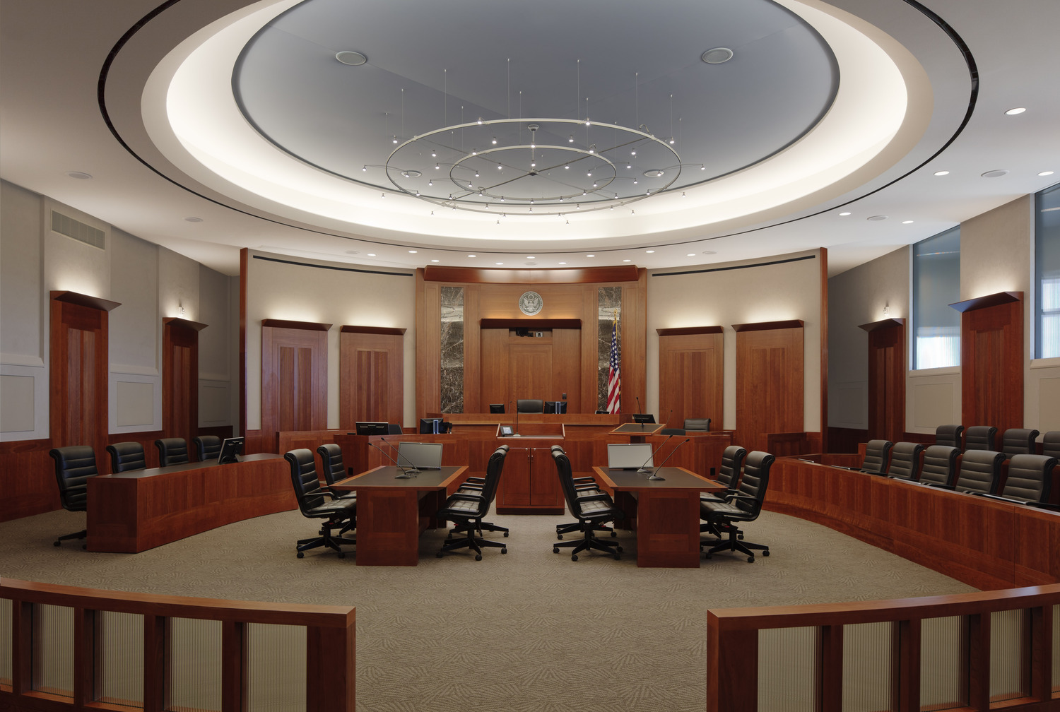 3D modelling was utilized throughout the design phase to help judges understand courtroom design concepts. The most current technology was integrated for the judge, jury, spectators and attorneys. Accessibility was achieved for all participants in the court proceedings. Specifications required a courtroom mock-up built by the construction manager at risk.