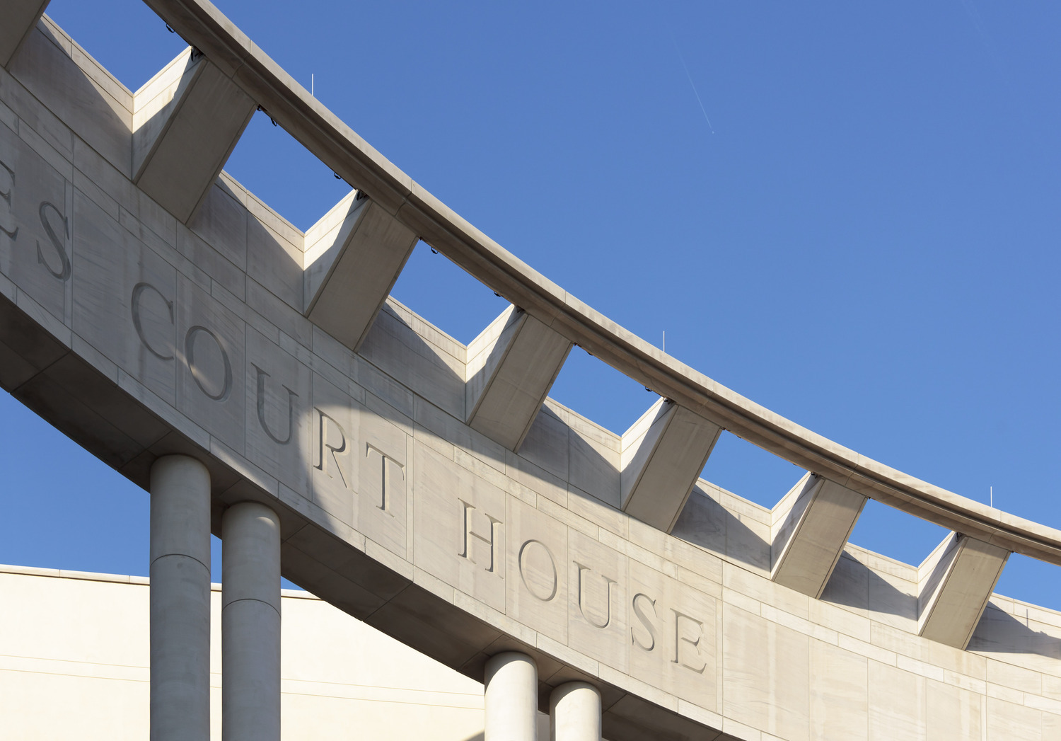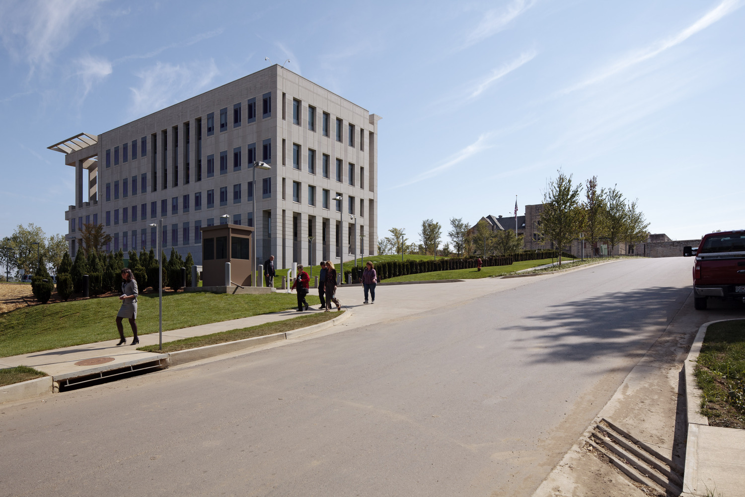 Security requirements were coordinated with the Department of Justice, beginning at the perimeter of the site to the building entrance and all interior spaces. Within the courthouse, separate and secure circulation paths were defined for the judicial, staff, public and inmates.