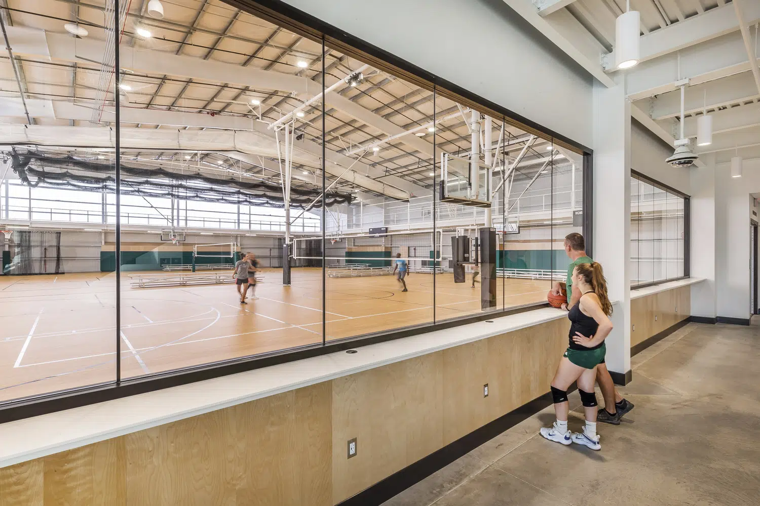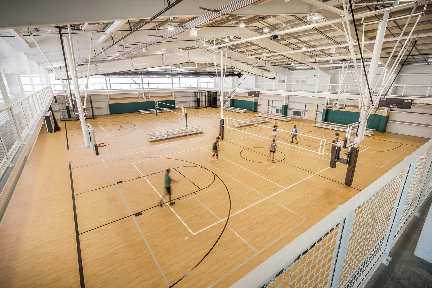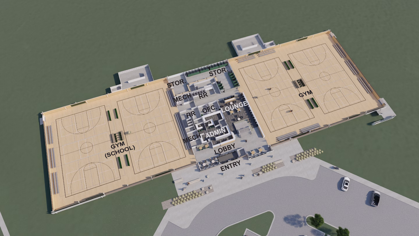 Located at opposite ends of the city, each center includes four multipurpose courts with overhead equipment for basketball, volleyball and pickleball, portable field turf for soccer and futsal, high-velocity sports netting for baseball, softball and batting tunnels, elevated running tracks and spectator seating areas. Two of the indoor courts are utilized by the school during the day, while the two remaining courts, elevated running track and lobby spaces are utilized by the public. Additional spaces include meeting rooms and a warming kitchen, staff lounge, offices and restrooms.