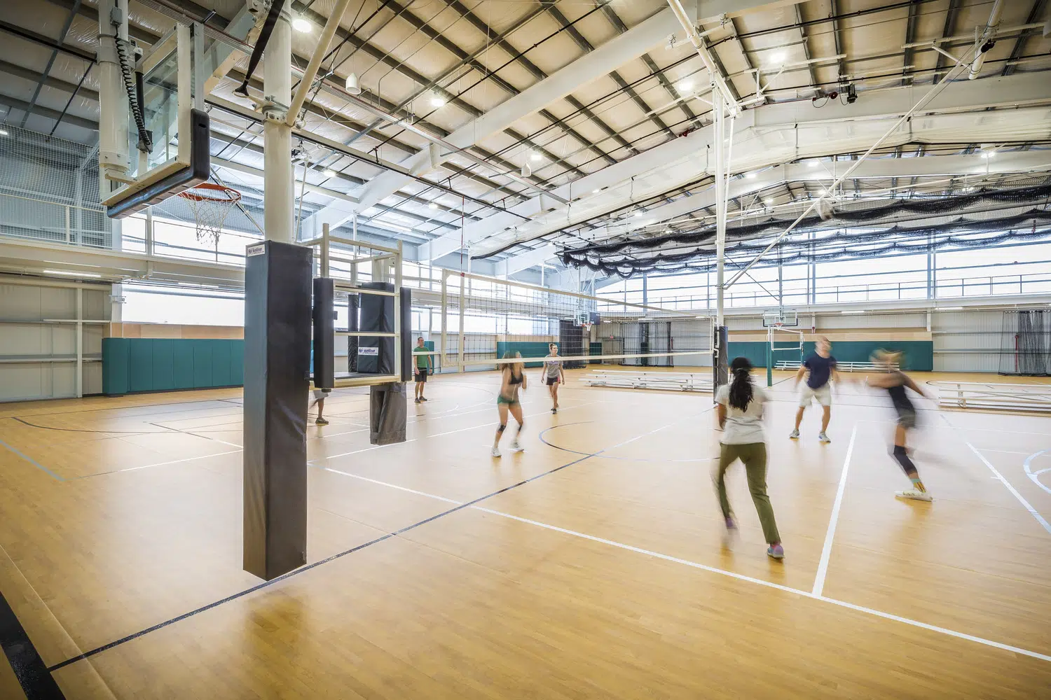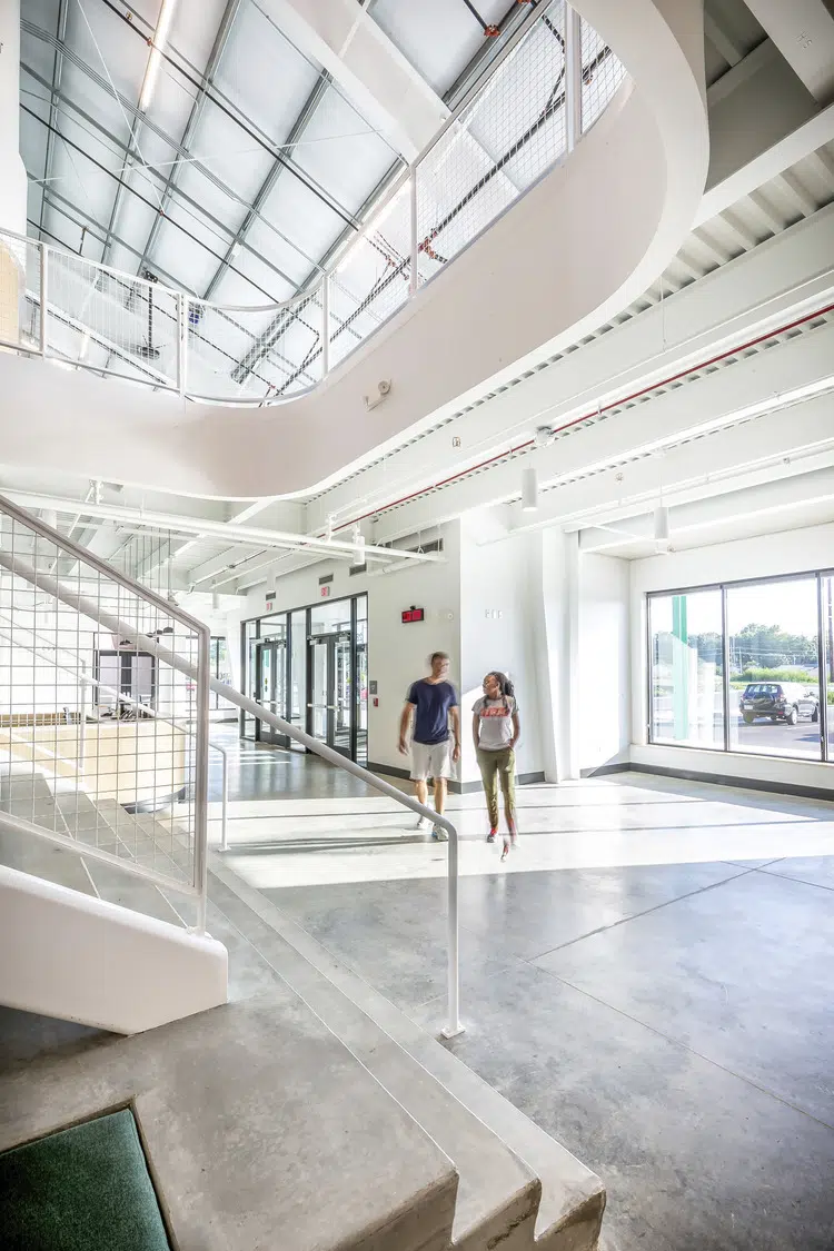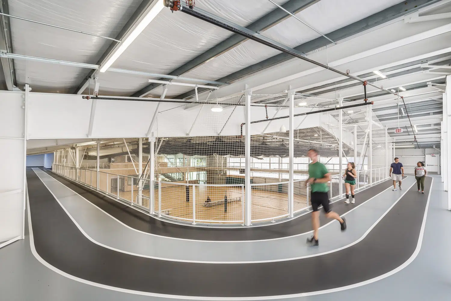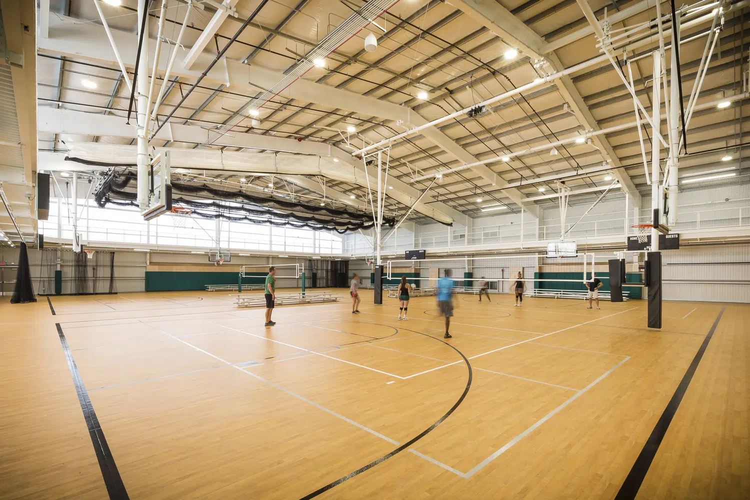 Located at opposite ends of the city, each center includes four multipurpose courts with overhead equipment for basketball, volleyball and pickleball, portable field turf for soccer and futsal, high-velocity sports netting for baseball, softball and batting tunnels, elevated running tracks and spectator seating areas. Two of the indoor courts are utilized by the school during the day, while the two remaining courts, elevated running track and lobby spaces are utilized by the public. Additional spaces include meeting rooms and a warming kitchen, staff lounge, offices and restrooms.