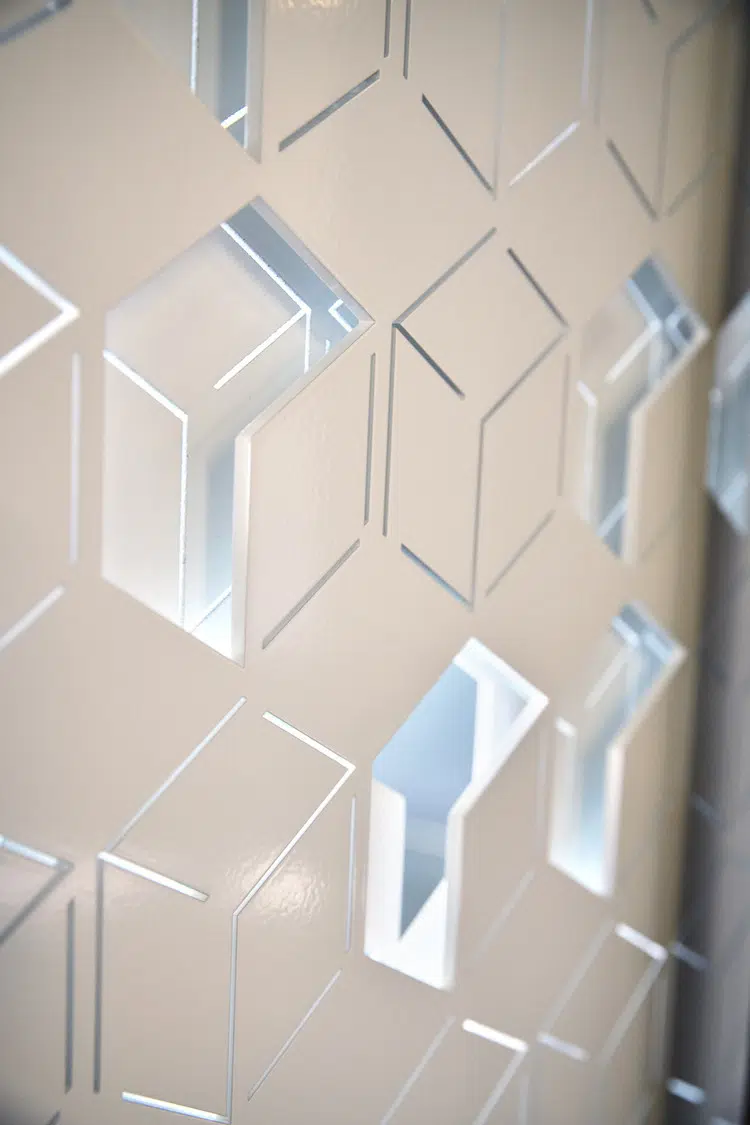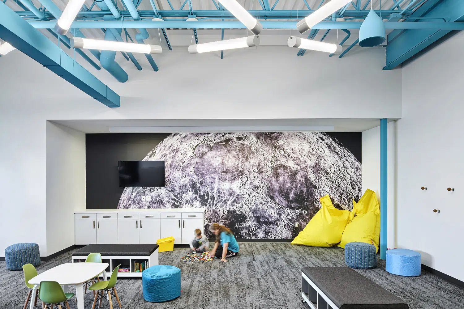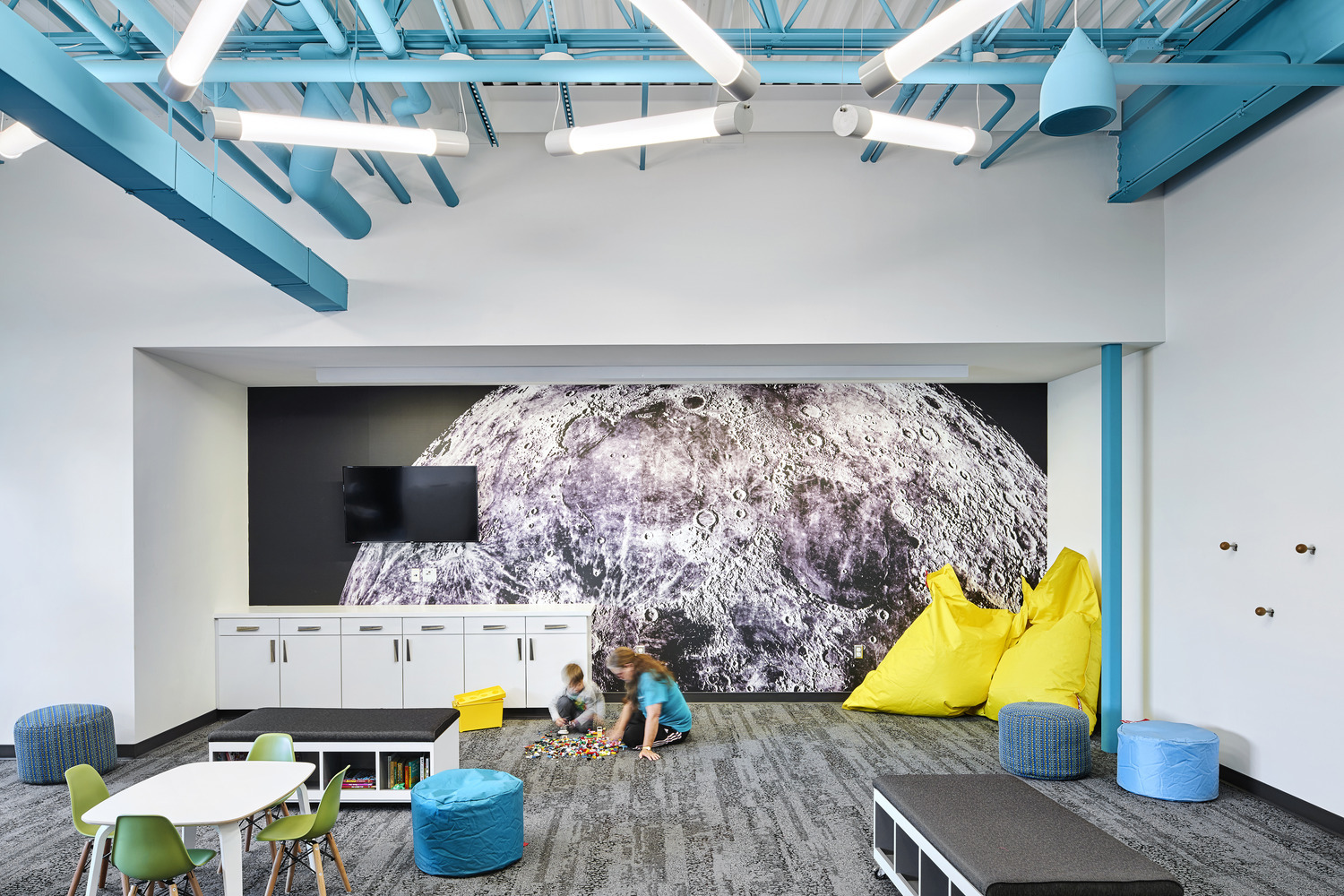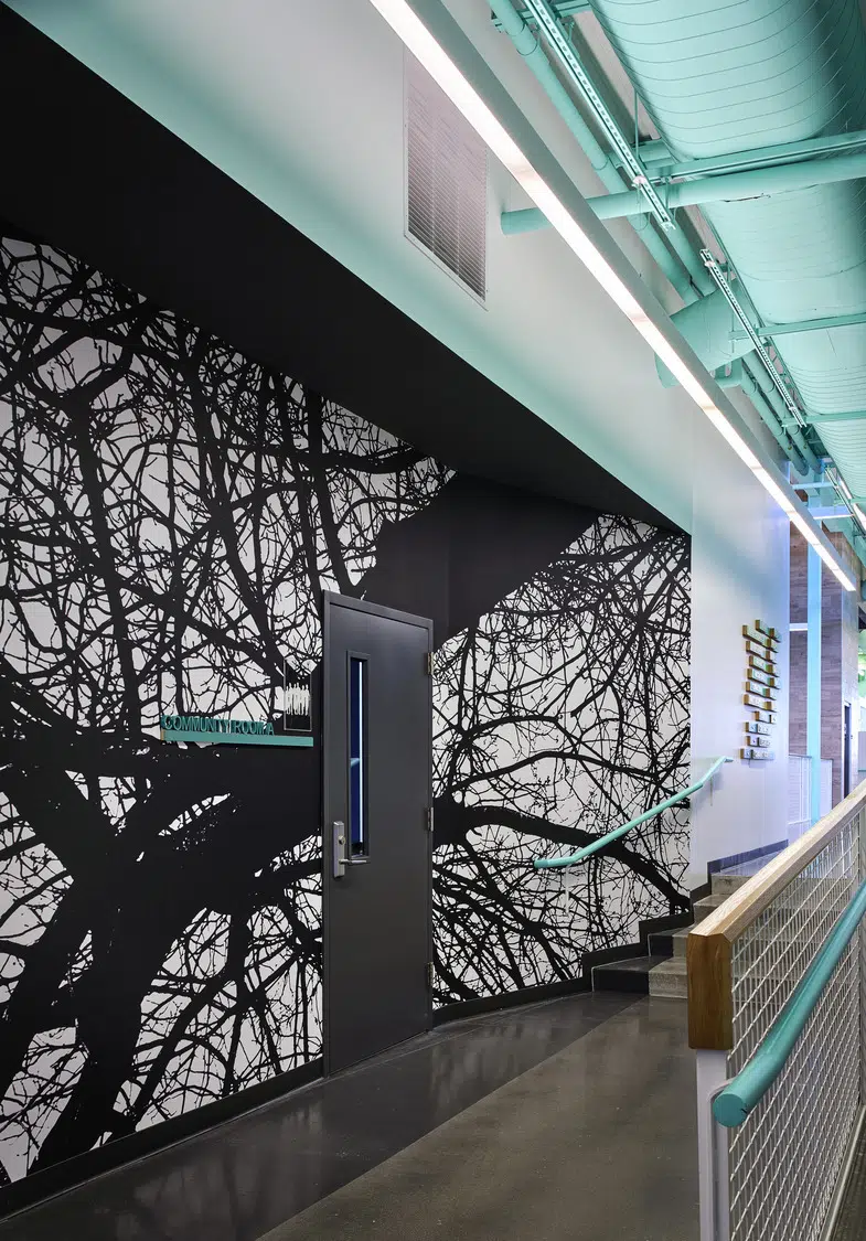 Super graphics are meant to provoke thought and inspire minds, while dark niches at entryways that carve from the dominantly white vertical surfaces (skin) provide intimacy and refuge from the large dynamic spaces. Light was considered a material and design element more than a by-product, with large openings strategically placed at common spaces and activity areas throughout the center.