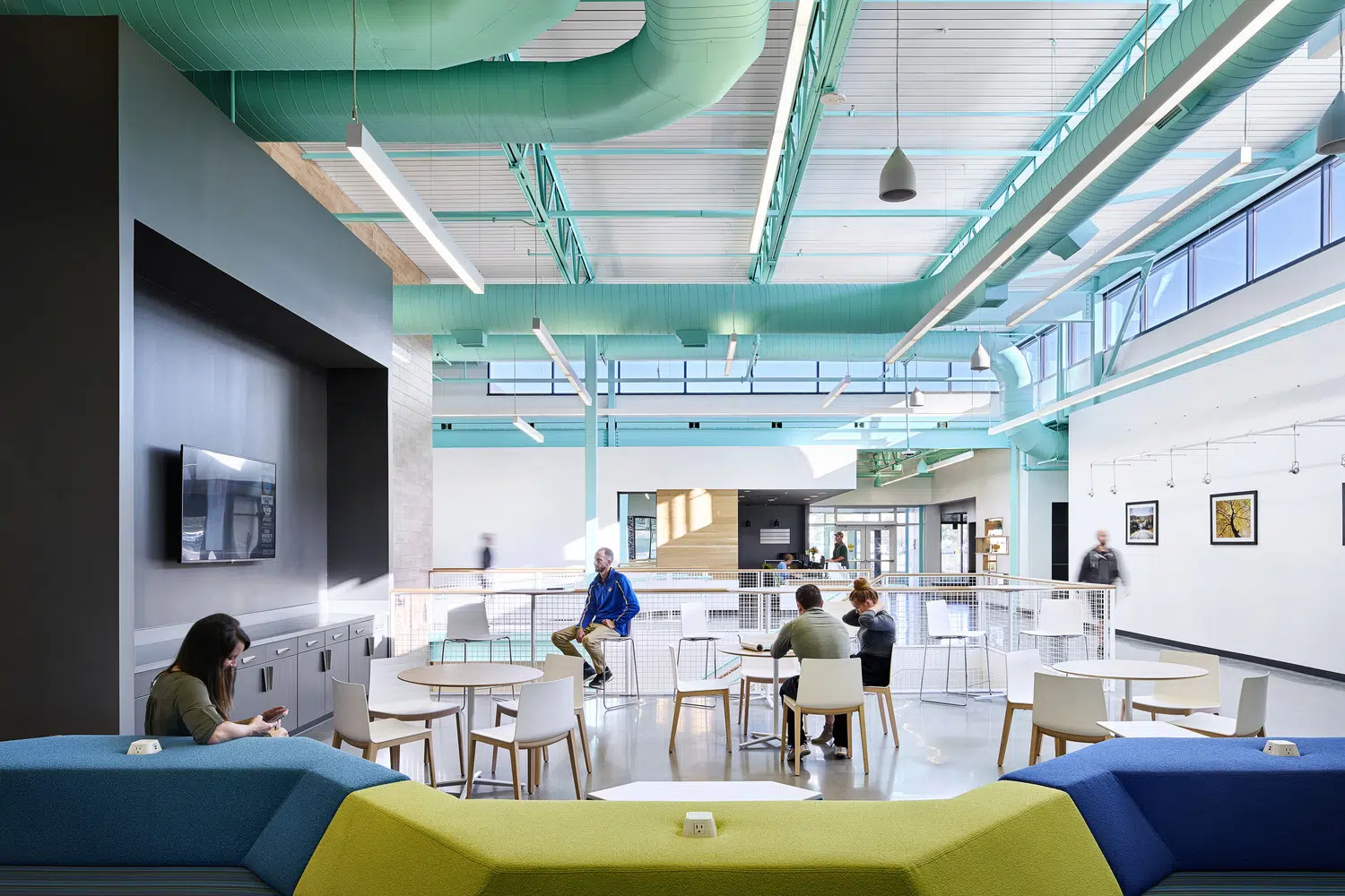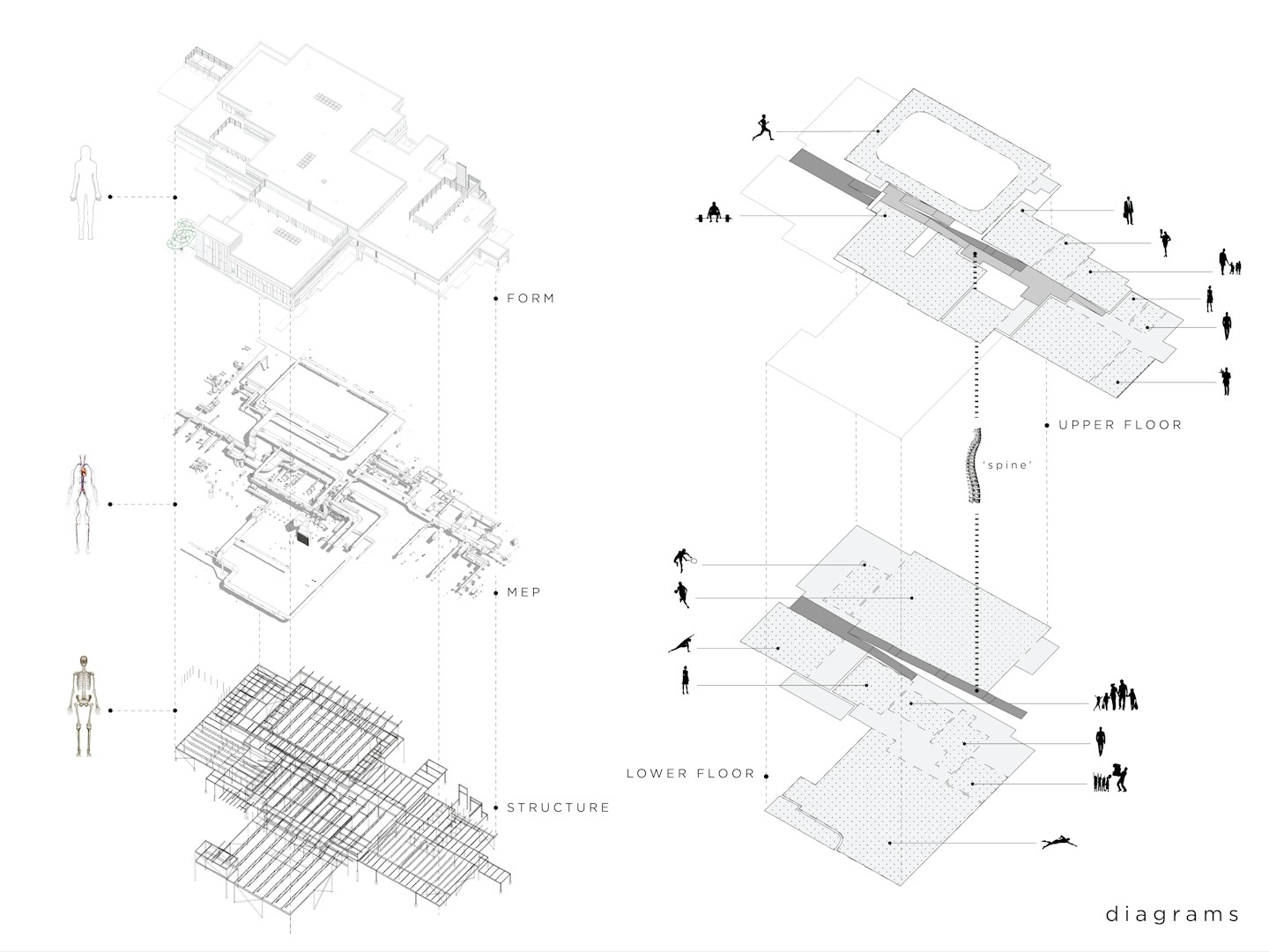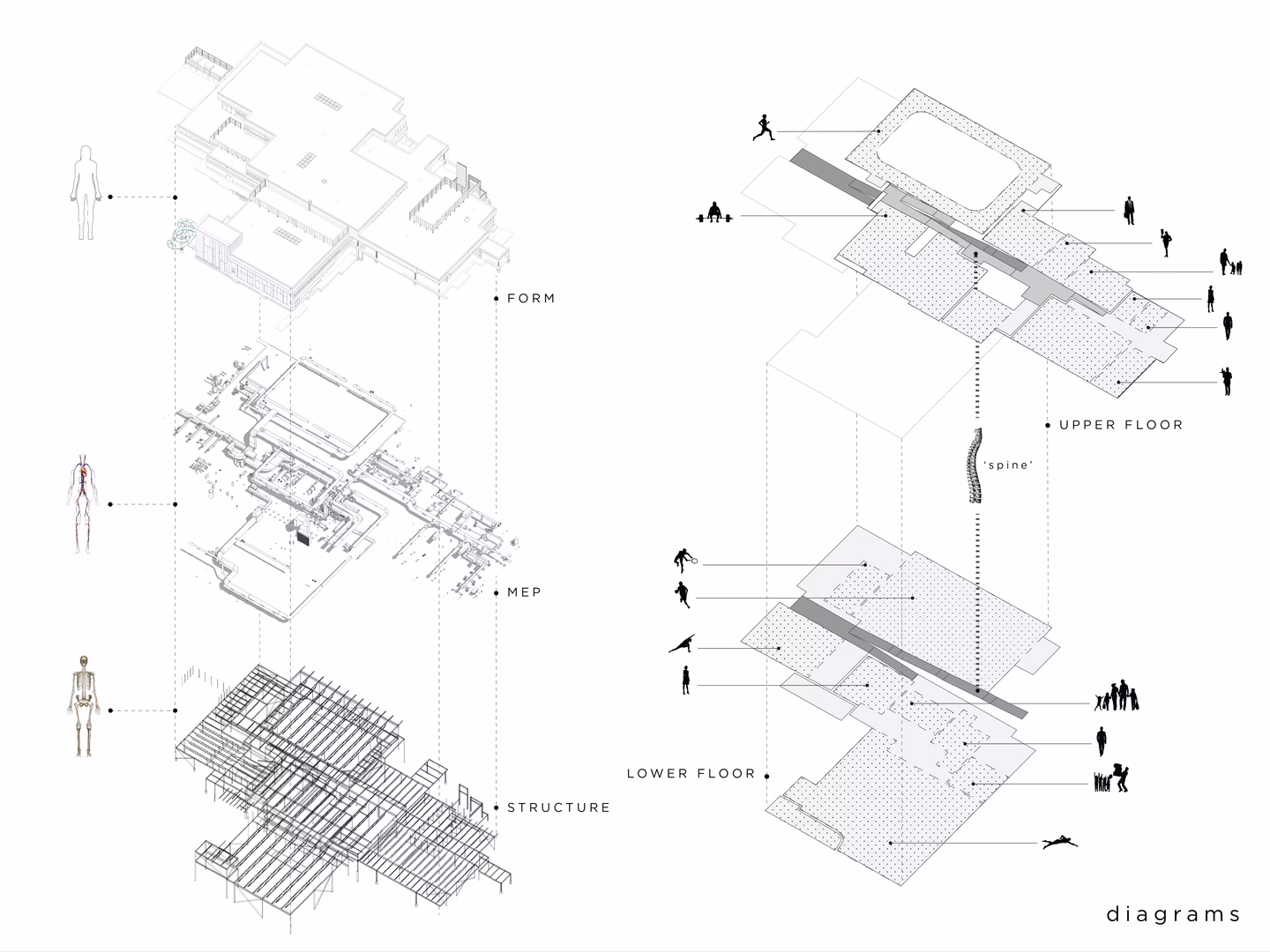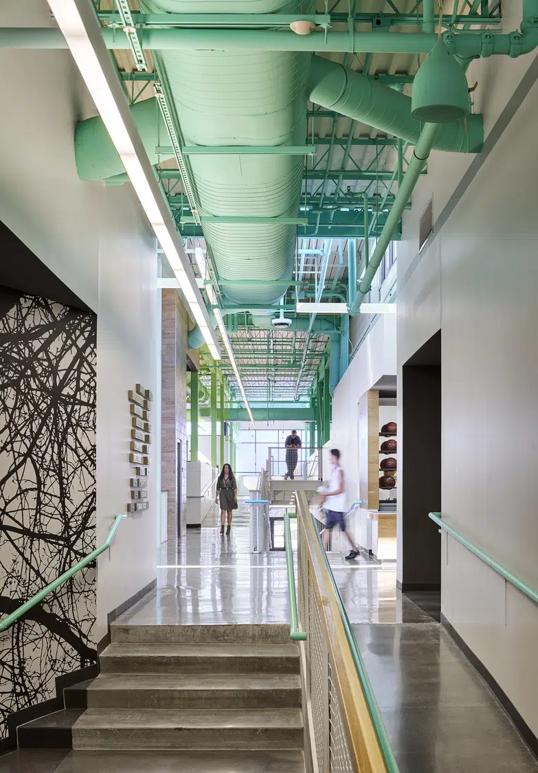 The interior design concept was based on the systems of the human body. Similar to the body’s concealed systems (muscular, skeletal, circulatory, etc.), a building’s concealed systems (mechanical, electrical, plumbing, structural, etc.) are essential to its function. Rather than hide these systems, the decision was made to celebrate their contributions to the building’s architecture and purpose.