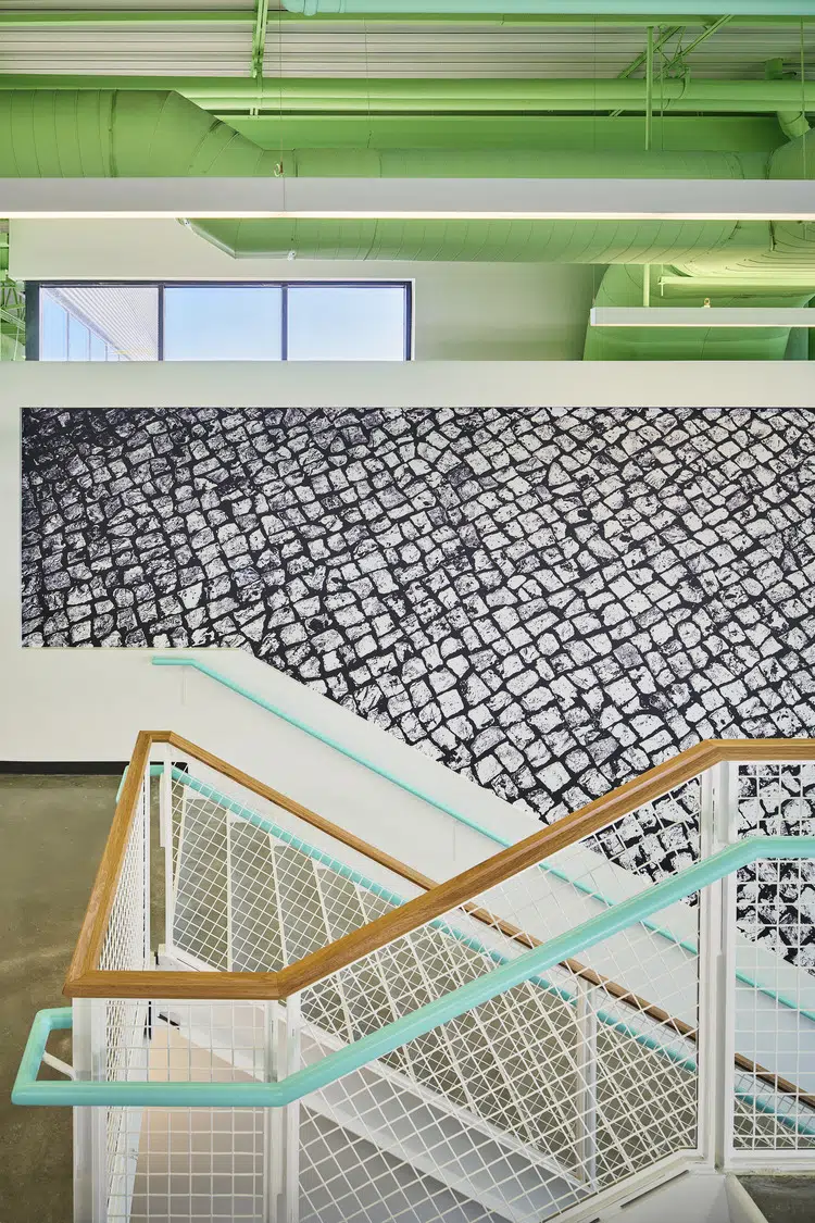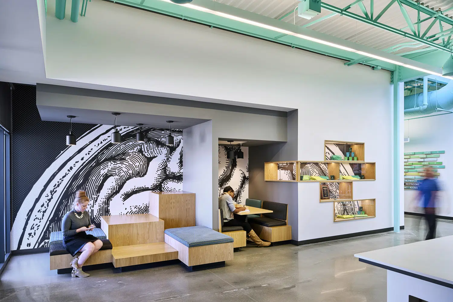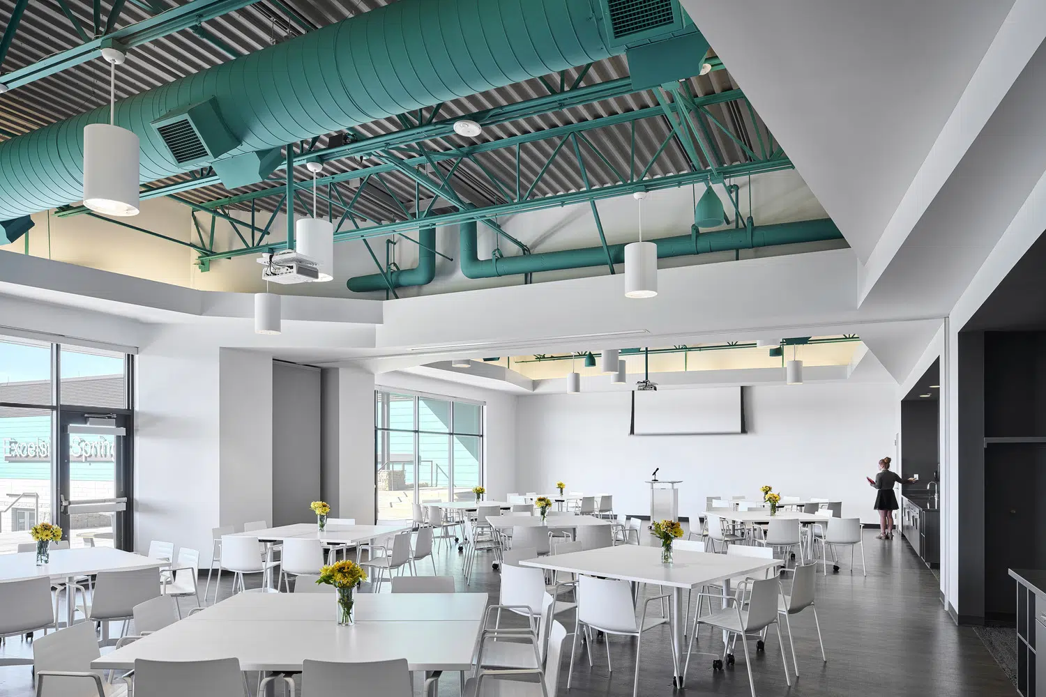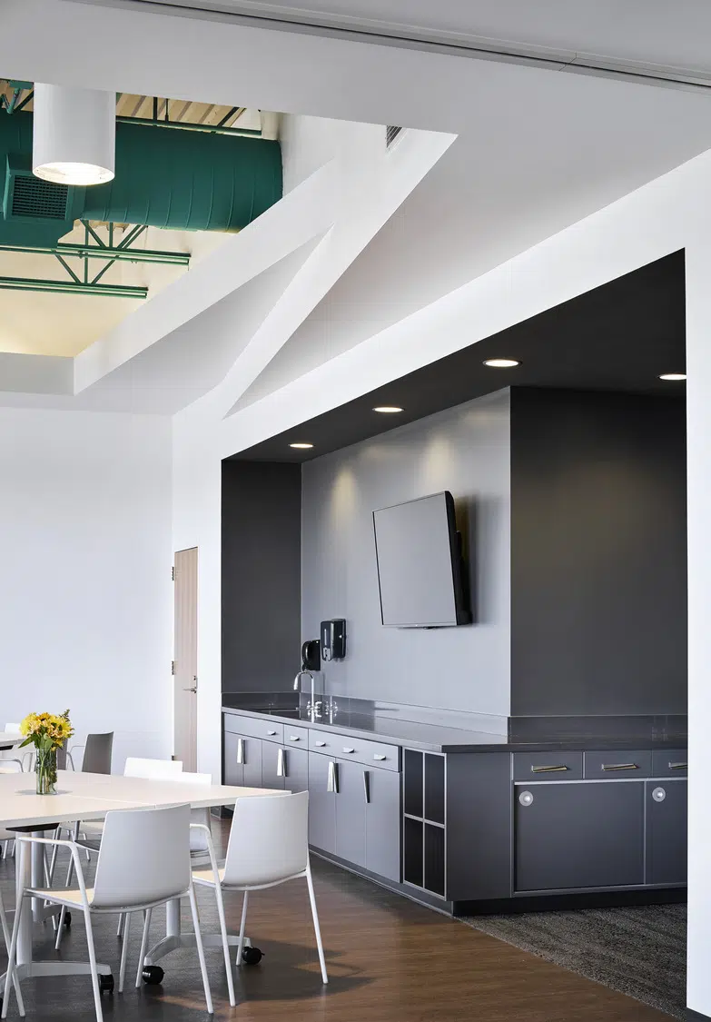 The interior design concept was based on the systems of the human body. Similar to the body’s concealed systems (muscular, skeletal, circulatory, etc.), a building’s concealed systems (mechanical, electrical, plumbing, structural, etc.) are essential to its function. Rather than hide these systems, the decision was made to celebrate their contributions to the building’s architecture and purpose.
