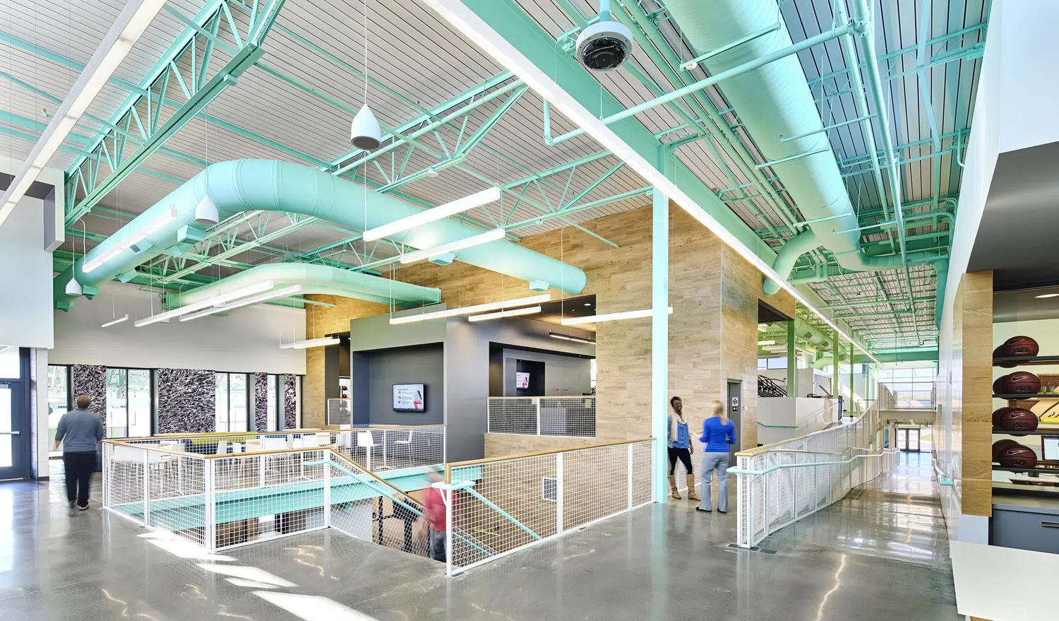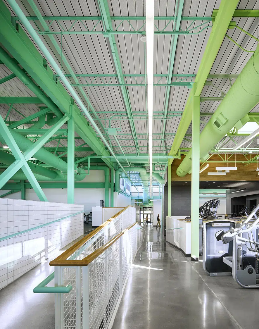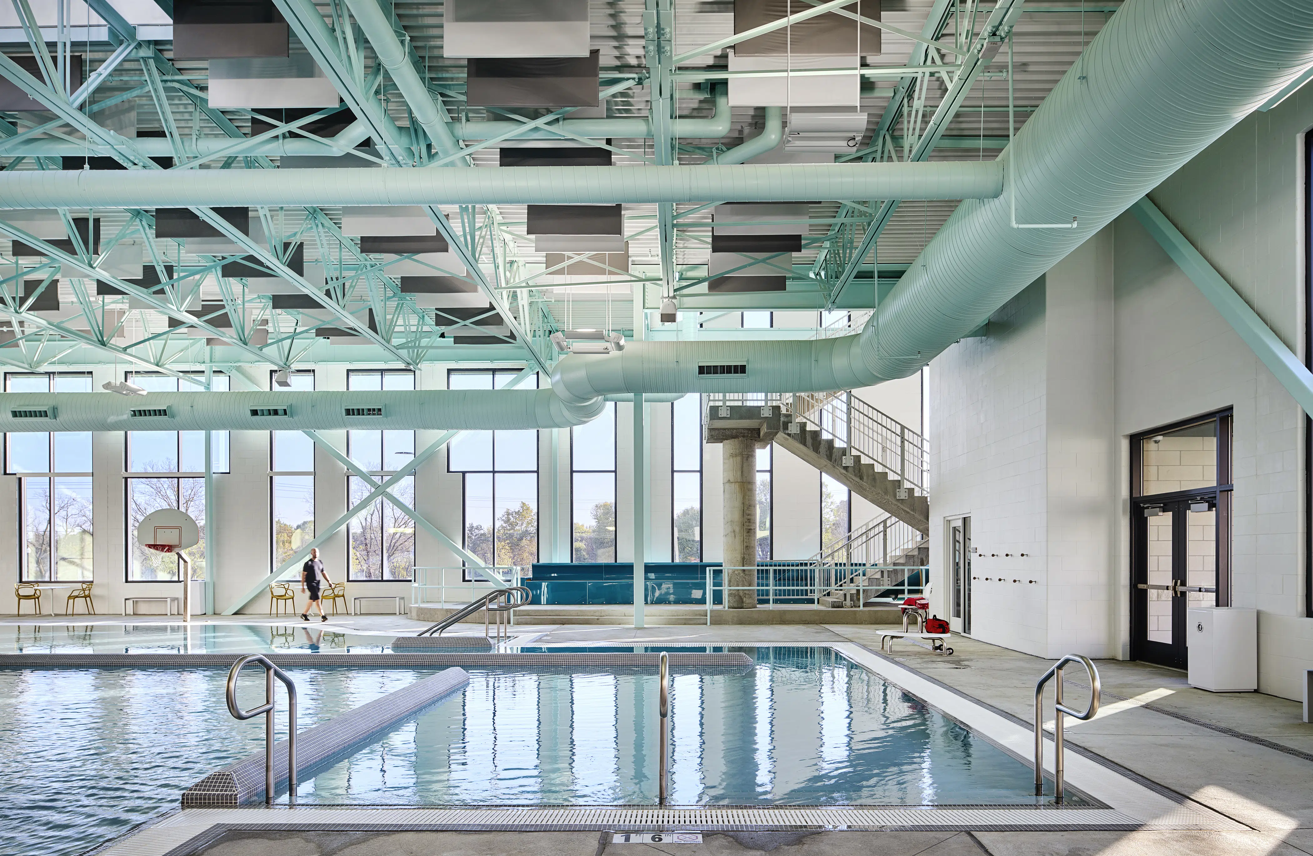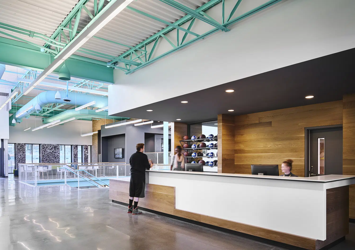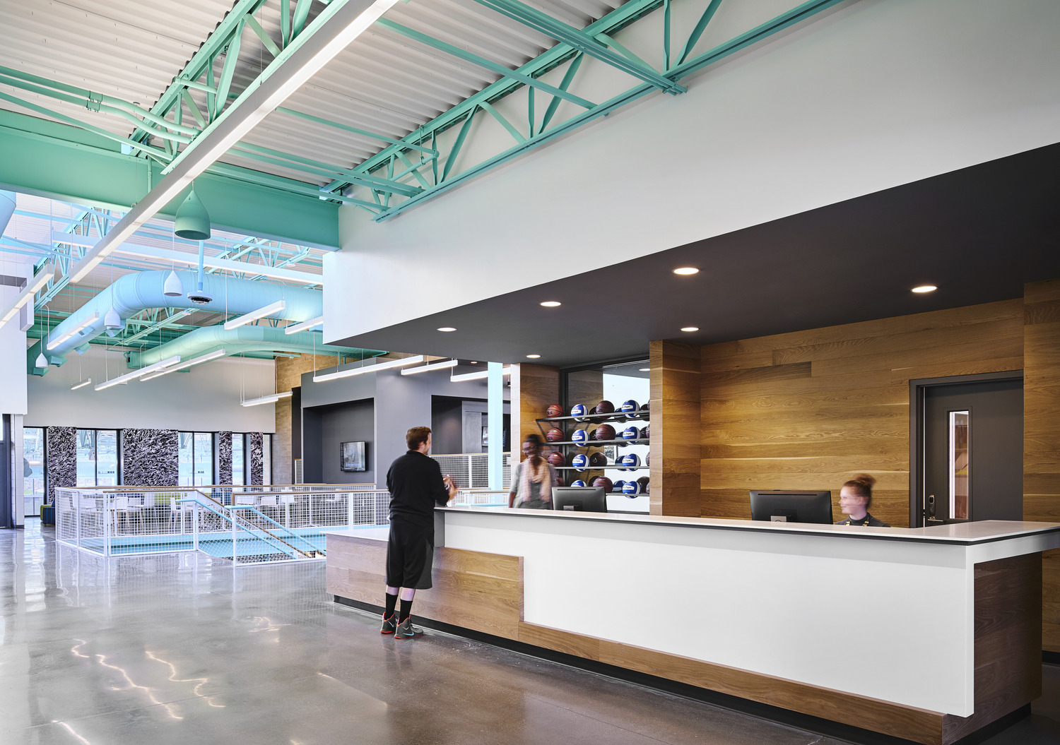 The project required close coordination of mechanical, electrical, plumbing and fire systems with open ceiling architectural concepts to complement the overall concept of the building. Systems provided include high-efficiency mechanical systems with energy recovery, ventilation control and integrated digital controls system. The heating, venting and cooling system for the natatorium satisfies required space temperature while recovering heat from compressors to maintain pool water temperature, humidity-control, uniform air distribution and condensation control in highly corrosive environments. The electrical system includes lighting controls and special direct and indirect lighting in the fitness areas and natatorium.