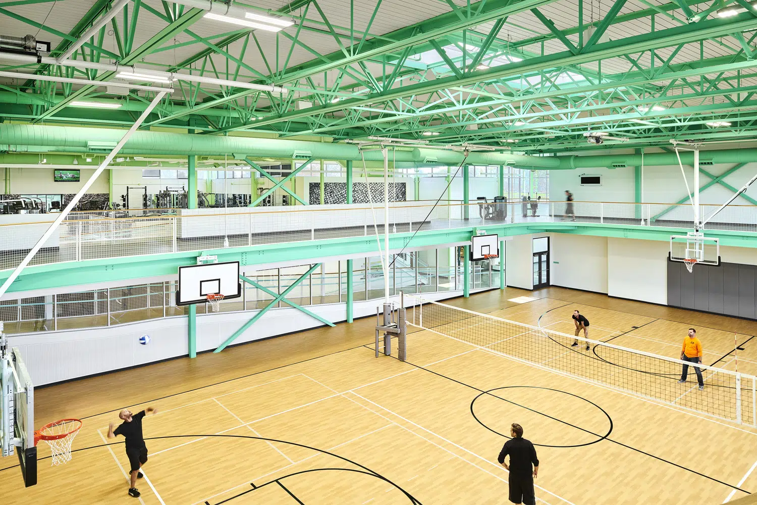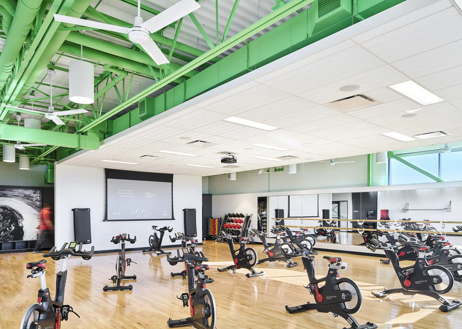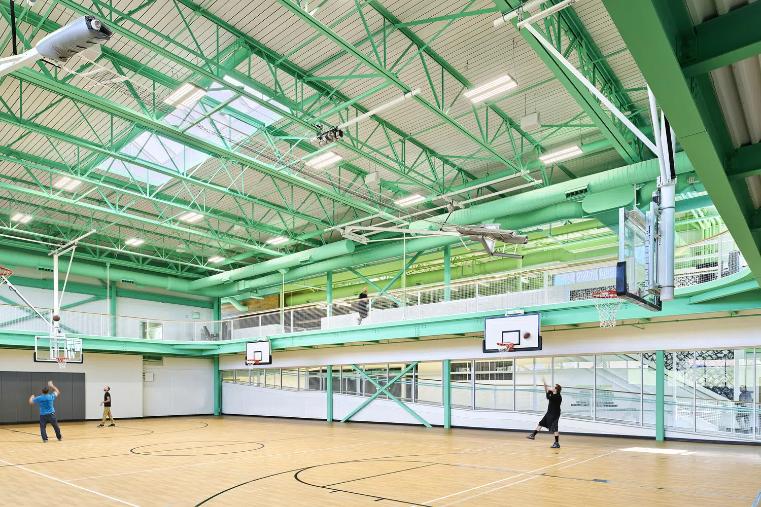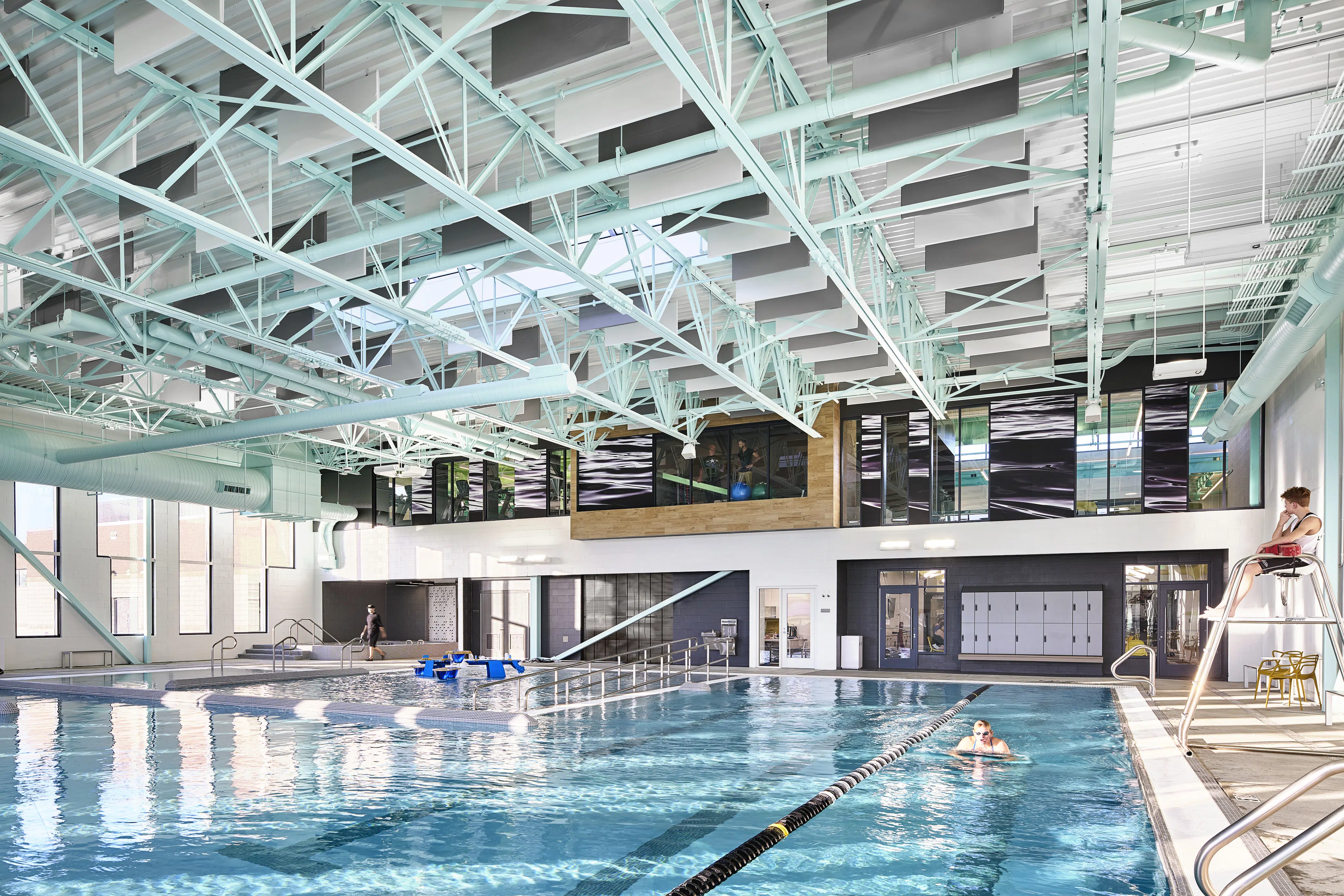 The project required close coordination of mechanical, electrical, plumbing and fire systems with open ceiling architectural concepts to complement the overall concept of the building. Systems provided include high-efficiency mechanical systems with energy recovery, ventilation control and integrated digital controls system. The heating, venting and cooling system for the natatorium satisfies required space temperature while recovering heat from compressors to maintain pool water temperature, humidity-control, uniform air distribution and condensation control in highly corrosive environments. The electrical system includes lighting controls and special direct and indirect lighting in the fitness areas and natatorium.