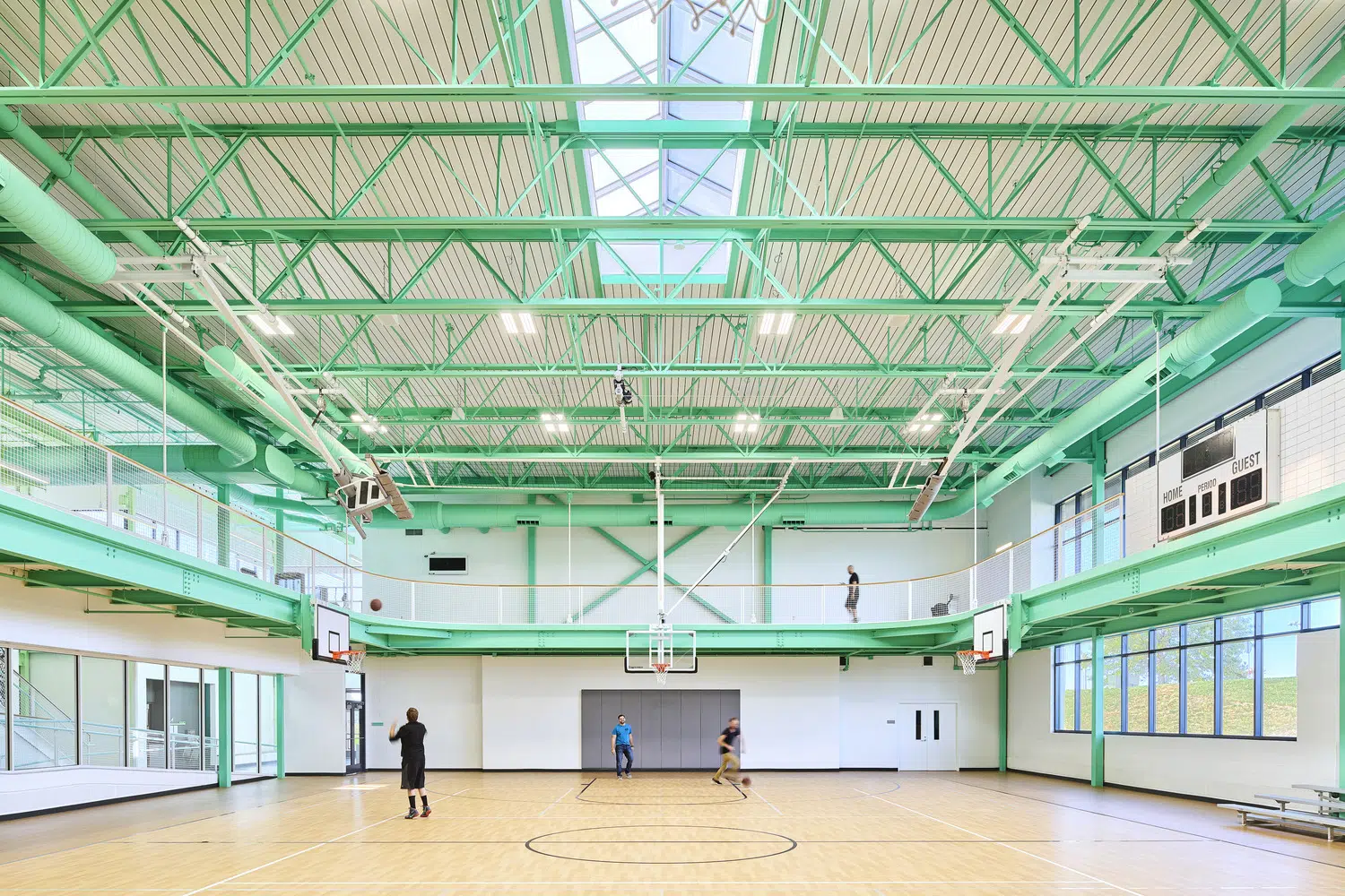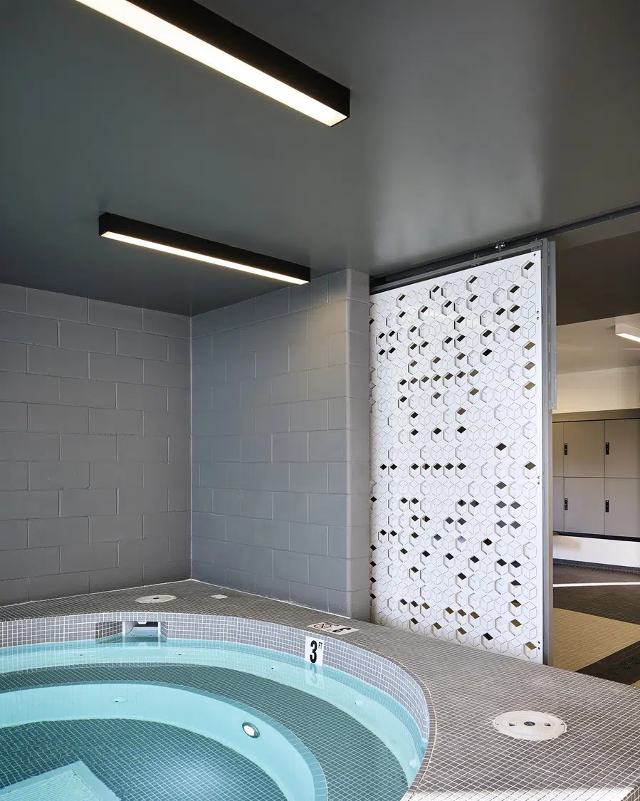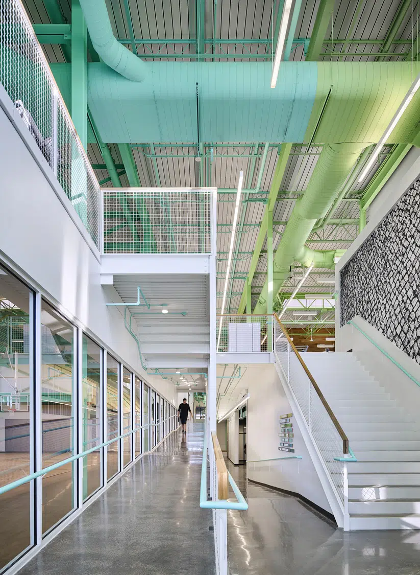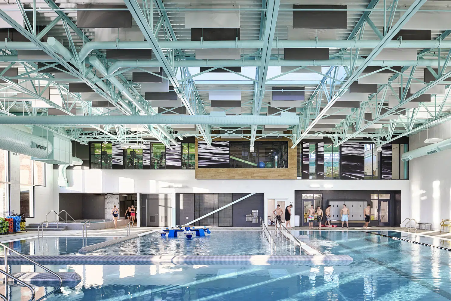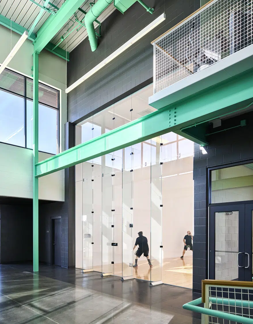 The project required close coordination of mechanical, electrical, plumbing and fire systems with open ceiling architectural concepts to complement the overall concept of the building. Systems provided include high-efficiency mechanical systems with energy recovery, ventilation control and integrated digital controls system. The heating, venting and cooling system for the natatorium satisfies required space temperature while recovering heat from compressors to maintain pool water temperature, humidity-control, uniform air distribution and condensation control in highly corrosive environments. The electrical system includes lighting controls and special direct and indirect lighting in the fitness areas and natatorium.