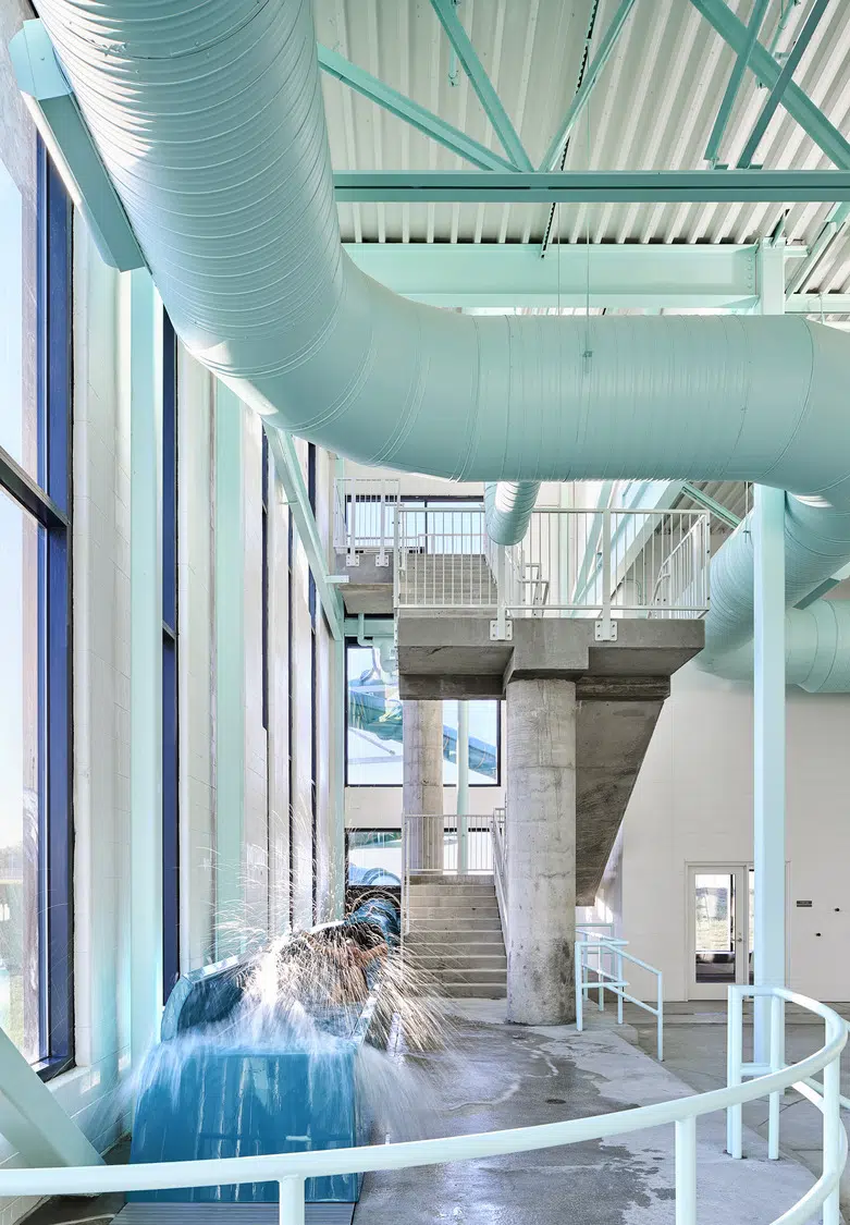 The selected color scheme was inspired by the city’s founding on a natural water spring and historic buildings such as The Elms Hotel and Hall of Waters (now city hall). Each building system and activity zone is assigned a particular color to aid wayfinding in the multi-floored facility.