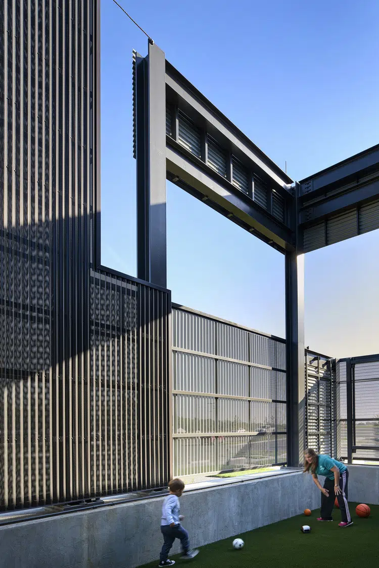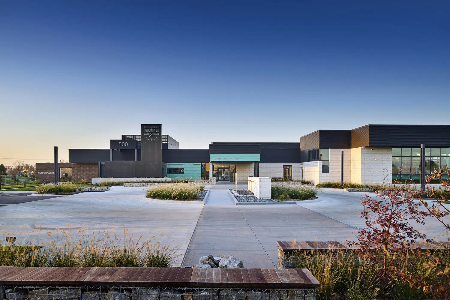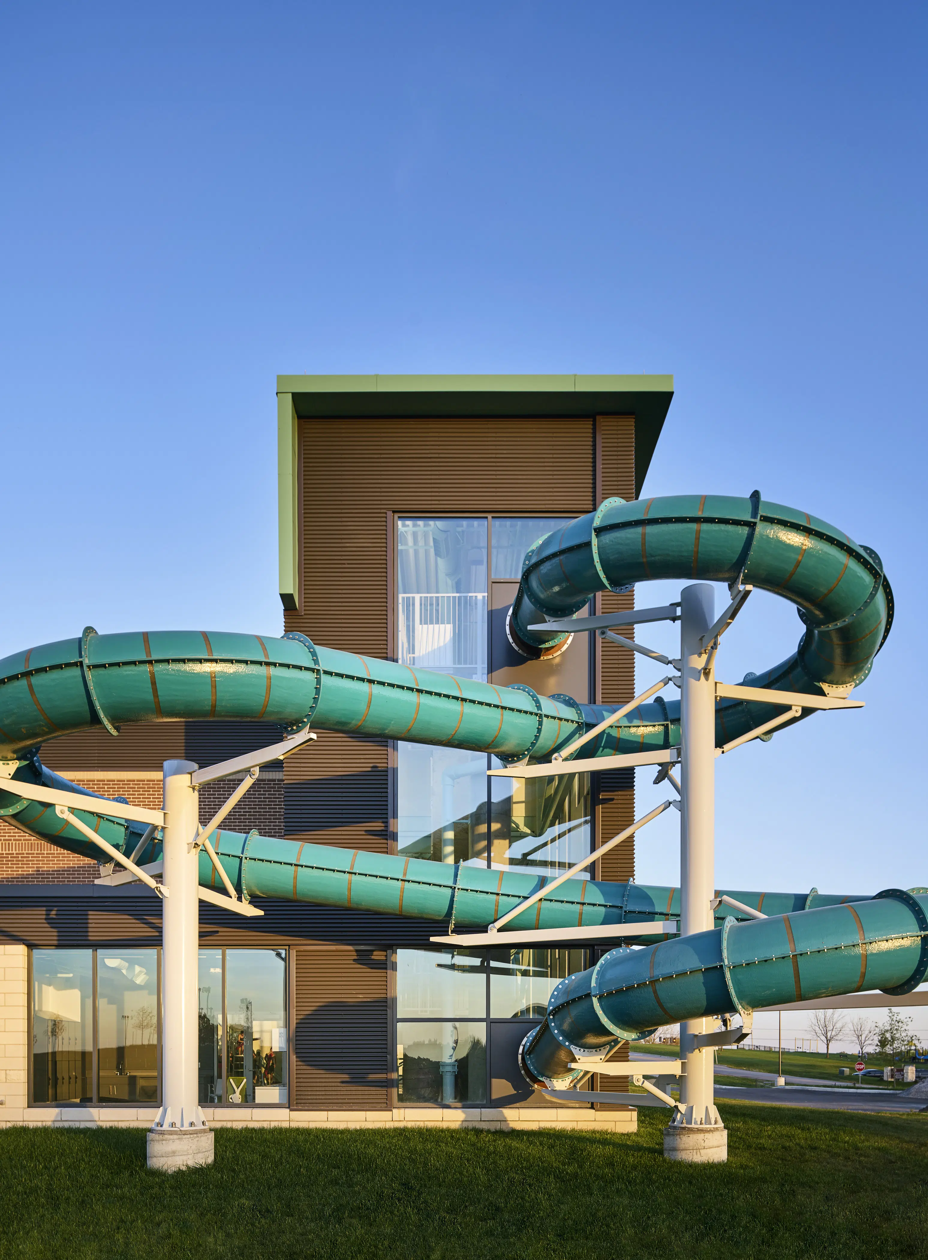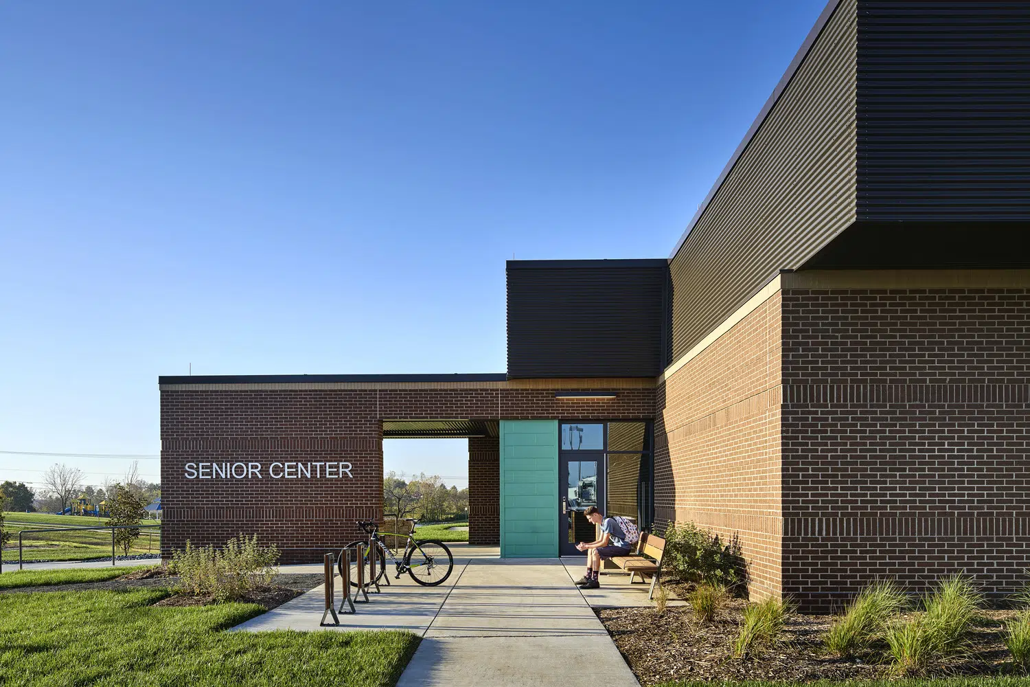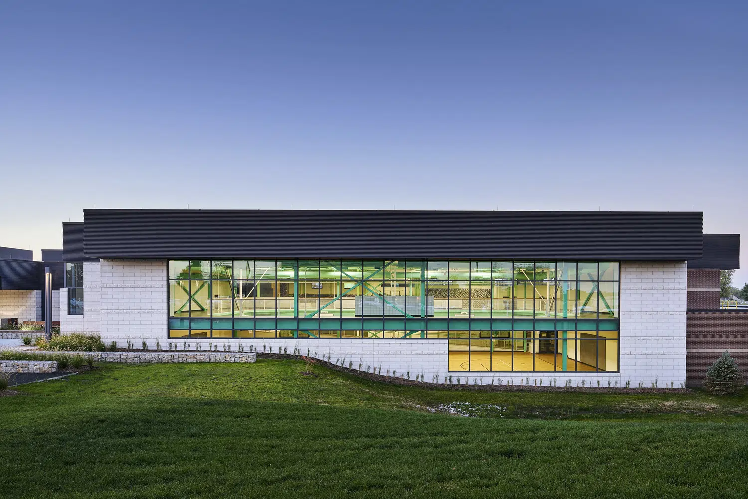 Developed in partnership with the Excelsior Springs School District, the center is located on a highly visible and accessible site shared with a middle school, high school and performing arts center. Design inspiration came from its steeply sloped site and the human body. Rather than flattening the site and building on one level, the topography informs the building’s organization. The programmatic elements step down the steep and undulating hillside, connected by a ramped interior circulation spine connecting spaces within the center and acting as an extended exercise path.