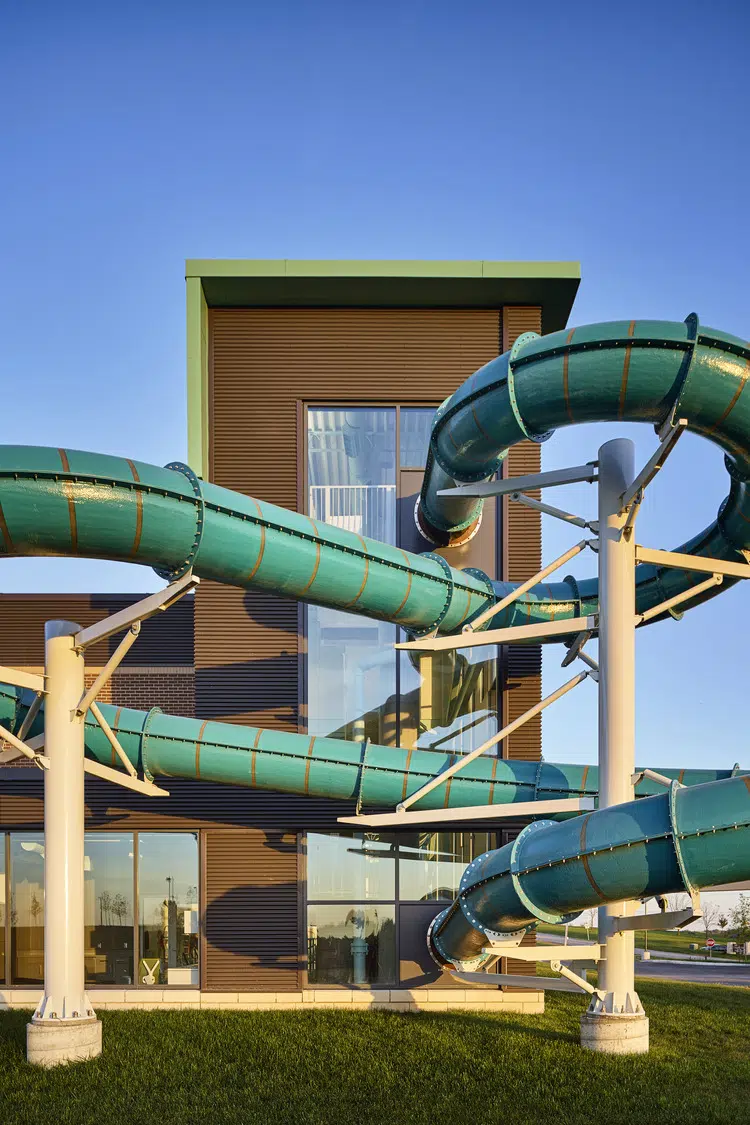 The aquatics center includes over 10,000 square feet of amenities, including a leisure pool with exercise lap lanes, water slide and play features.