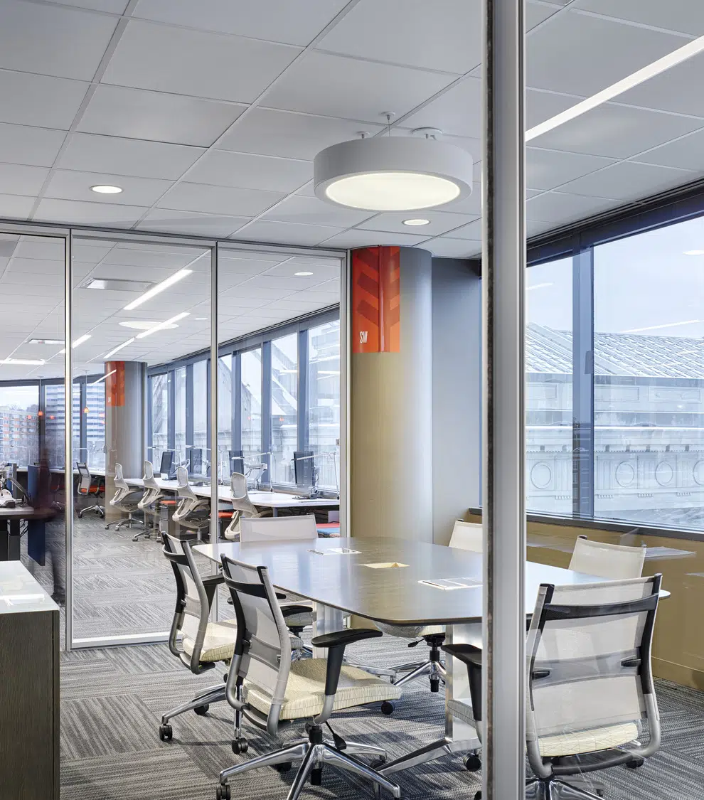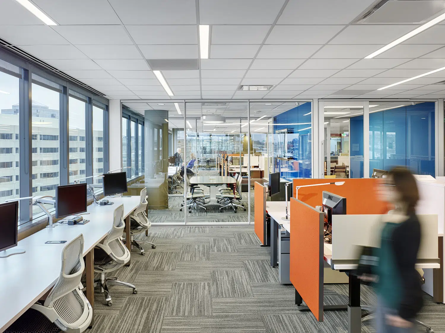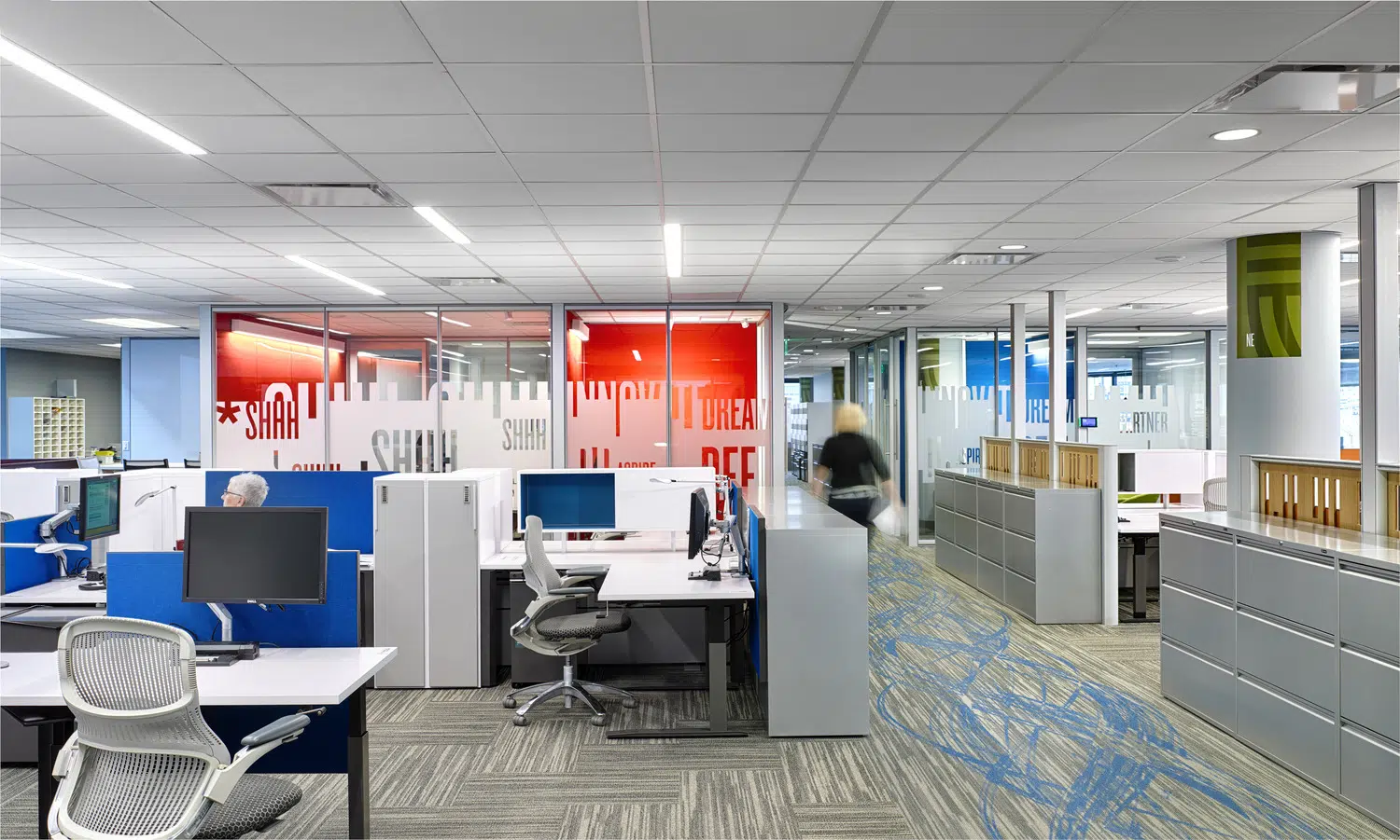 The team also developed RFQ packages for the procurement of new furniture and finishes and oversaw the installation of all FF&E components. SFS developed a final FF&E plan that incorporated both new and existing furniture, coordinated finishes with furniture, developed RFQ packages for the procurement of new furniture (workstations, desk chairs, conference and ancillary pieces) and finishes, and oversaw installation of FF&E components.