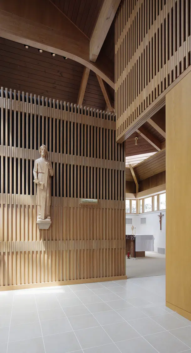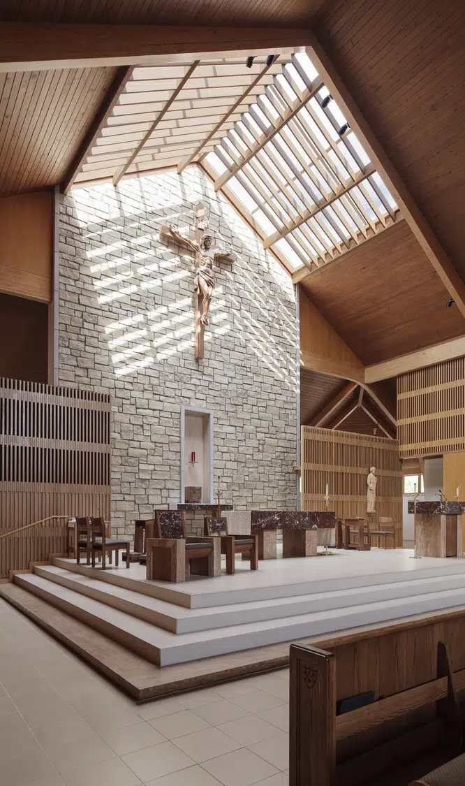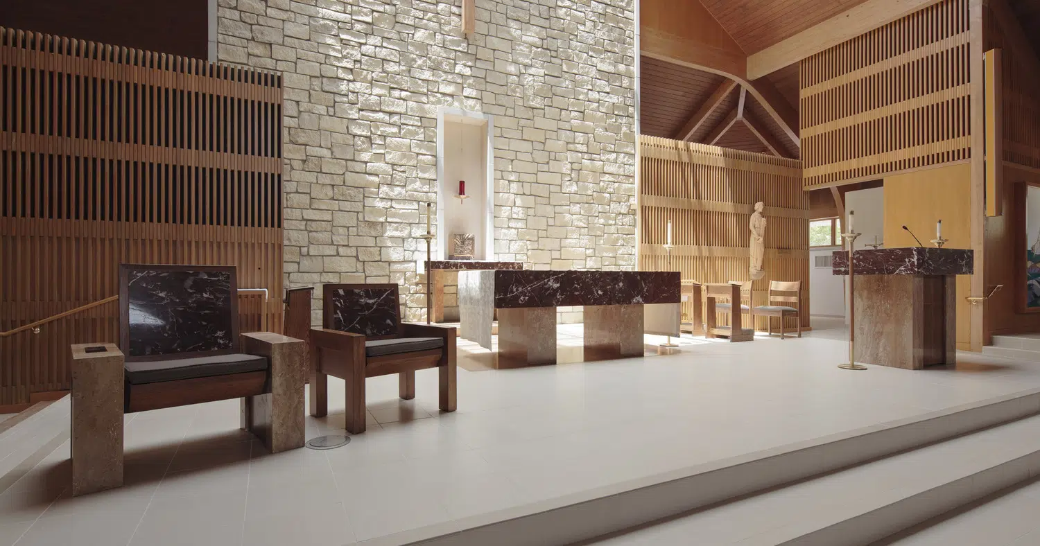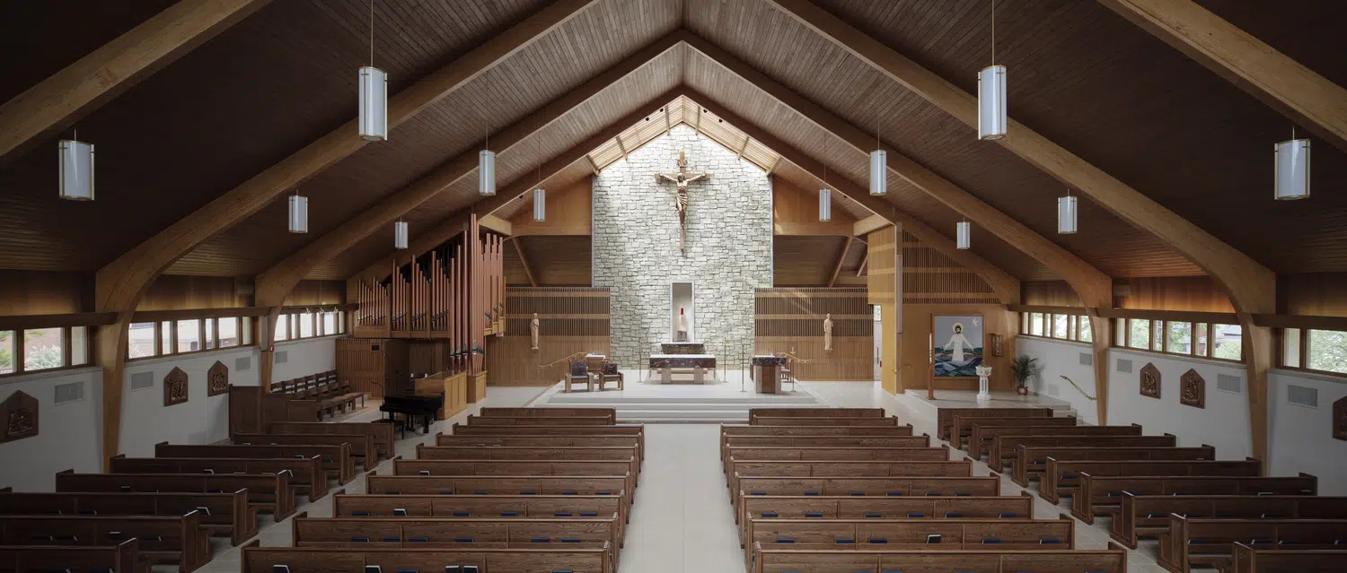 The renovation of Immaculate Conception Church supports the sacred rituals of the Catholic Church. The original Belgian red marble altar and tabernacle shelf were left in place while the rest of the sanctuary floor was raised to the level of the altar. A new ambo and presider’s and deacon’s chairs were designed utilizing the same red marble of the altar to give a new sense of unity to all sanctuary furnishings. A new stone wall matching the stone of the exterior of the church was placed at the back of the sanctuary to frame the tabernacle niche and for the installation of a new 14-foot tall crucifix. A newly designed skylight was installed over the sanctuary highlighting the stone wall and leading one’s eye to the altar and tabernacle. Inspired Artisans of Milwaukee implemented the design of the crucifix and new stations of the cross. New pews featuring the Carmelite shield were crafted in Pennsylvania Dutch country.