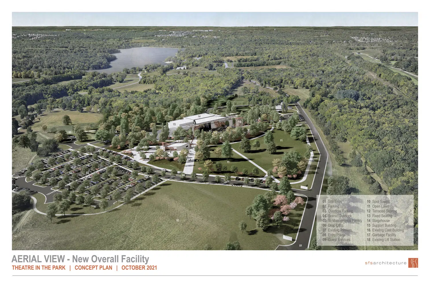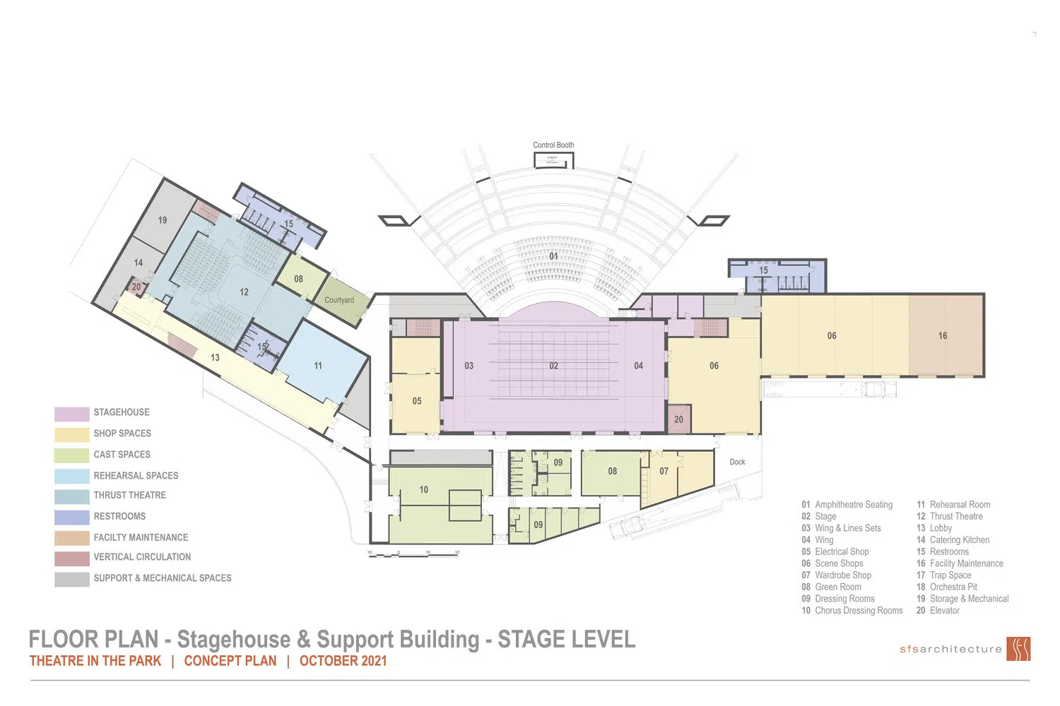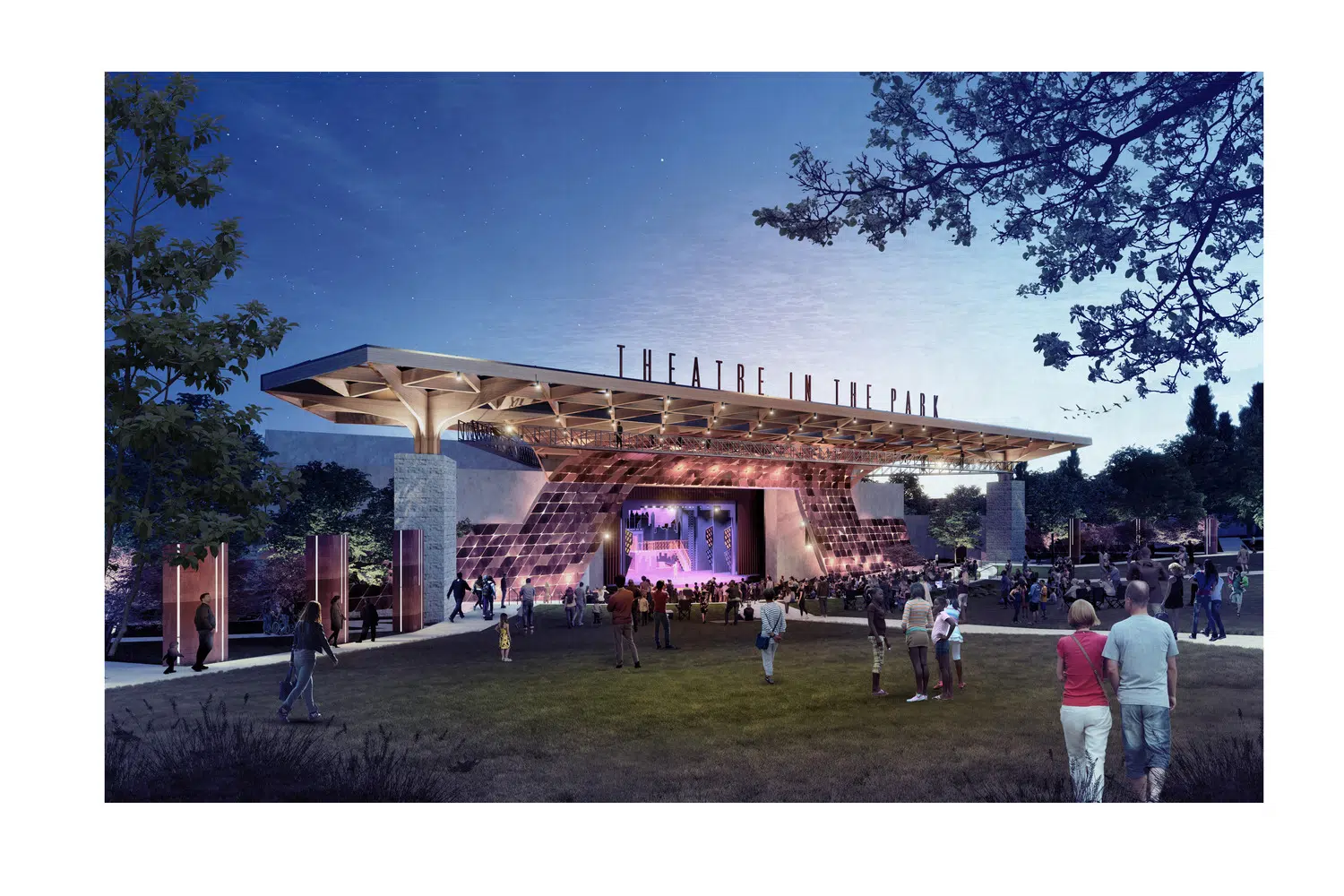A master plan developed by SFS Architecture for Johnson County’s acclaimed Theatre in the Park will modernize the outdoor performing arts venue. The $26 million renovation will substantially increase the stage from 19,000 square feet to 33,000 square feet. An overhang and enclosed stage box will enclose the stage and a limited number of audience members, making it possible to offer shows for as many as 500 people in rainy weather. Expansions also include a mix of fixed seating, terraced lawn seating and open lawn seating, and a new entrance.