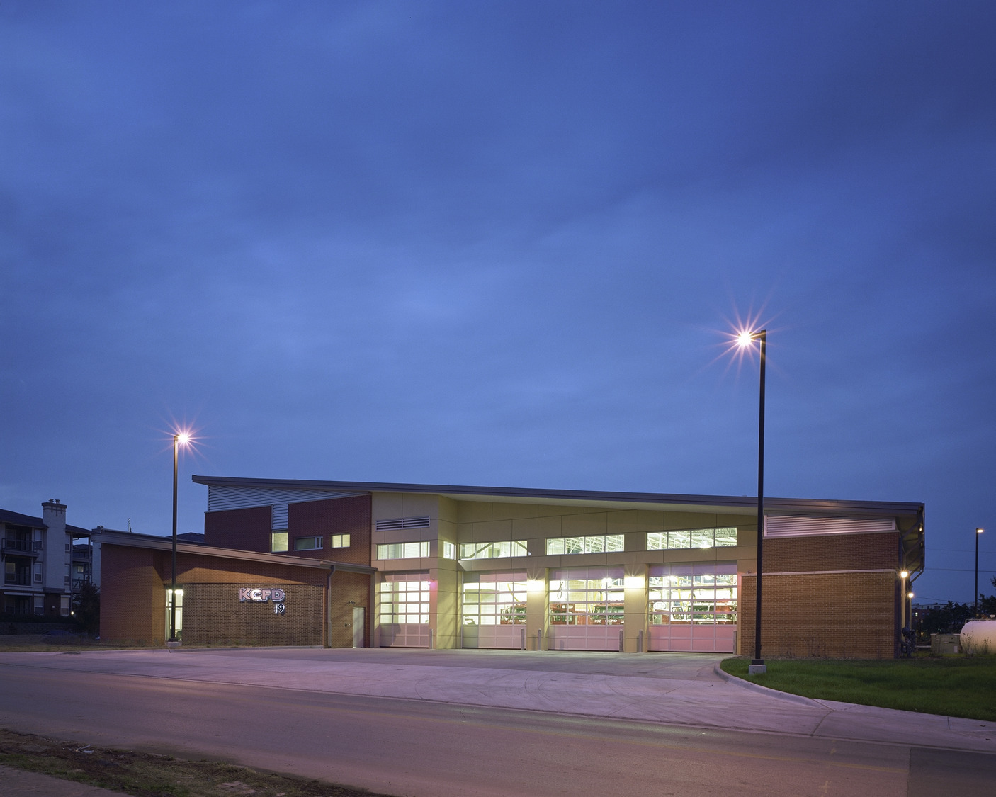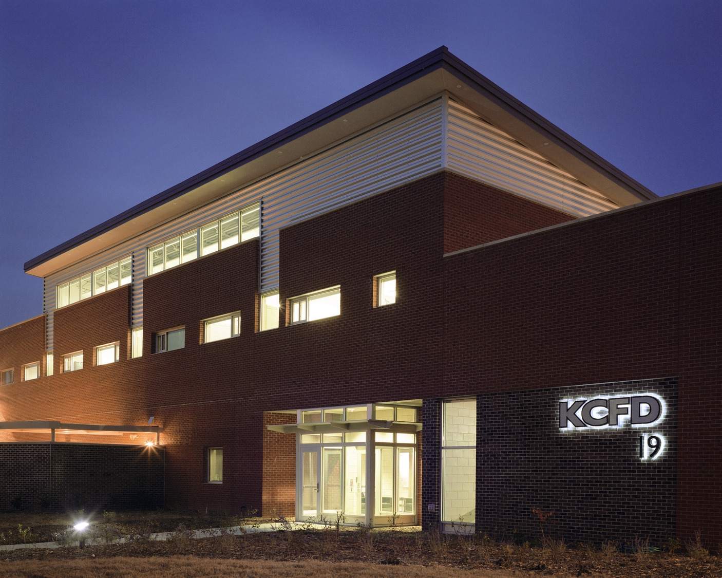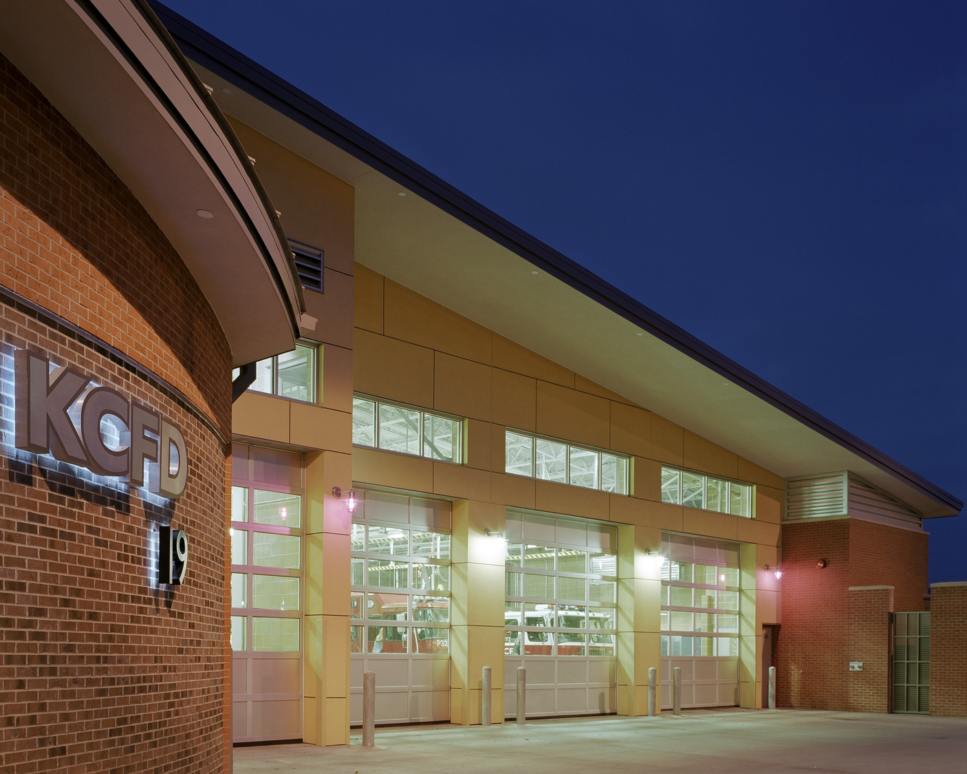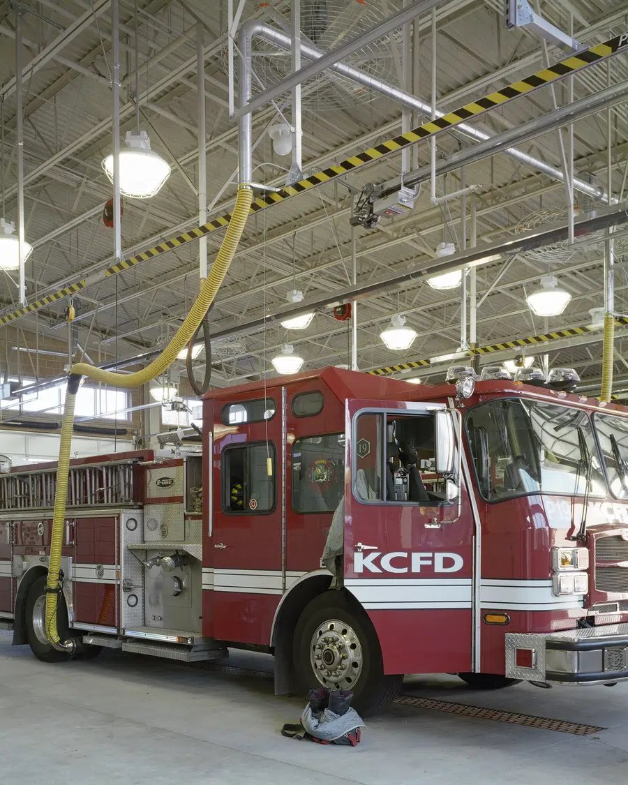 The Kansas City, Missouri Fire Department’s two-story Station 19 encompasses the important elements of fire station design: quickness of response, separation and privacy of its users, functional relationships, and reduced maintenance through use of durable materials. Direct routes of access are available from the heavy use areas of the living quarters, kitchen, dining and weight room to keep firefighters in close contact with the apparatus bays at all times. Separation and privacy for firefighters is accomplished by individual sleeping arrangements, restrooms and showers. Windows into the living quarters provide ample natural light and ventilation while minimizing views into the station.