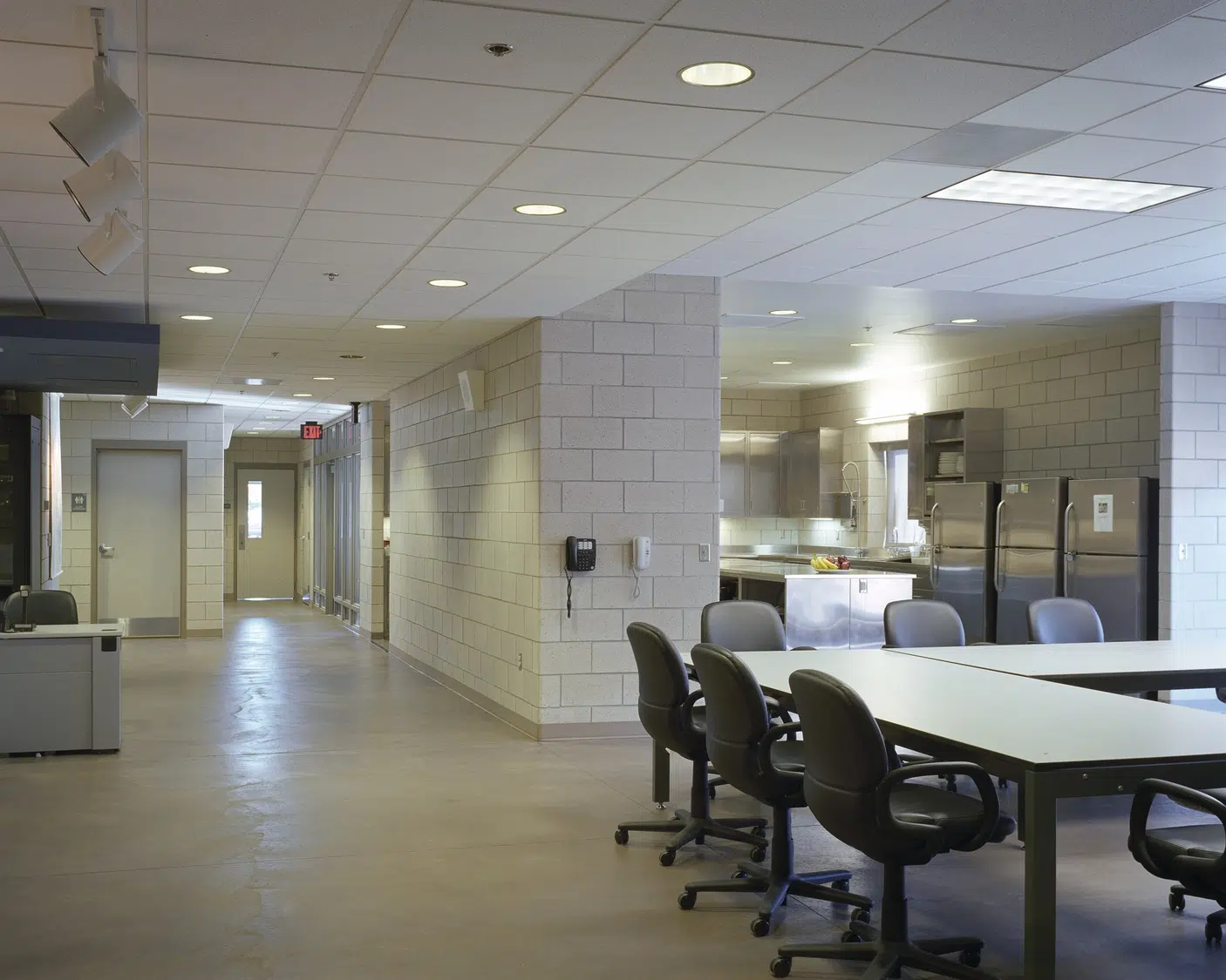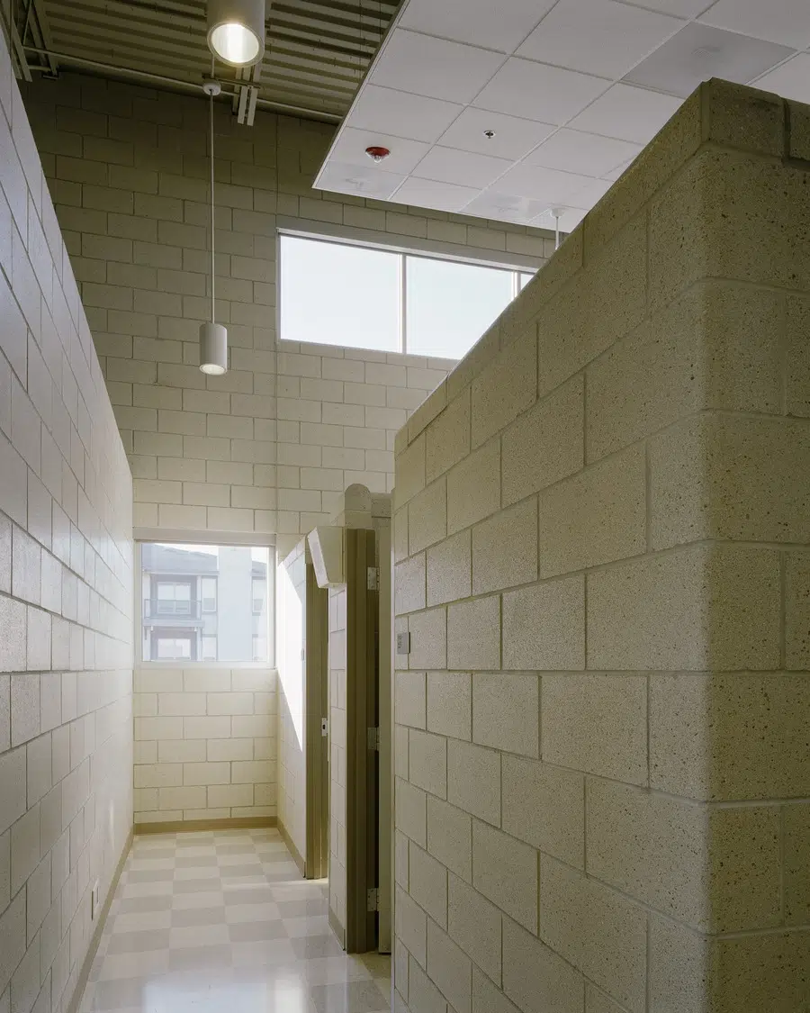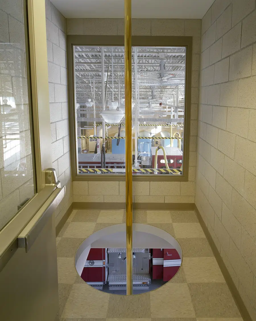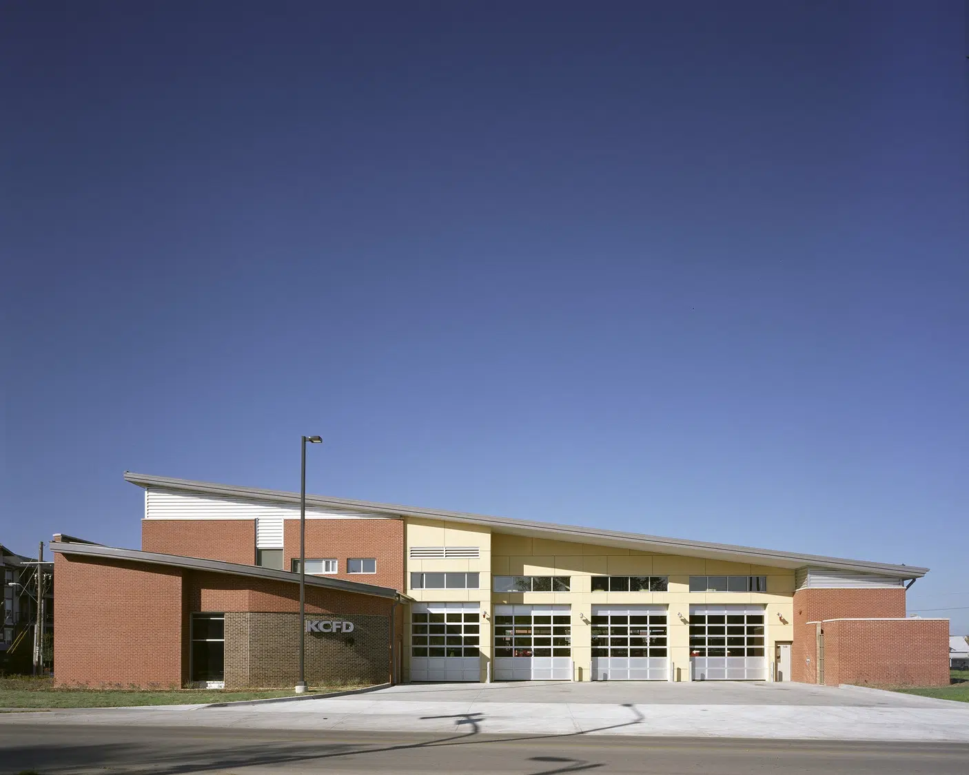 The Kansas City, Missouri Fire Department’s two-story Station 19 encompasses the important elements of fire station design: quickness of response, separation and privacy of its users, functional relationships, and reduced maintenance through use of durable materials. Direct routes of access are available from the heavy use areas of the living quarters, kitchen, dining and weight room to keep firefighters in close contact with the apparatus bays at all times. Separation and privacy for firefighters is accomplished by individual sleeping arrangements, restrooms and showers. Windows into the living quarters provide ample natural light and ventilation while minimizing views into the station.