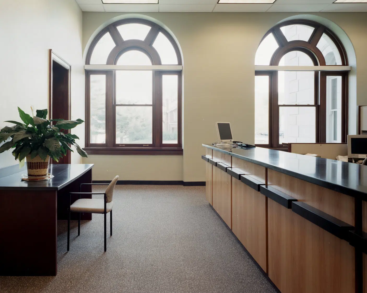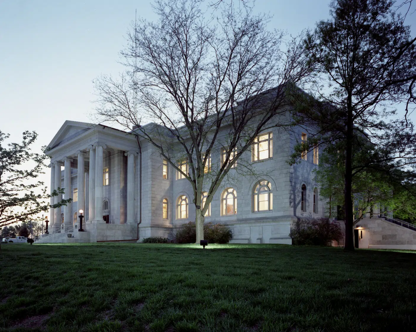 The renovation was completed in four phases to minimize disruption of continuing operations and accommodate availability of funds. Exterior work included replacing the non-original metal-clad windows, repointing and resetting the limestone veneer at the entrances, repairing and repainting the soffits and trim, installing new downspouts, and renovating the handicap accessible entrance.