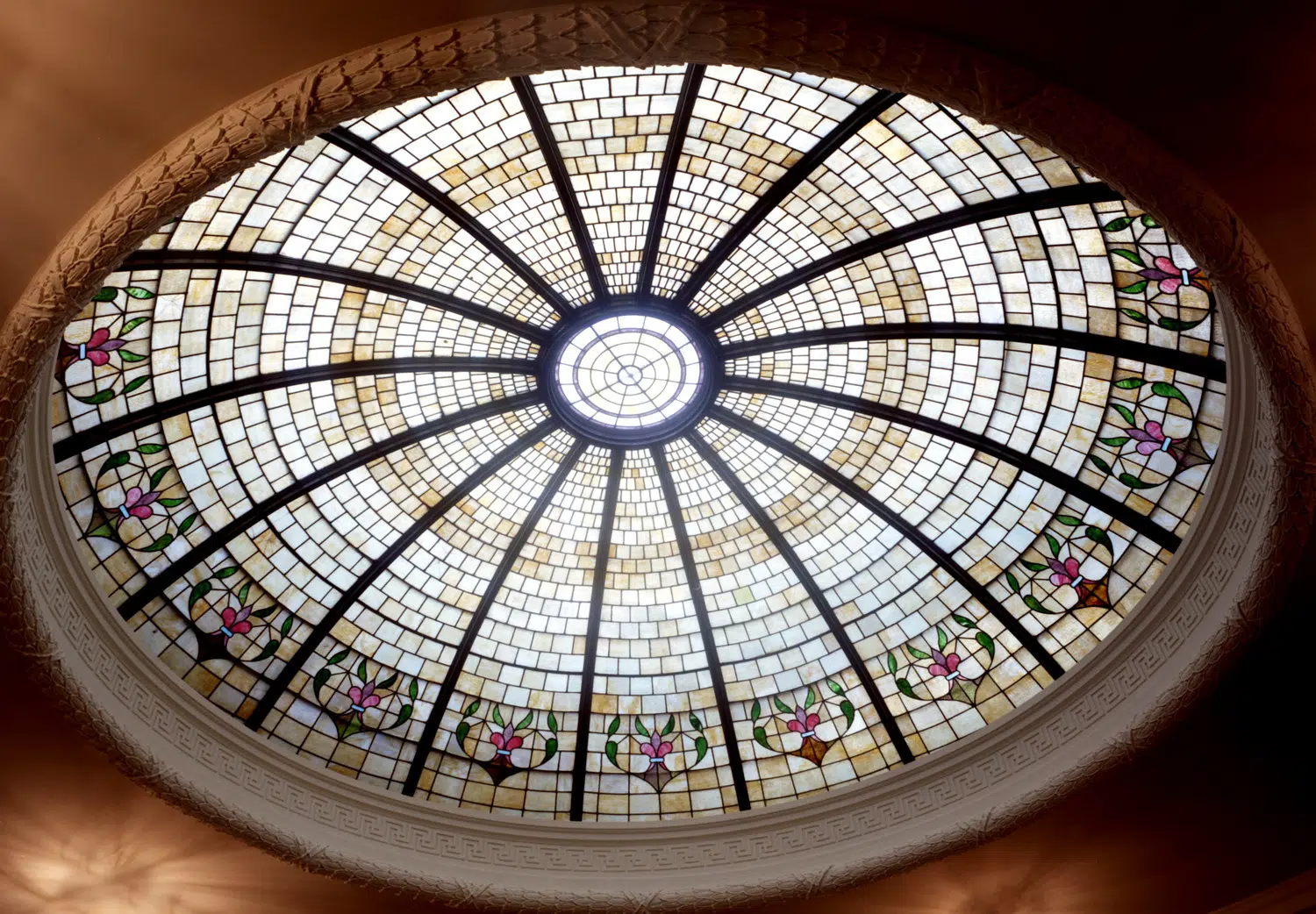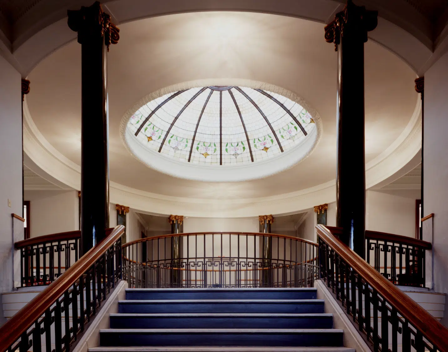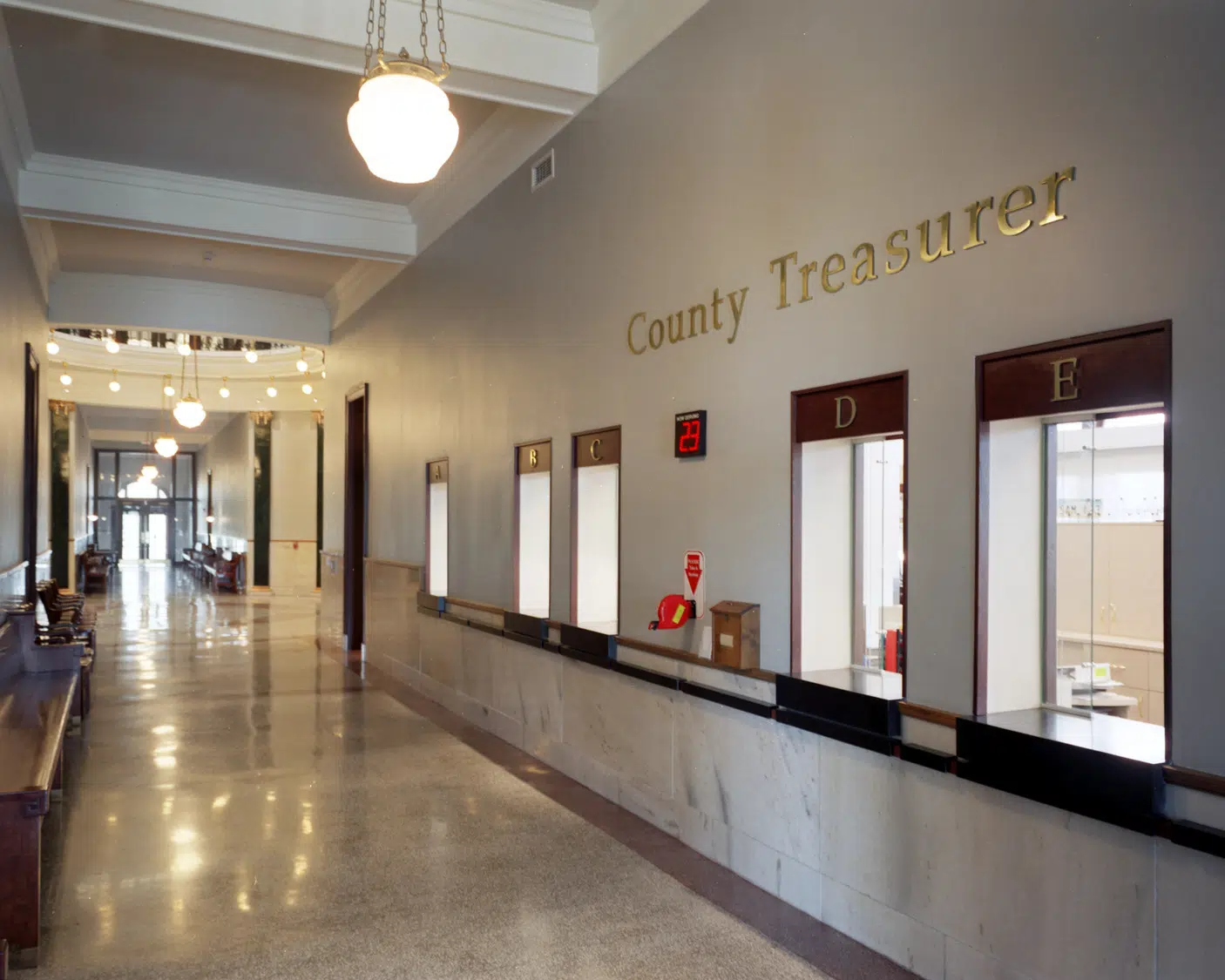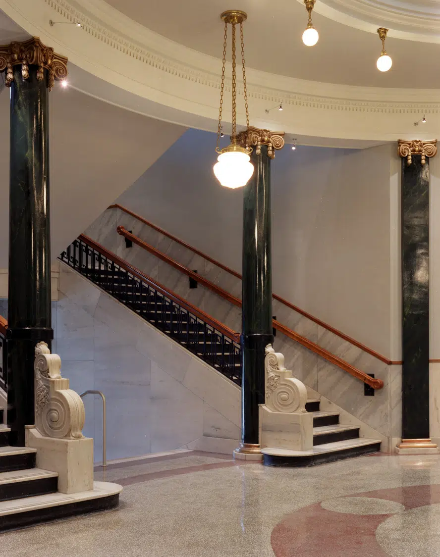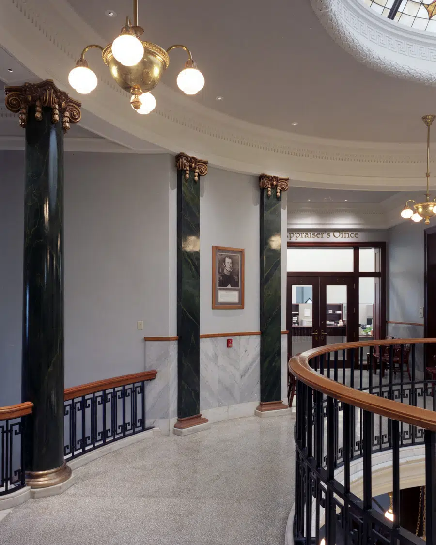 The central rotunda, a distinguishing interior feature, underwent the most stunning transformation and now boasts a newly cleaned stained glass dome, painted walls and wrought-iron handrails, refinished doors and trim, and cleaned and repaired terrazzo flooring, marble stair treads, and wainscot. Other interior work included renovations to both the public spaces and the offices on all floors, including new HVAC, plumbing and electrical systems; upgraded restrooms and elevator; restoration of public corridors and adaptive reuse of courtrooms and other spaces for County Administration.