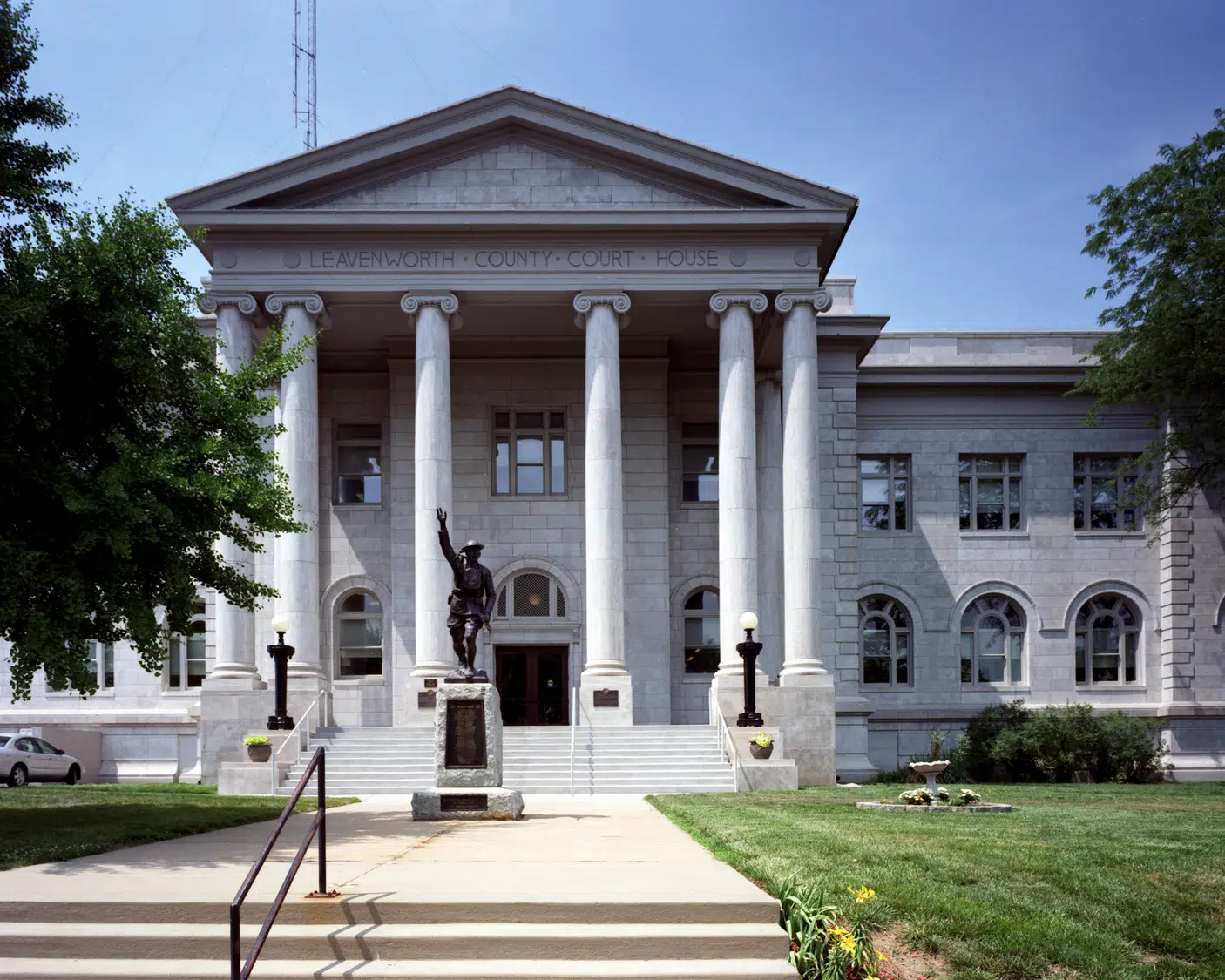 The historic Leavenworth County Courthouse, a grand Classical Revival style building, was completed in 1913 and built upon the foundation of an old Second Empire-style courthouse destroyed by fire on March 22, 1911. According to the building’s 2002 National Register of Historic Places nomination, the Leavenworth County Courthouse is “one of a few county courthouses to have a ‘pure,’ Greek-inspired, Classical Revival treatment that incorporates a projecting pedimented portico supported by classical columns on its primary façades.” In addition, the building is “architecturally significant for the retention of its original floor plan configuration and hierarchy of space.”