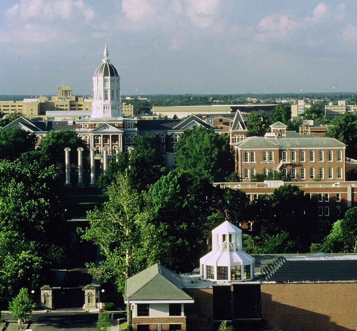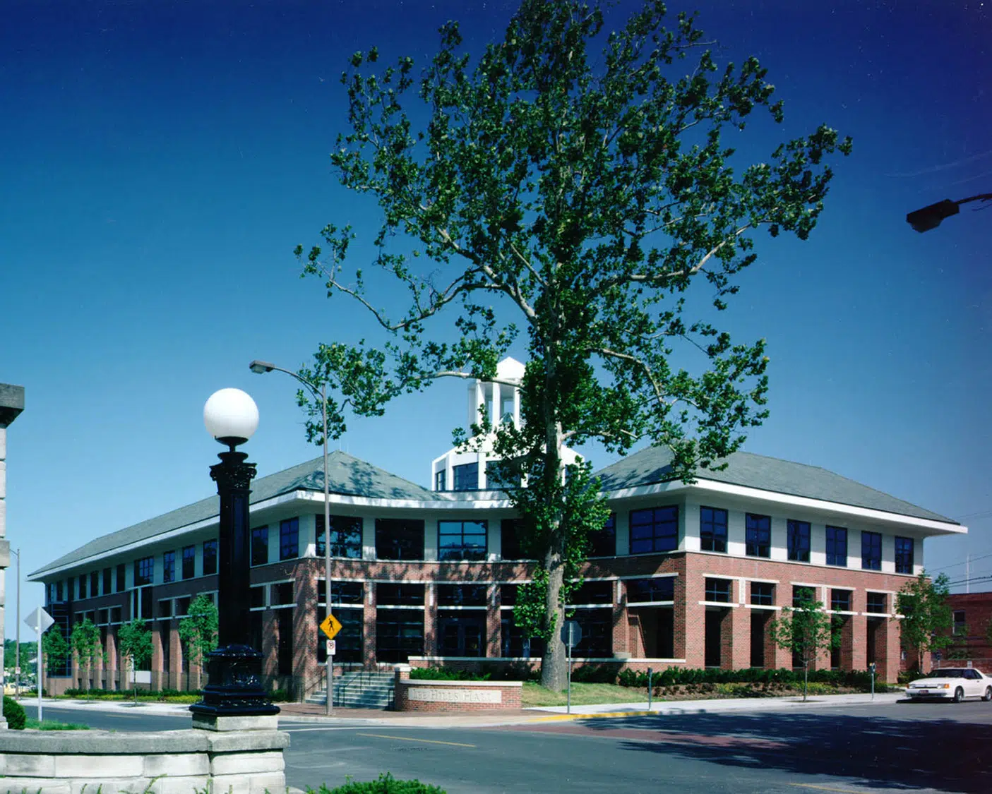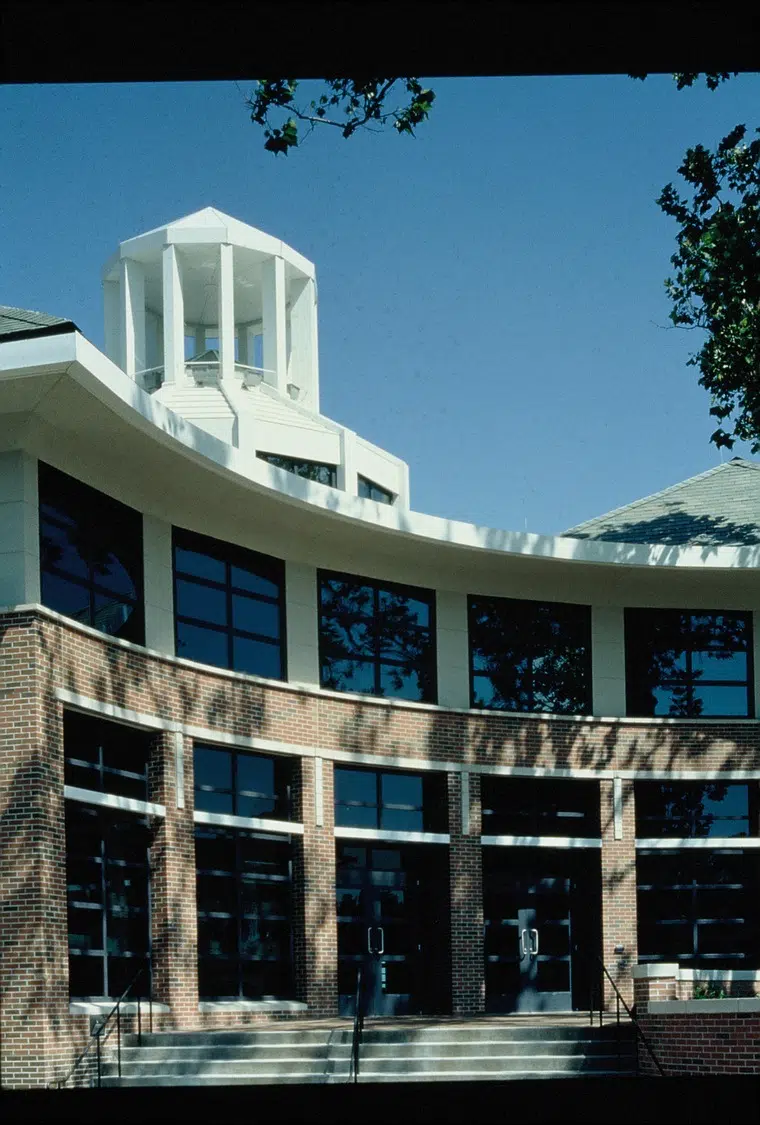 Lee Hills Hall is located on the edge of the university’s historic red campus, so the firm selected materials that were compatible with the existing structures. Exterior features were carefully planned to tie the modern building in with the historic fabric of the campus. This was accomplished by utilizing a slate roof, red brick exterior and old-style vertical windows. The hall also features a central vertical lantern that relates to the dome and cupola of Jesse Hall, the campus administration building.