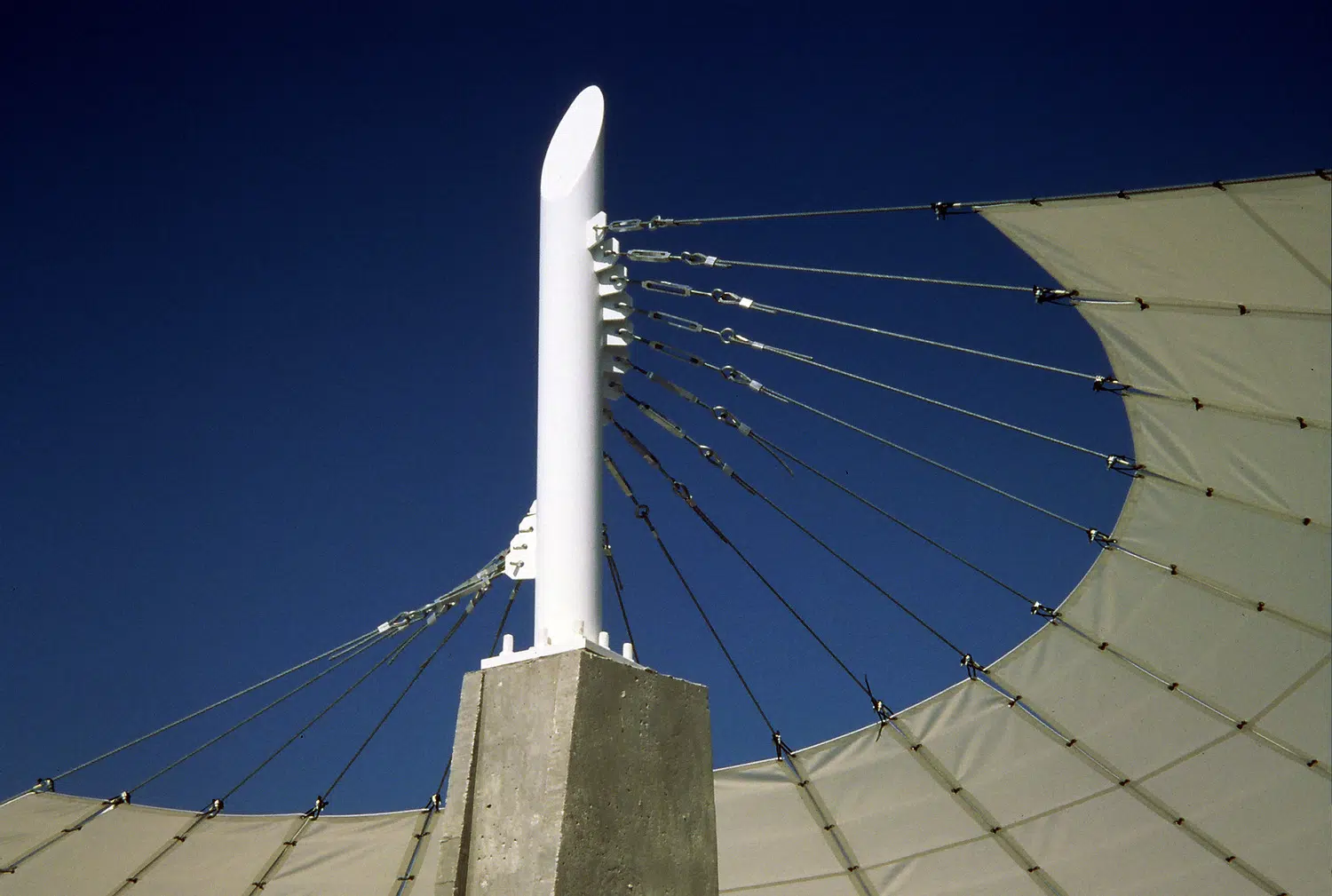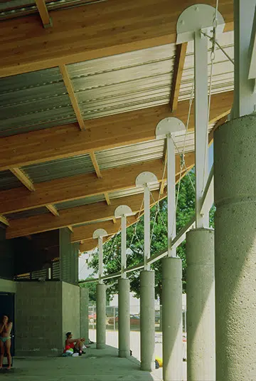 The importance of night swimming at Sedalia’s Liberty Park Aquatic Center led to the design of a unique up-lighted fabric structure supported by a concrete and steel mast. This element was detailed to enable seasonable removal and creates a glowing marker at night swims.