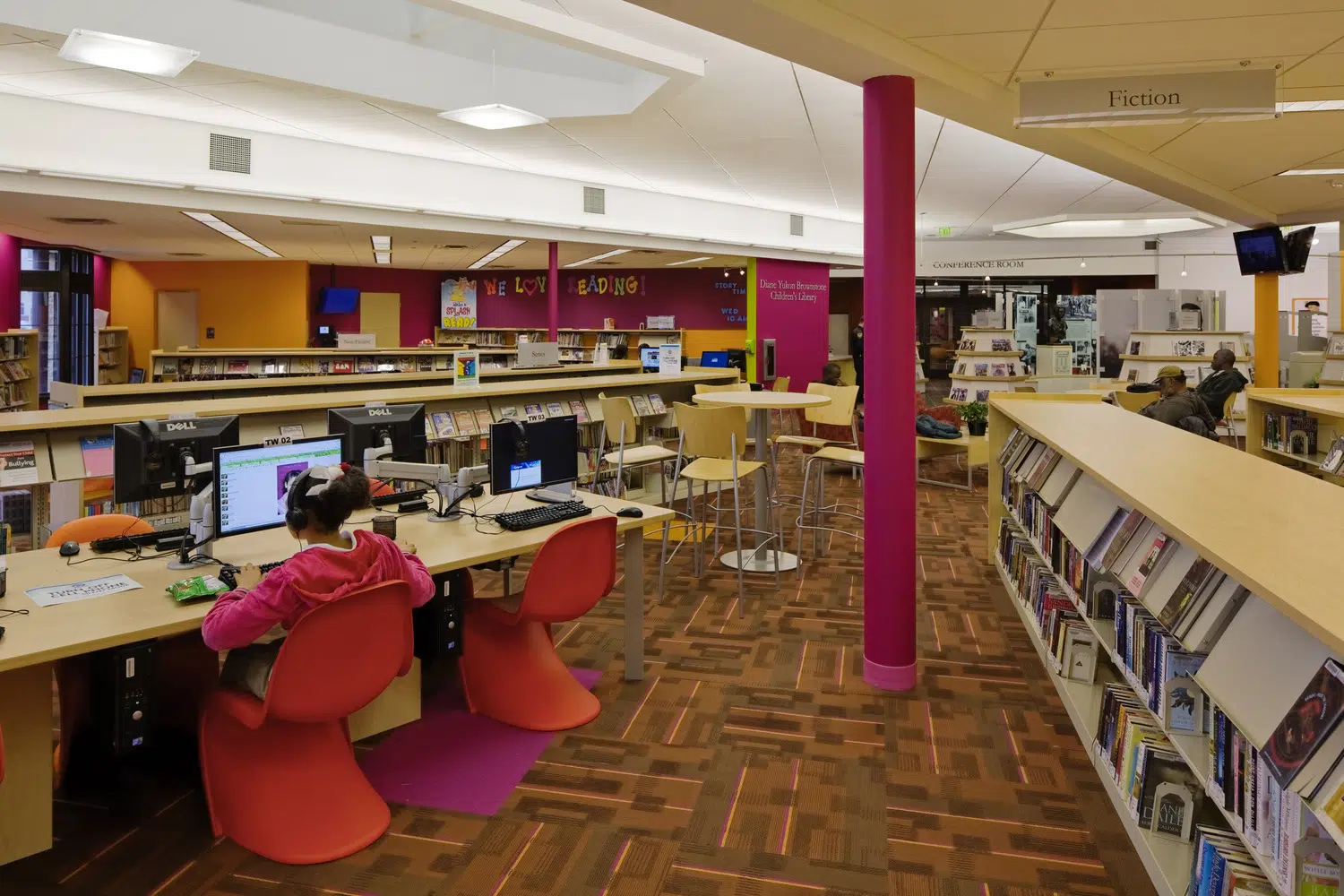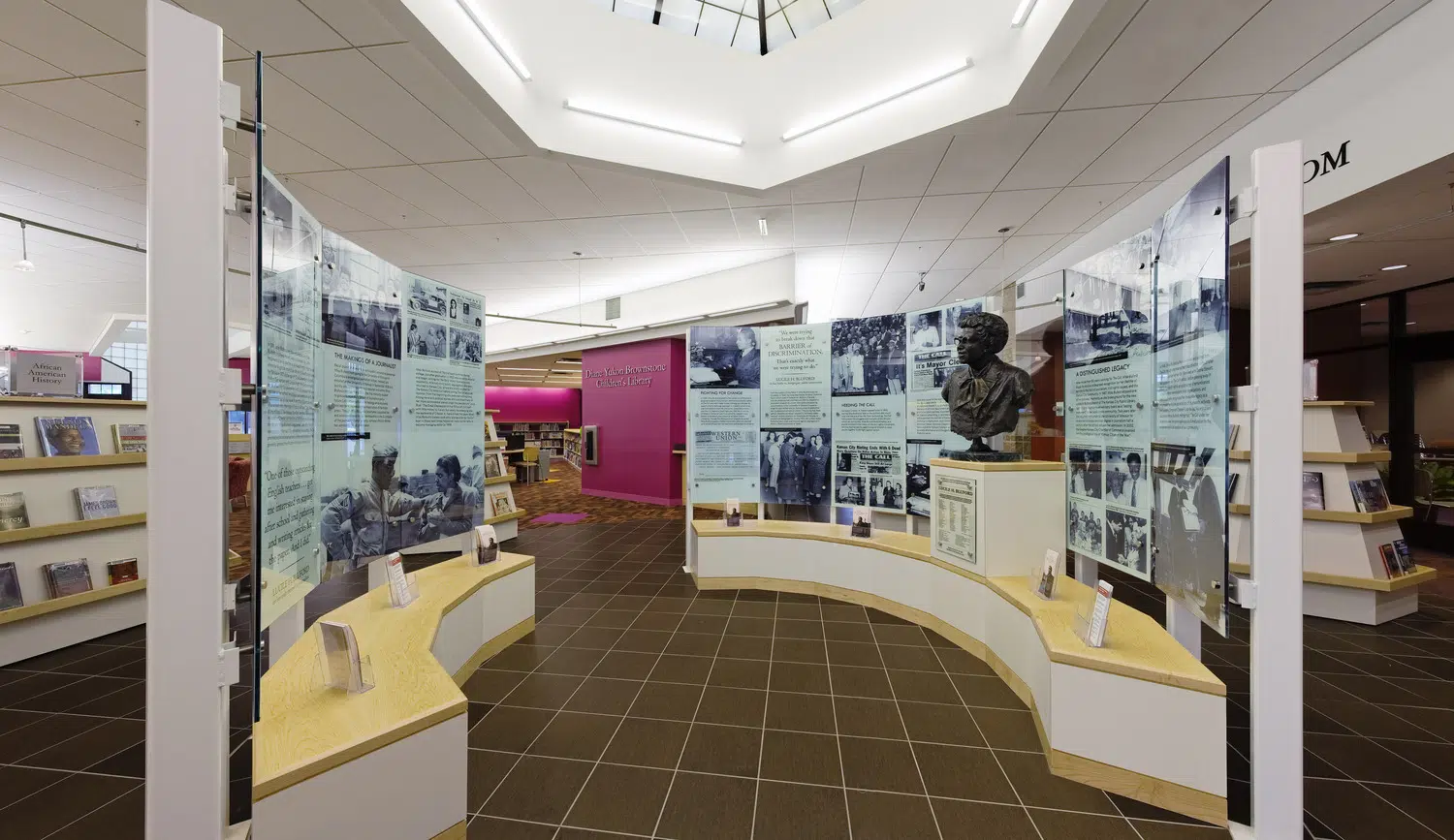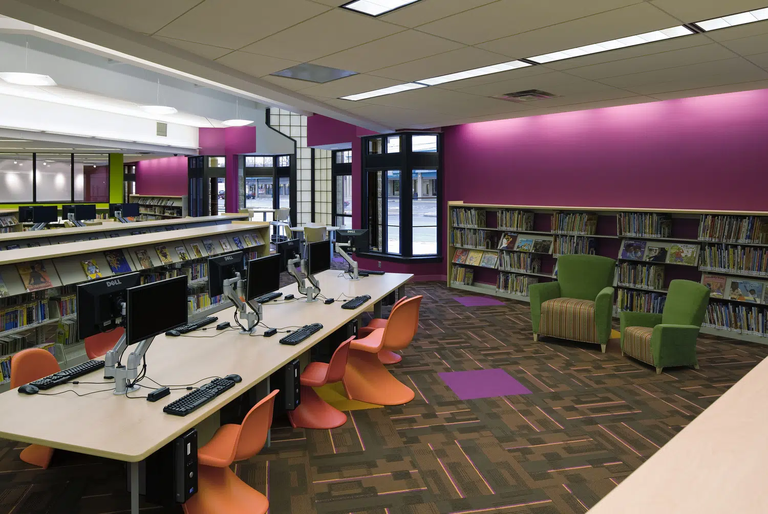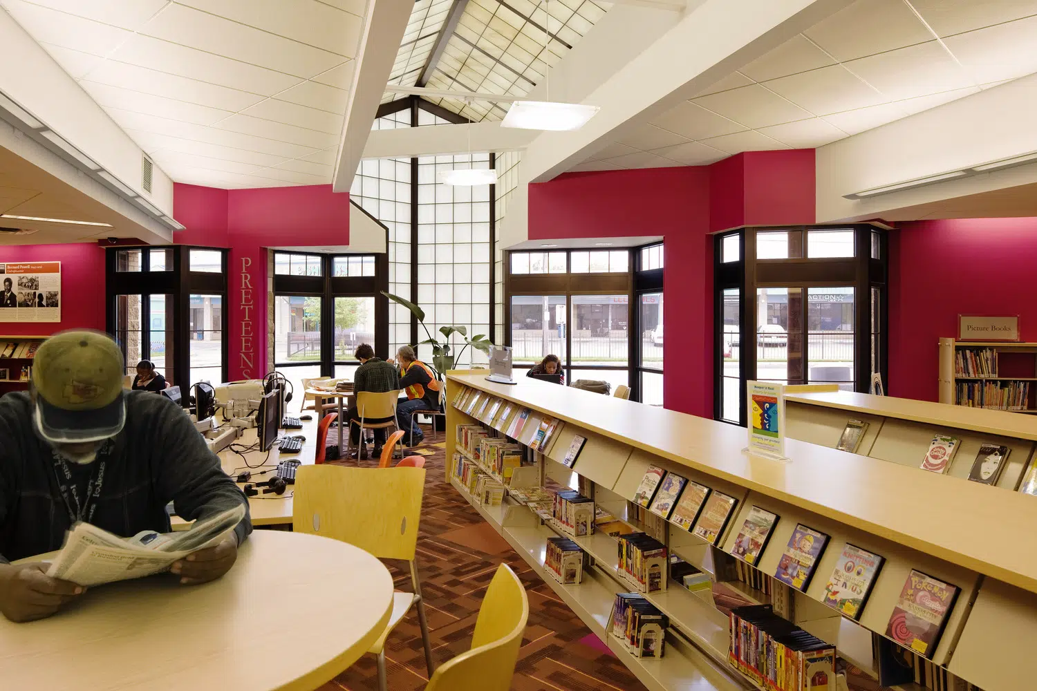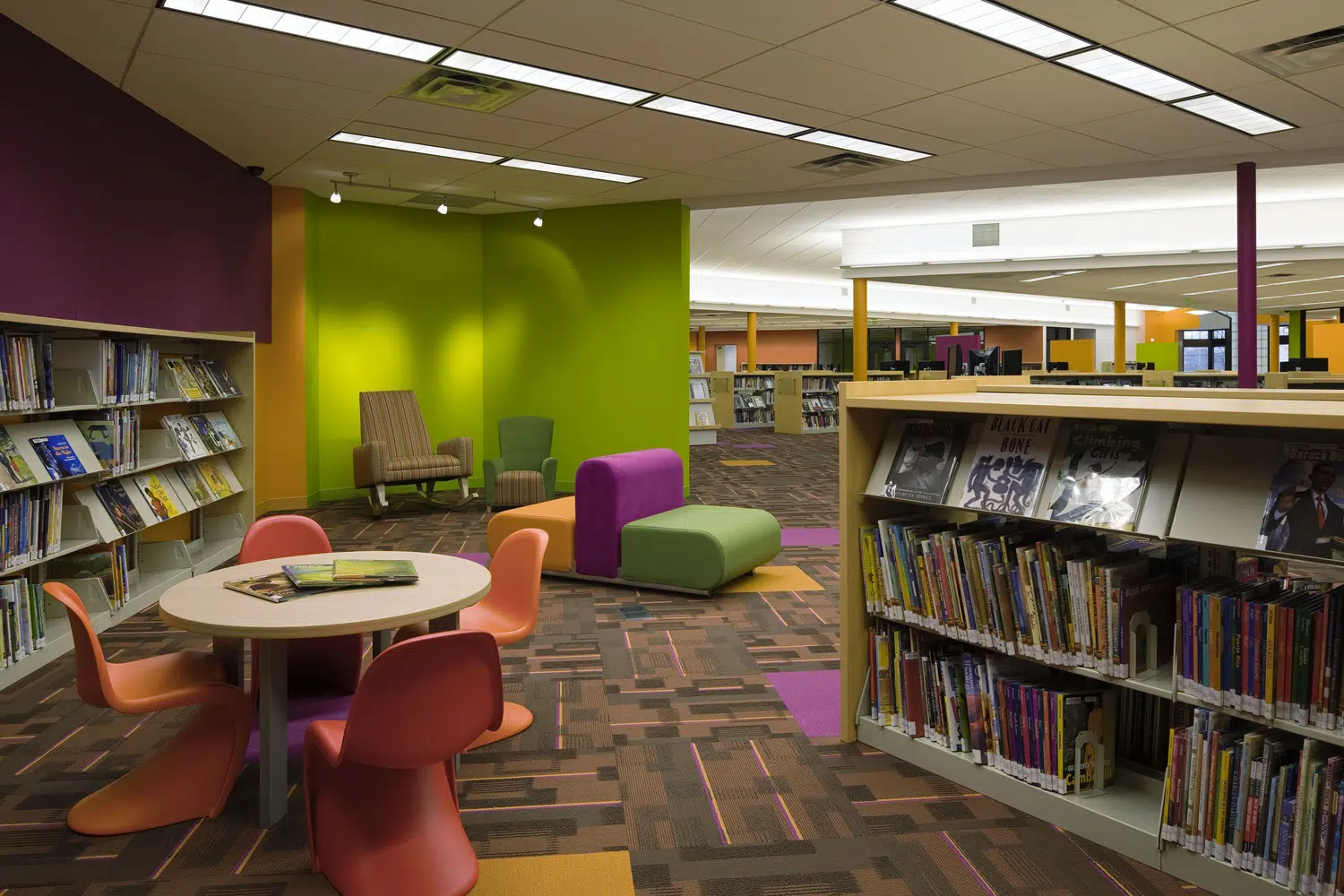 The design team collaborated closely with Kansas City Public Library representatives and community stakeholders to revitalize this urban neighborhood branch library to create a vibrant space for study, research, entertainment and interaction. A warm and welcoming interior provides flexibility for display arrangements, furnishings and space allocation over time, without compromising functionality and efficiency for staff. Historic neighborhood artifacts and collections are displayed with finishes appropriate to the local heritage. Furnishings respond to patrons, especially children and teens, with gaming stations, game tables and an increased number of computer tables.