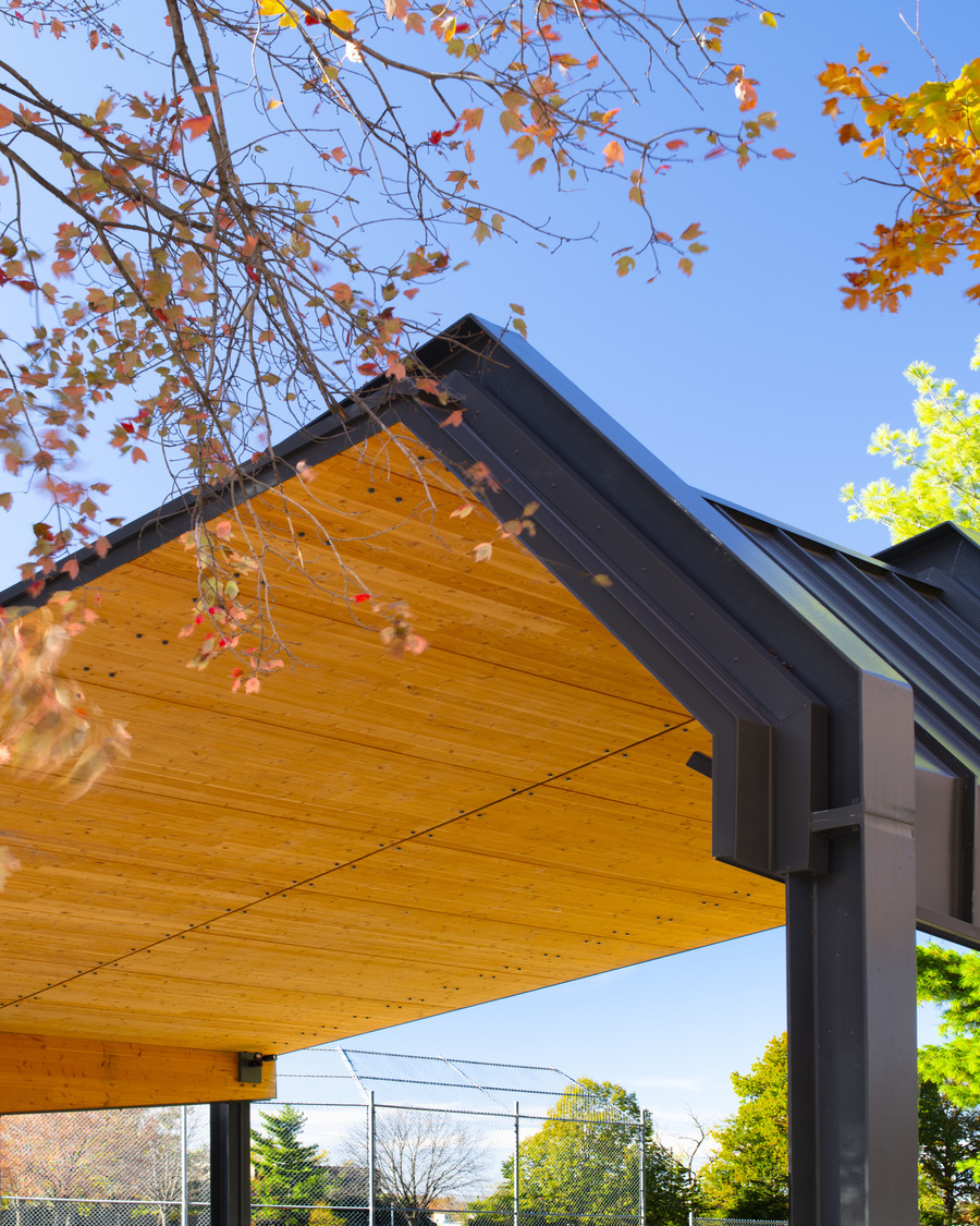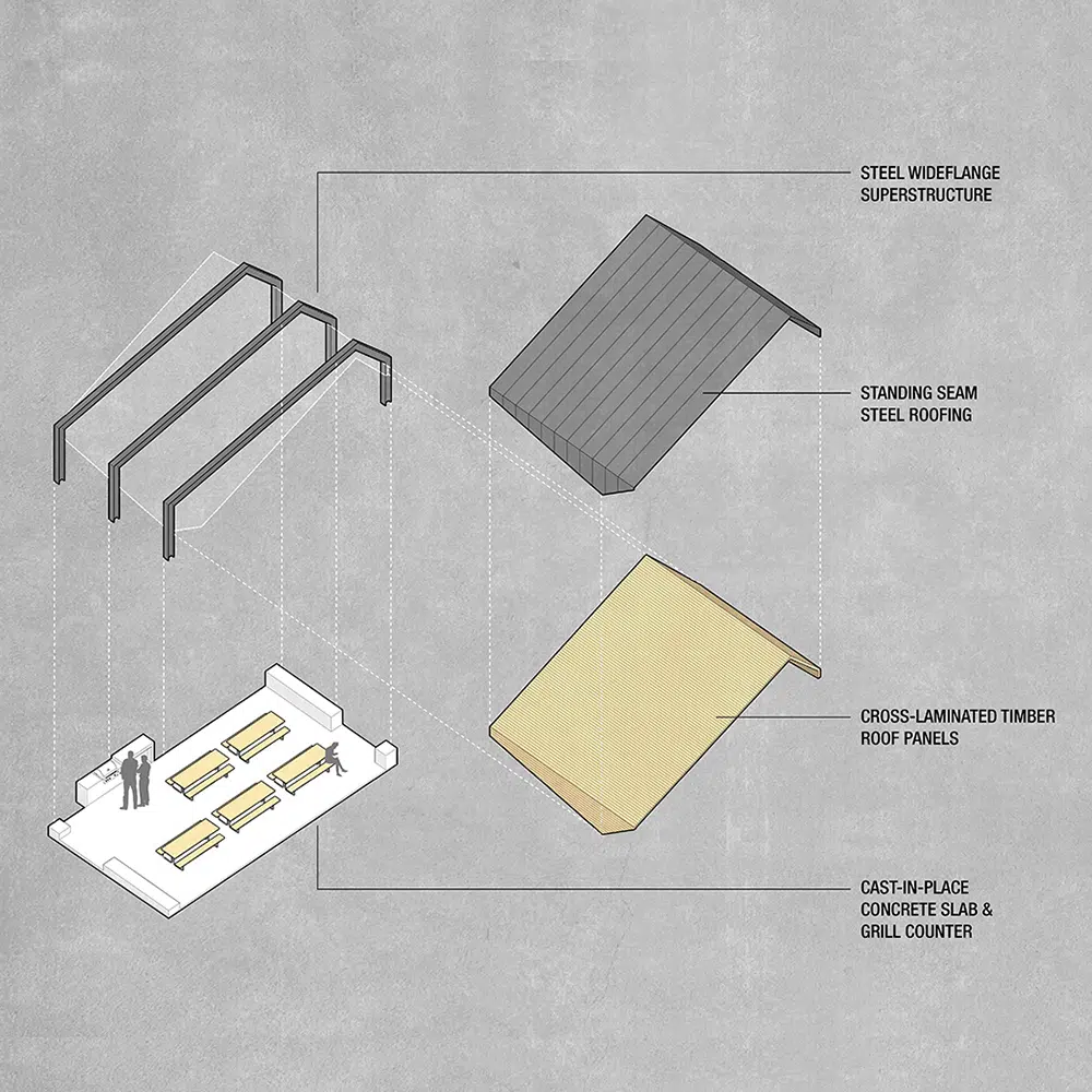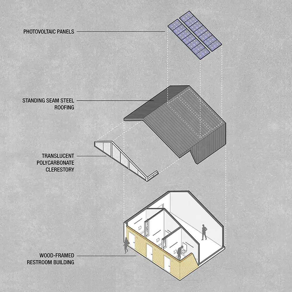 Energy costs for the community are significantly diminished and sustainable practices are promoted to all visiting the site. Solar panels generate electricity on-site for all new structures while the restroom building relies on its compact form and clerestory daylighting to limit its energy needs. The shelter's roof is formed by standing seam steel roofing and cross-laminated timber panels. Structurally innovative and aesthetically pleasing, the panels use rapidly renewable resources and reduce on-site construction time while minimizing finish materials and enhancing the acoustic quality of the shelter.