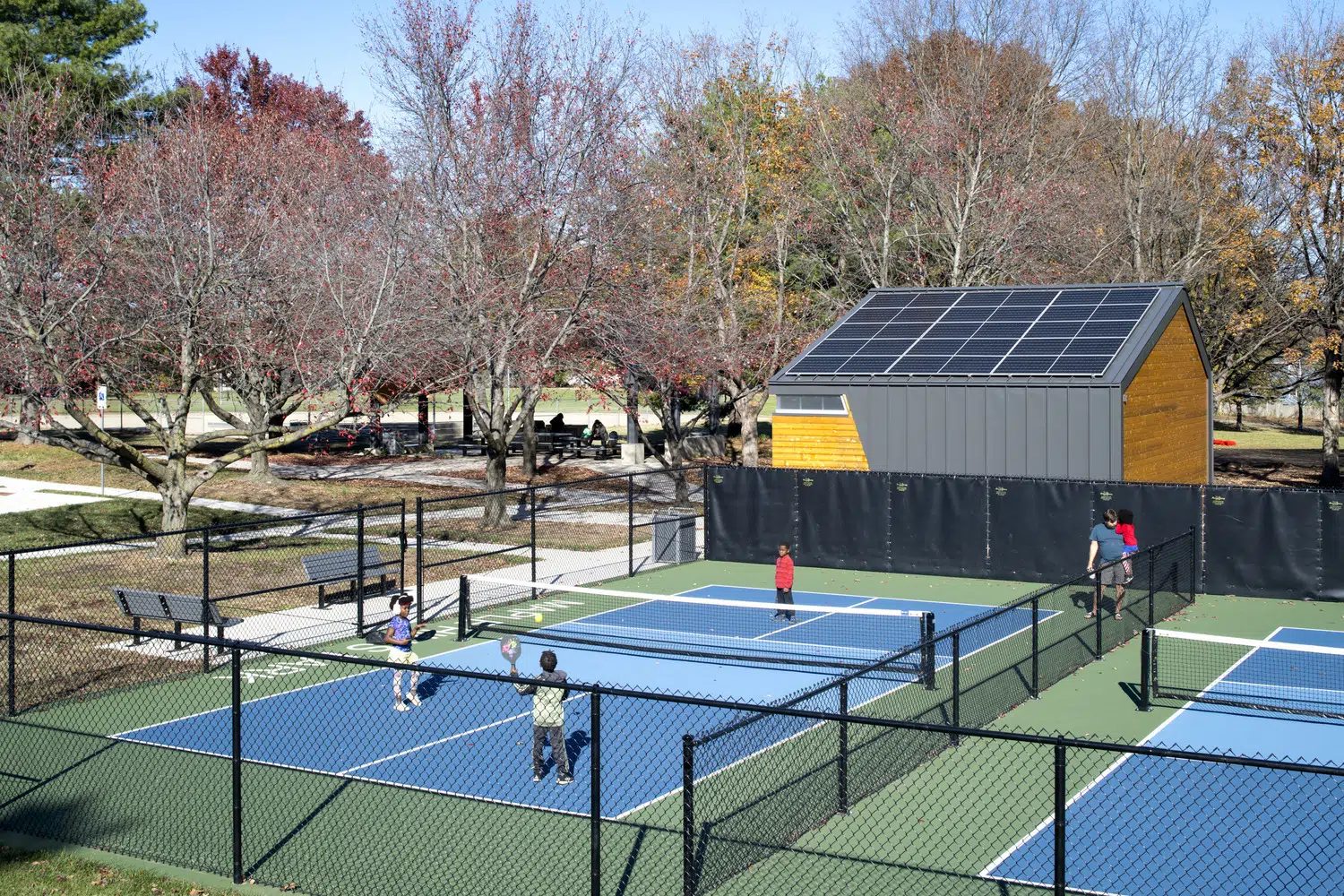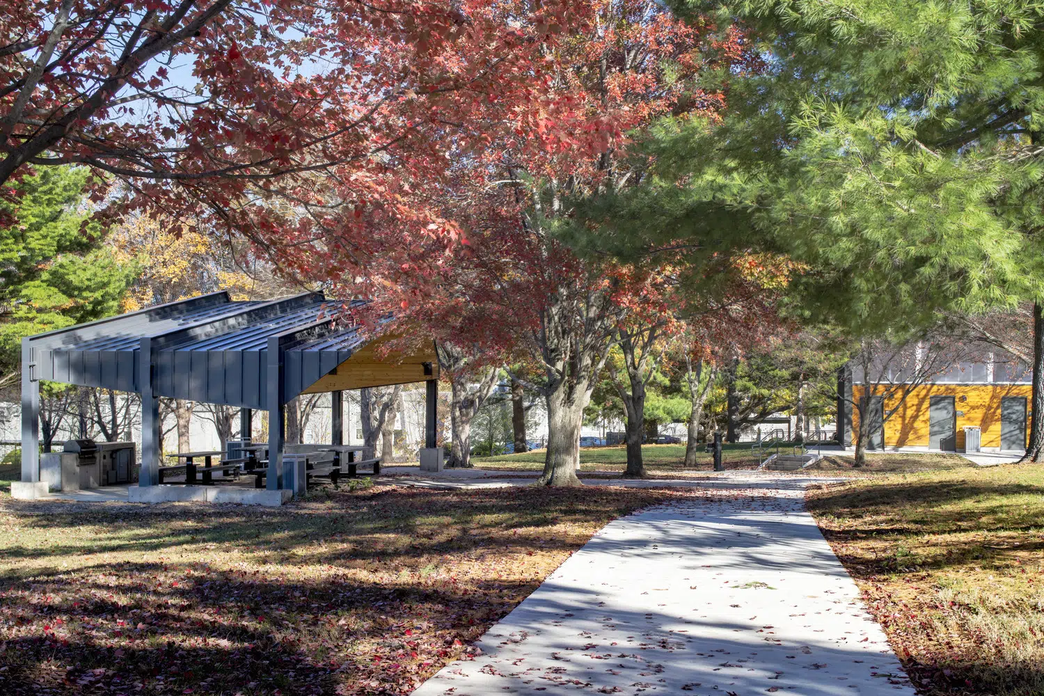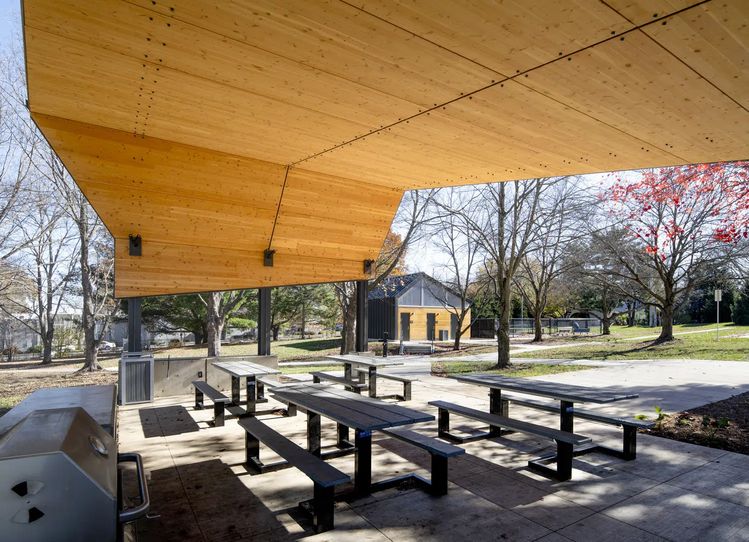 Energy costs for the community are significantly diminished and sustainable practices are promoted to all visiting the site. Solar panels generate electricity on-site for all new structures while the restroom building relies on its compact form and clerestory daylighting to limit its energy needs. The shelter's roof is formed by standing seam steel roofing and cross-laminated timber panels. Structurally innovative and aesthetically pleasing, the panels use rapidly renewable resources and reduce on-site construction time while minimizing finish materials and enhancing the acoustic quality of the shelter.
