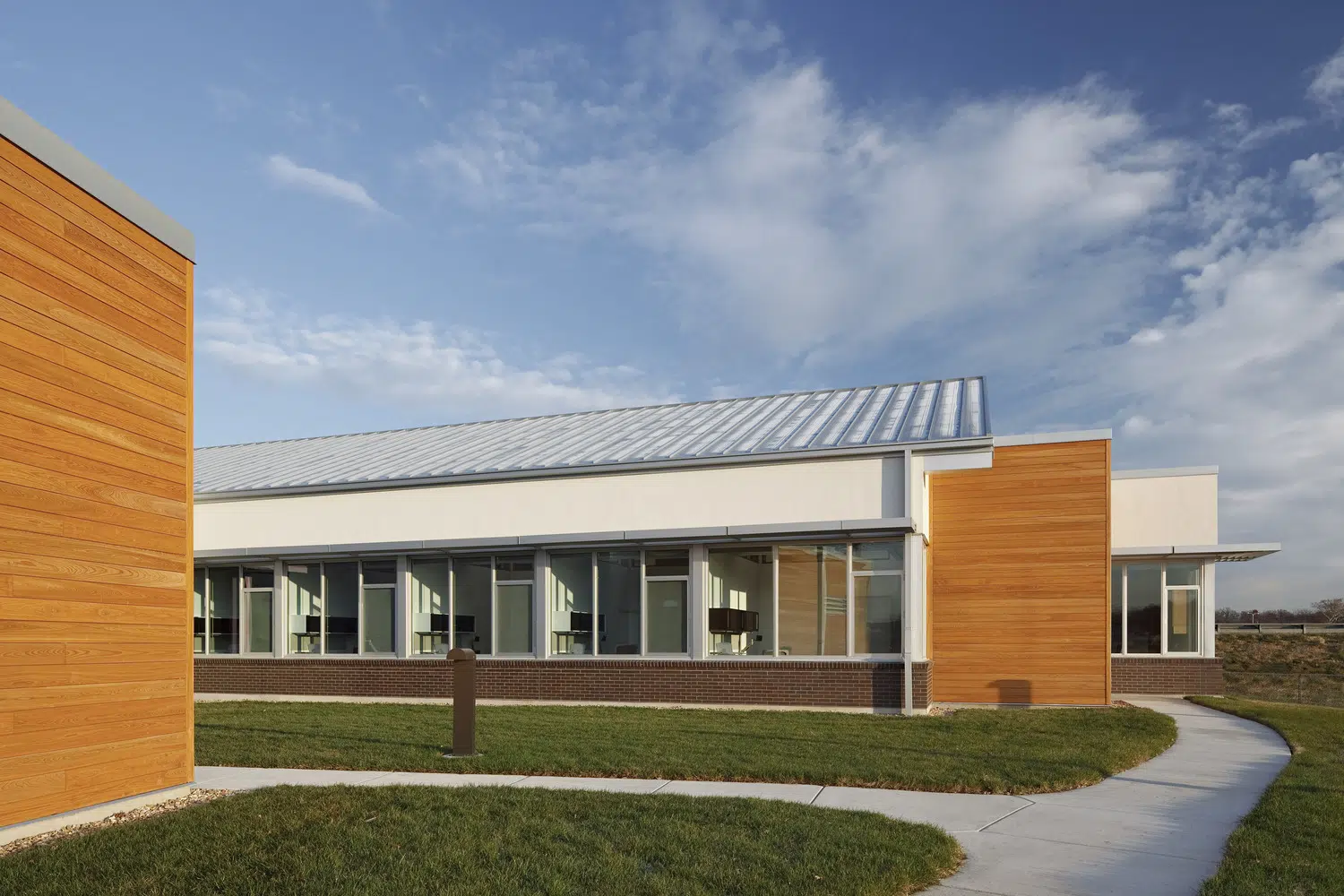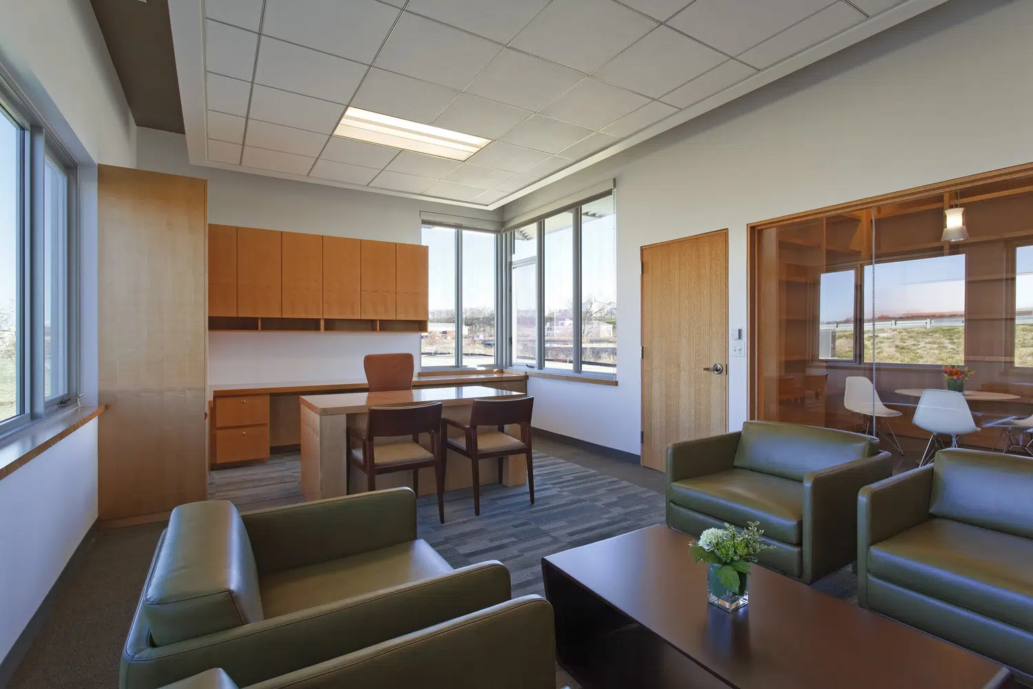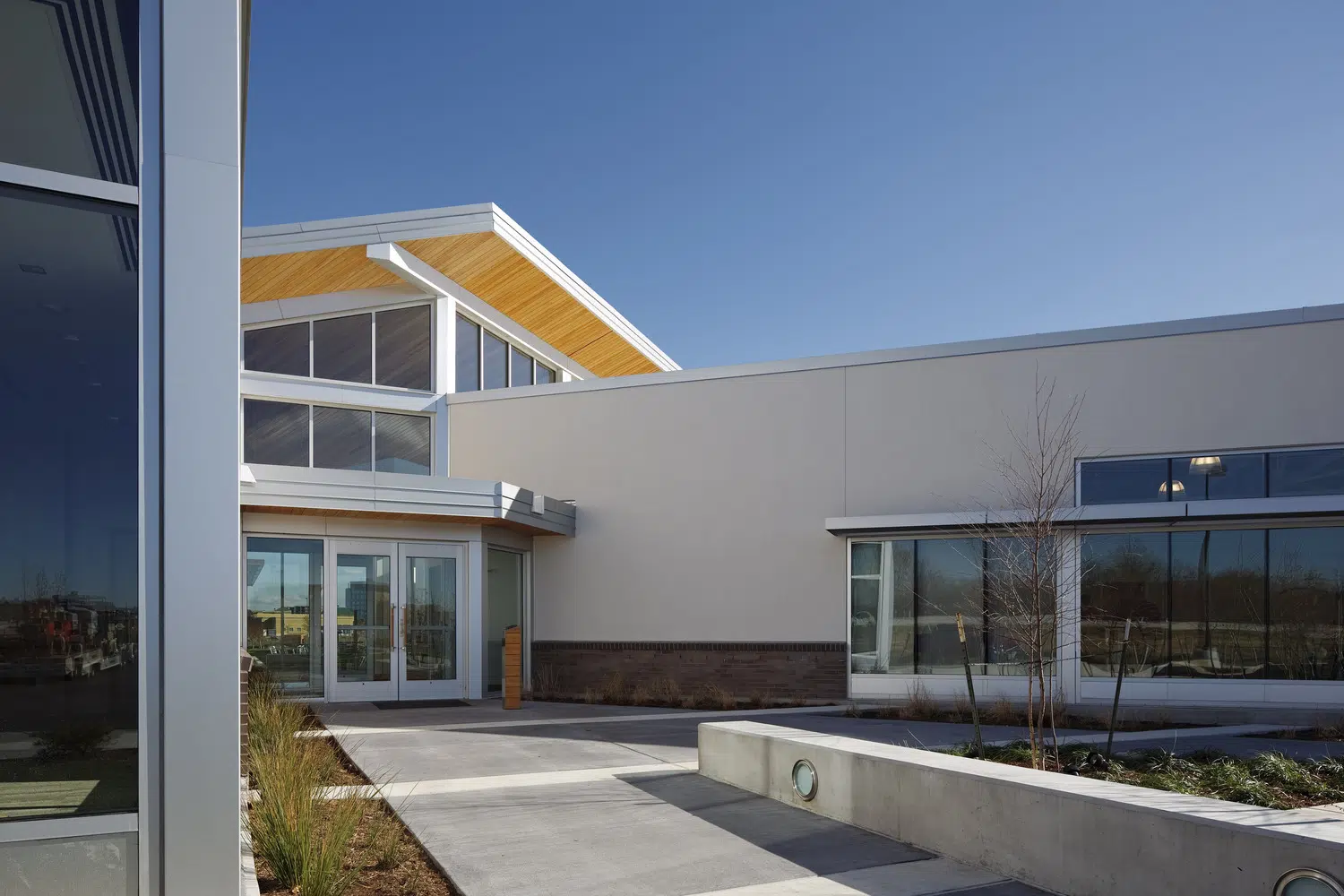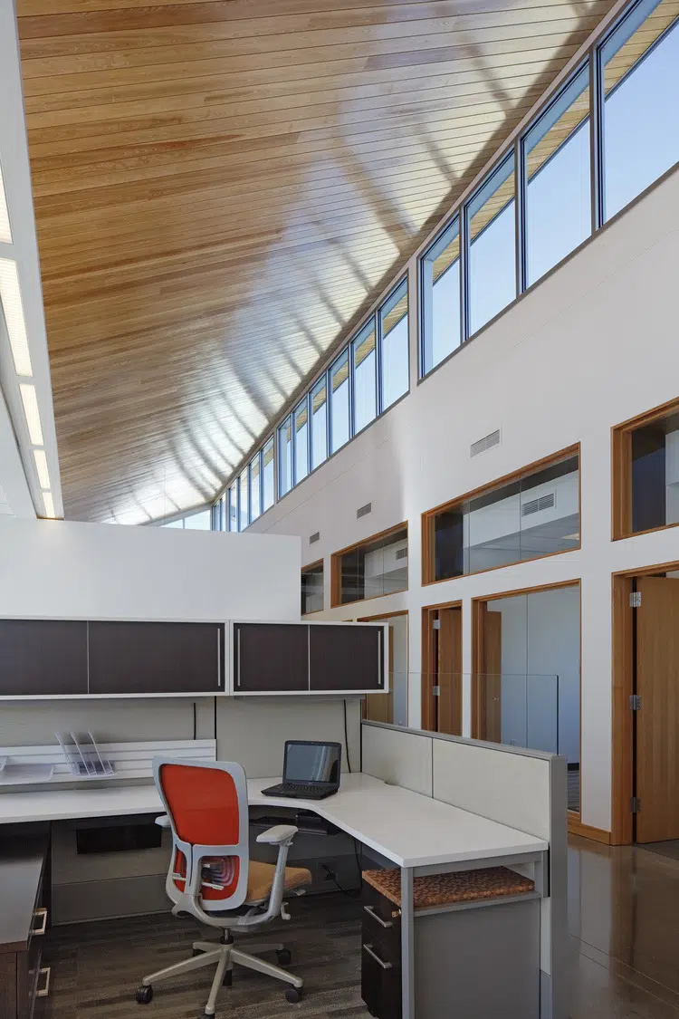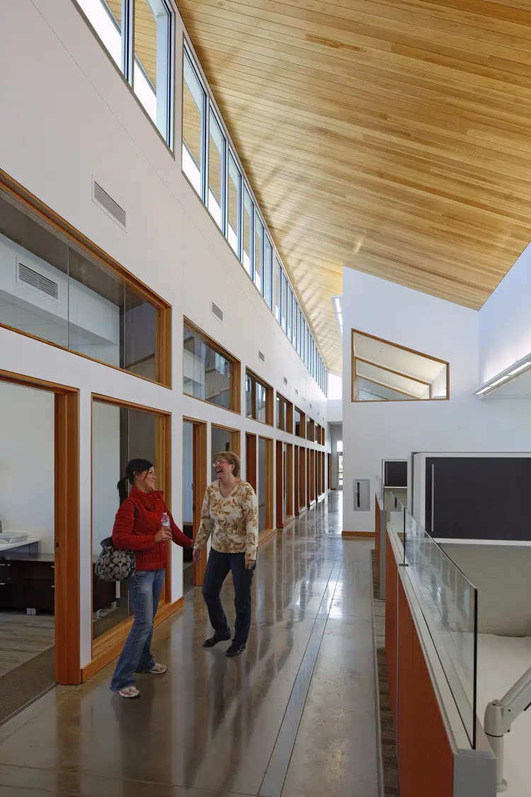 A signature office was designed to meet MPR's long-term space needs and provides a warm, inviting environment that expresses the organization's values of physical wellness, education and sustainability. The new headquarters provides warm, welcoming spaces with a practical yet elegant aesthetic that supports both collaborative and separation needs of staff and clients. The floor plan was divided into three distinctive elements, opening all spaces of the building to natural light and exterior views. A large outdoor courtyard serves as an amenity and gathering space. In addition to open and private office spaces, the facility provides a wellness center, tiered training room and conference spaces.