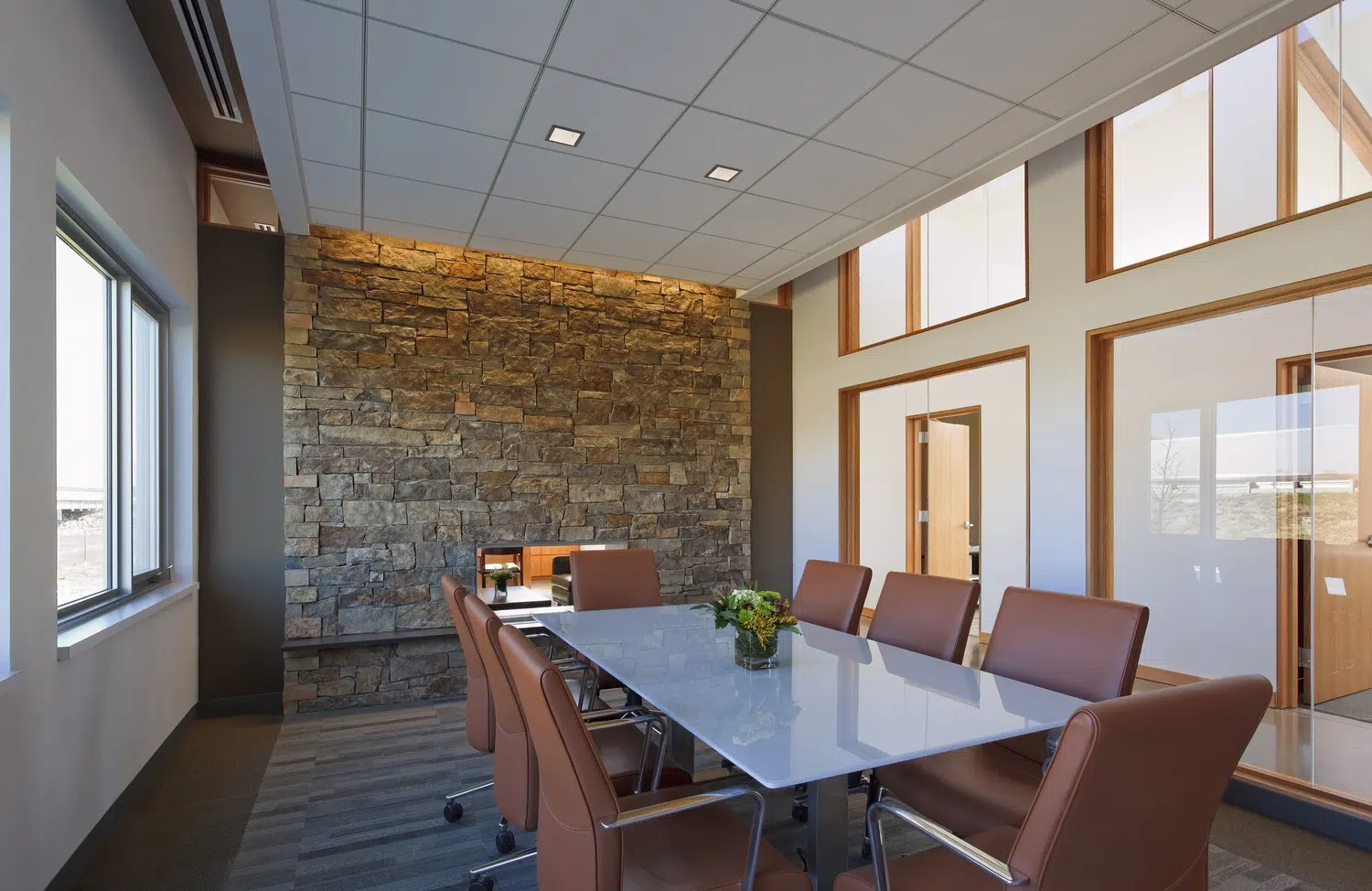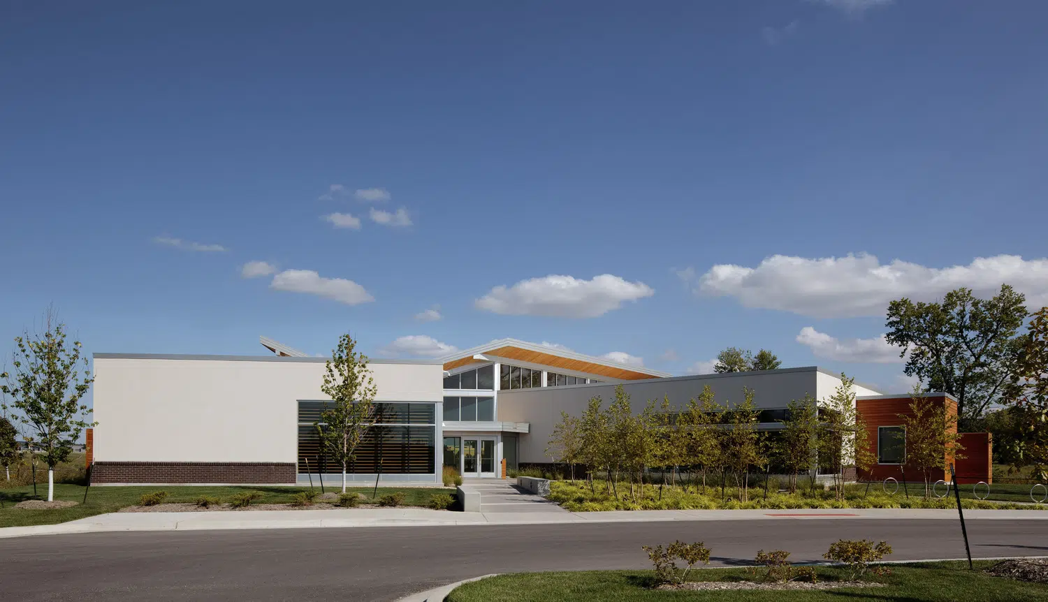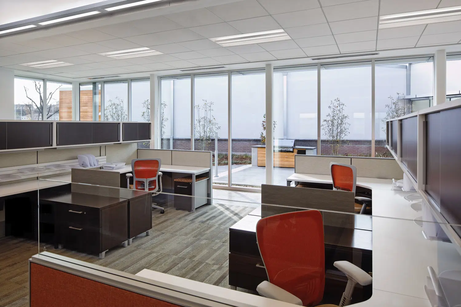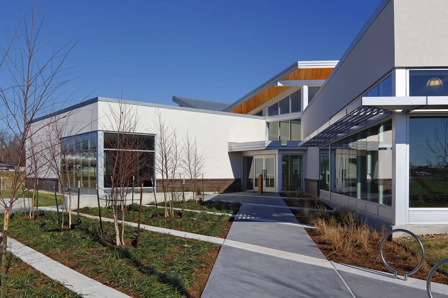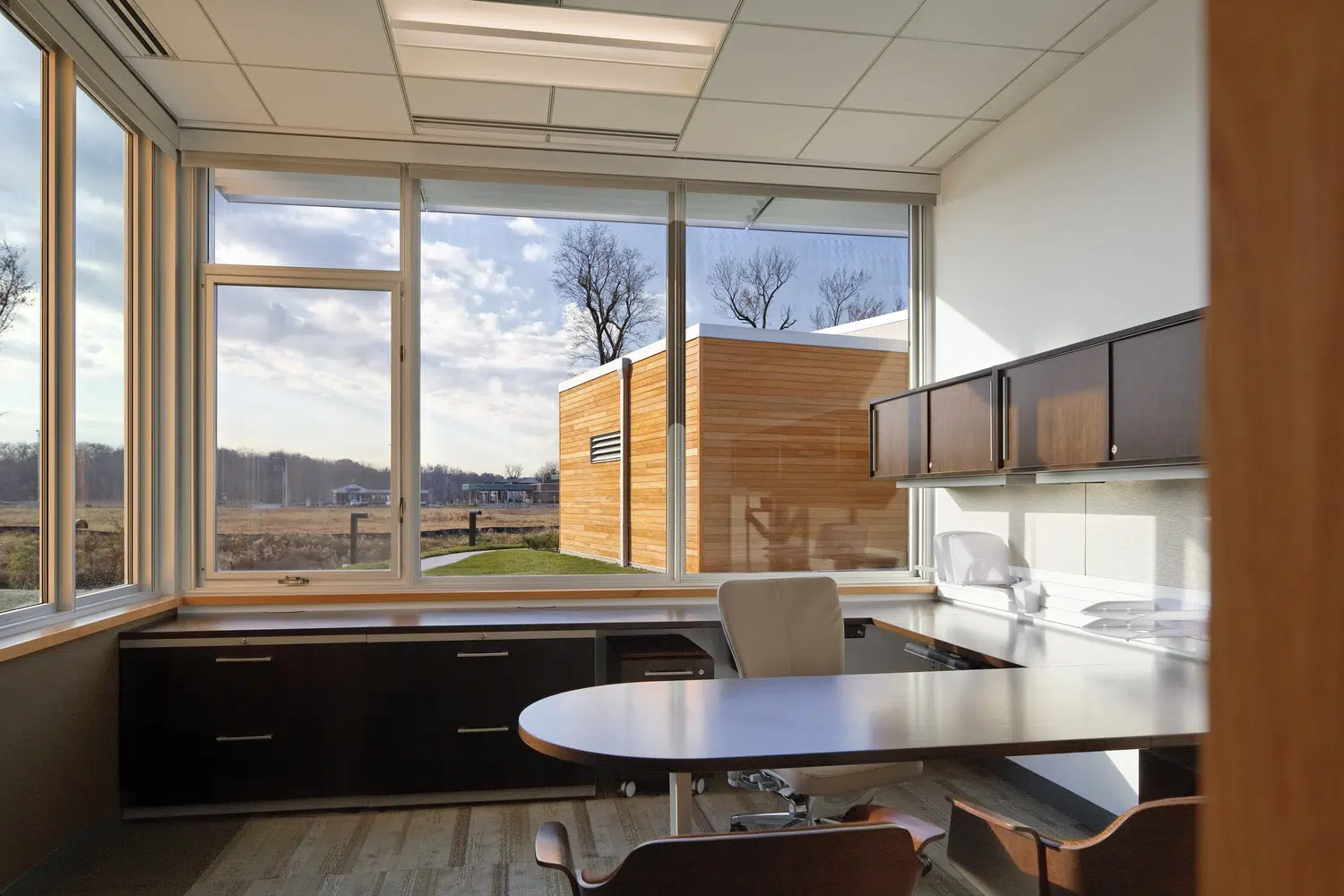 A signature office was designed to meet MPR's long-term space needs and provides a warm, inviting environment that expresses the organization's values of physical wellness, education and sustainability. The new headquarters provides warm, welcoming spaces with a practical yet elegant aesthetic that supports both collaborative and separation needs of staff and clients. The floor plan was divided into three distinctive elements, opening all spaces of the building to natural light and exterior views. A large outdoor courtyard serves as an amenity and gathering space. In addition to open and private office spaces, the facility provides a wellness center, tiered training room and conference spaces.