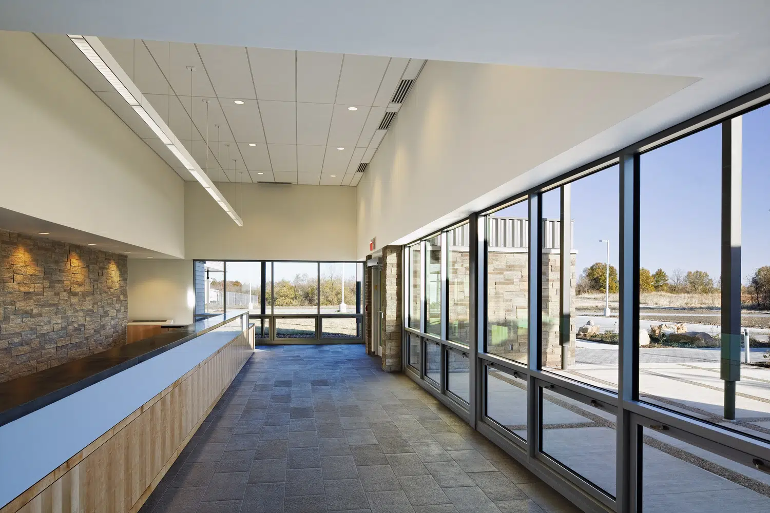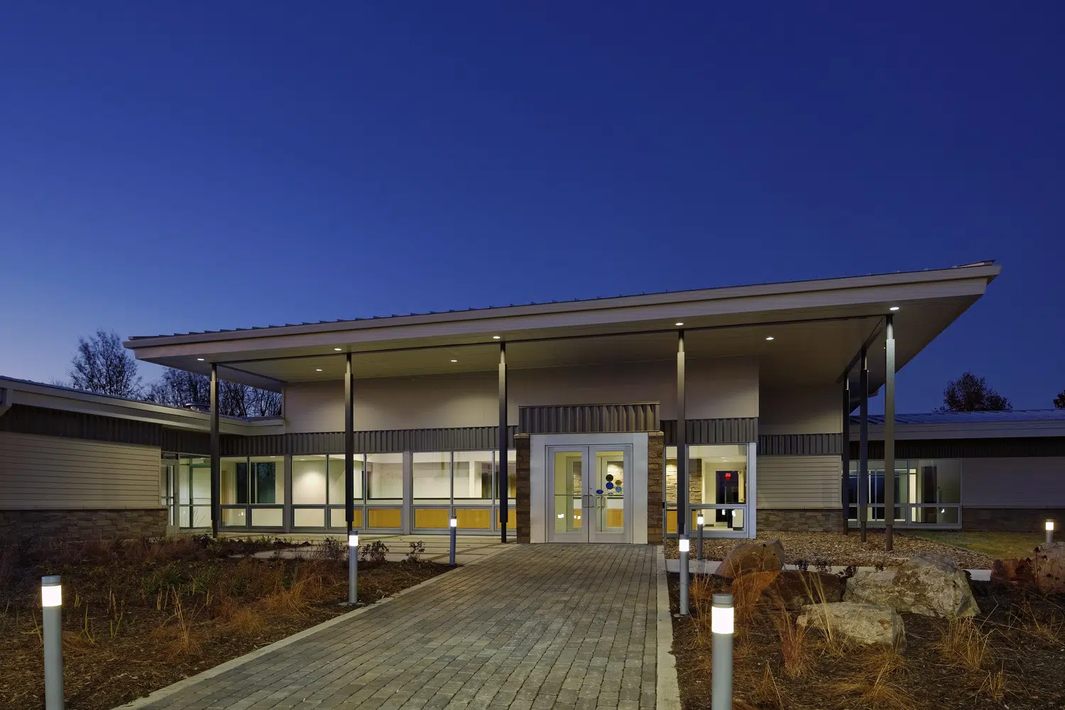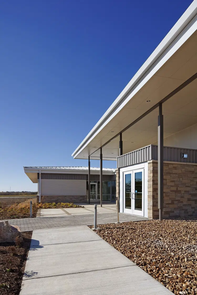 The Missouri Department of Conservation Regional Headquarters provides a variety of spaces to support its operations, including classrooms, work rooms, wet lab, mud room, locker room, offices, workstations, employee breakroom and storage. The facility integrates sustainable design features such as geothermal HVAC, photovoltaic solar power, local and recycled materials, and an efficient building envelope utilizing high-performance glazing and structurally insulated panels.