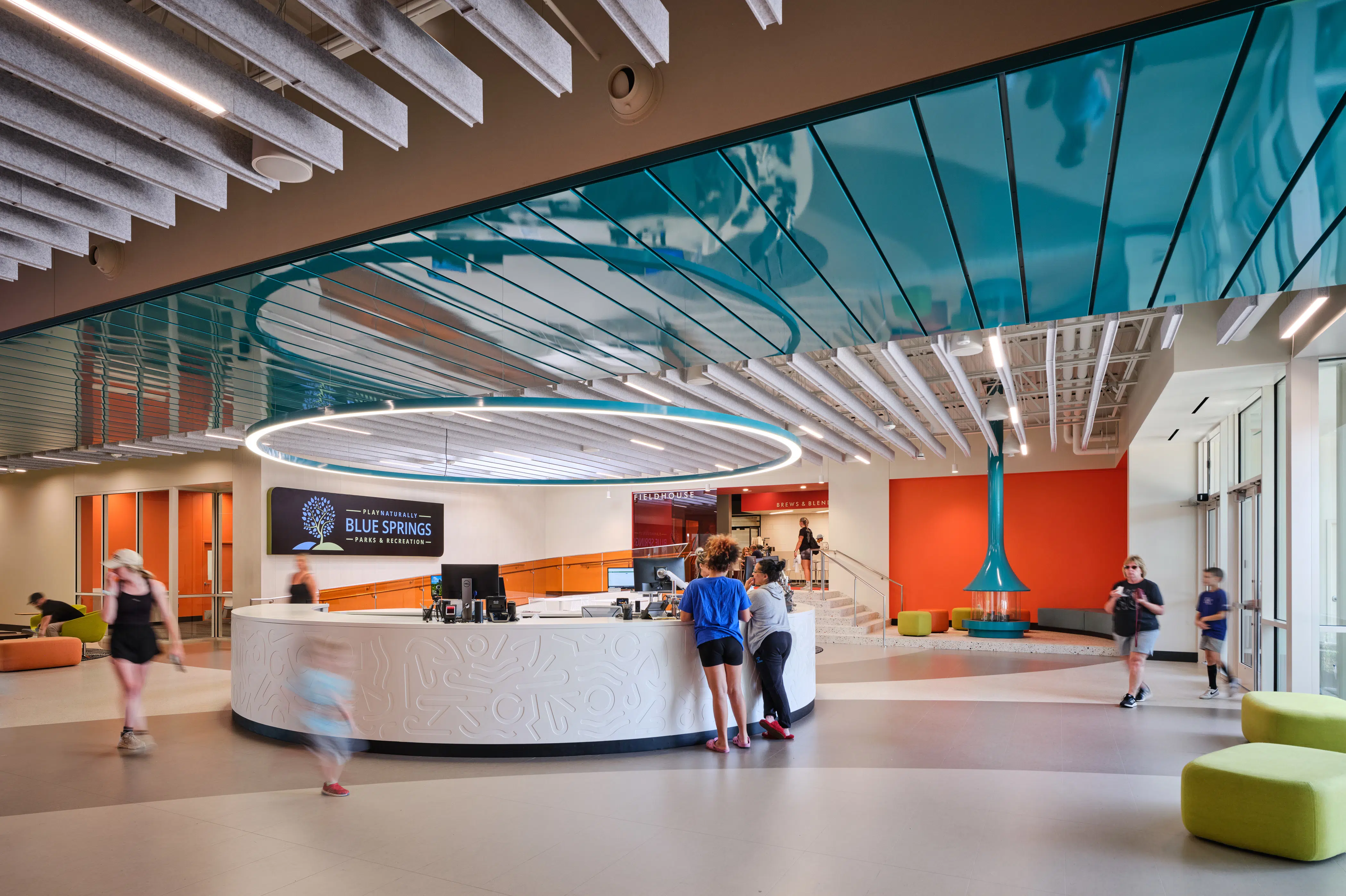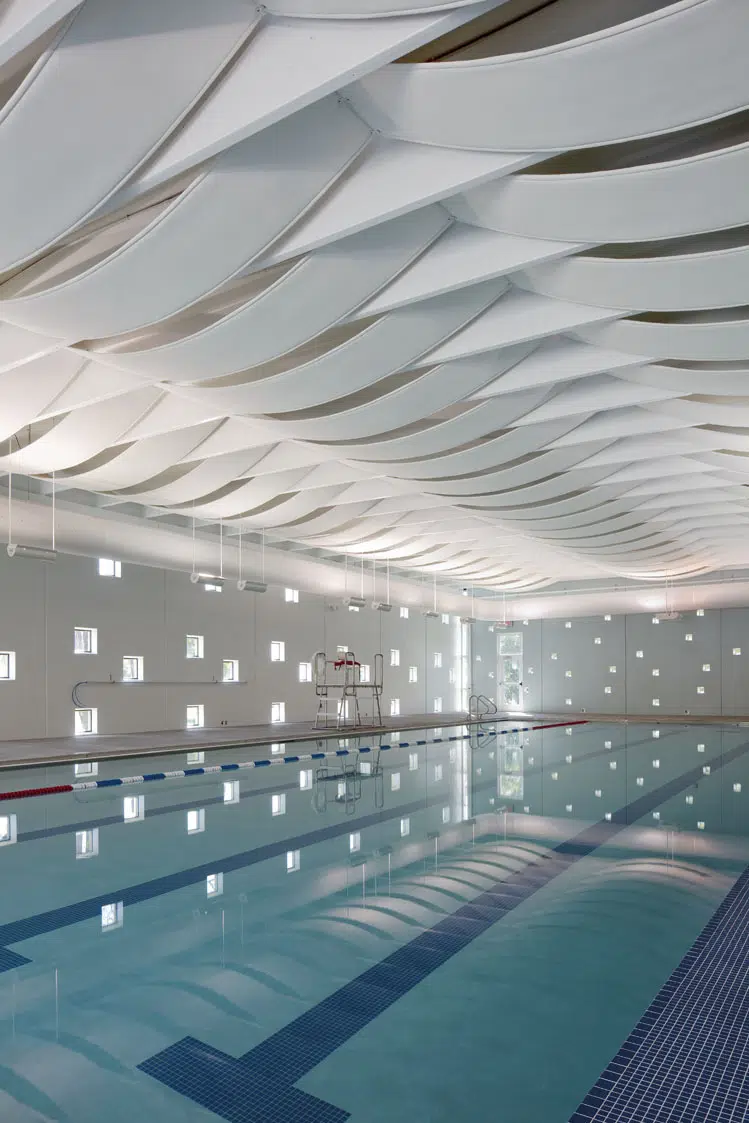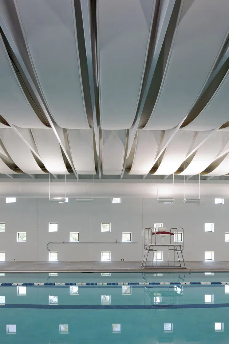 The very nature of the facility, aquatics, water, effervescence, fluidity, and playfulness provided inspiration in developing the identity of the interior space. The interior does not strive to compete with the pool as the focus of the space but rather uses the motion of the pool to activate itself. The restraint applied in selecting interior colors further serves to emphasize the nature of the interior aesthetics. Acoustic ceiling baffles undulating between the roof structure mimic the basic wave motion of the water and evoke a peaceful mood above the surface, further manipulating the static nature of the box that encloses the space. The movement of the ceiling treatments and the dancing natural light on the surface of the water create a sense of calm when the water is still but bring the surface to life when the calm is broken. The punched window openings not only admit natural light, but from the exterior, provide a glimpse of the activities within as well as create an appealing patterning of glowing cubes at night.