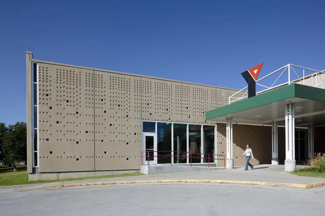 The simple building form responds to a need to not merely shelter but to provide a straightforward and inventive response for filtering natural light into the facility. Light enters into the pool space through repetitive patterns in the insulated pre-cast concrete wall panels. The patterning breaks down the typically heavy, monolithic nature of the panels and also finds its way into far reaches of the interior through reflection in the water. The clean white interior finish of the walls diminishes the scale of the structure and, where not perforated by the patterning of the window openings, reduces visual clutter and allows the personality of the users and aquatic equipment to maintain precedence in the space.