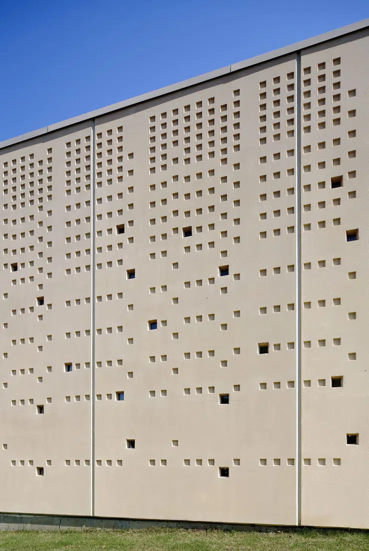 The economy of the pre-cast panels is maintained by creating a repetition in the perforation patterns. A lightness of material, achieved through relief, perforation, and motion, contradicts the inherent character of the large concrete panels. The treatment of the building envelope creates a patterning of natural light in the interior space which plays on the reflections in the pool surface and highlights the fluidity and liveliness of the pool facility.