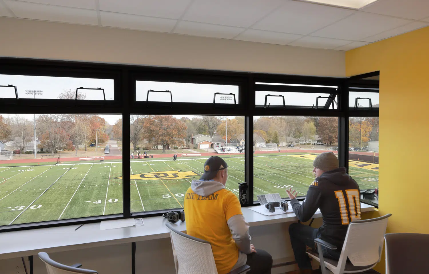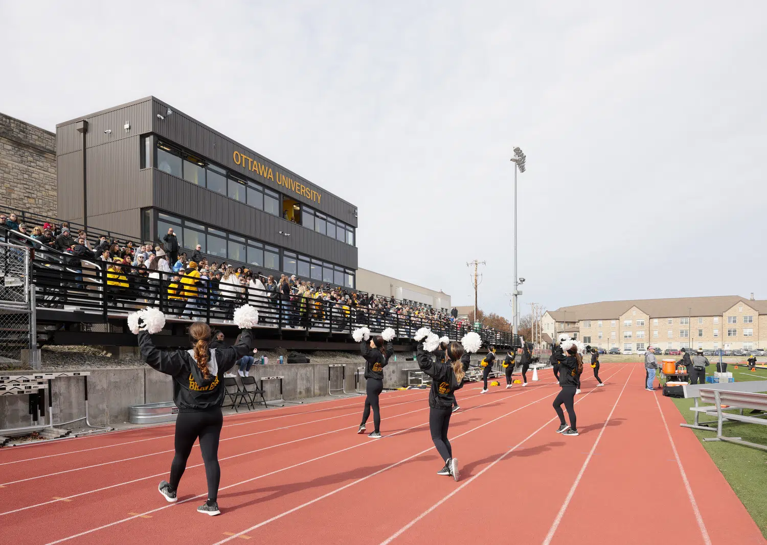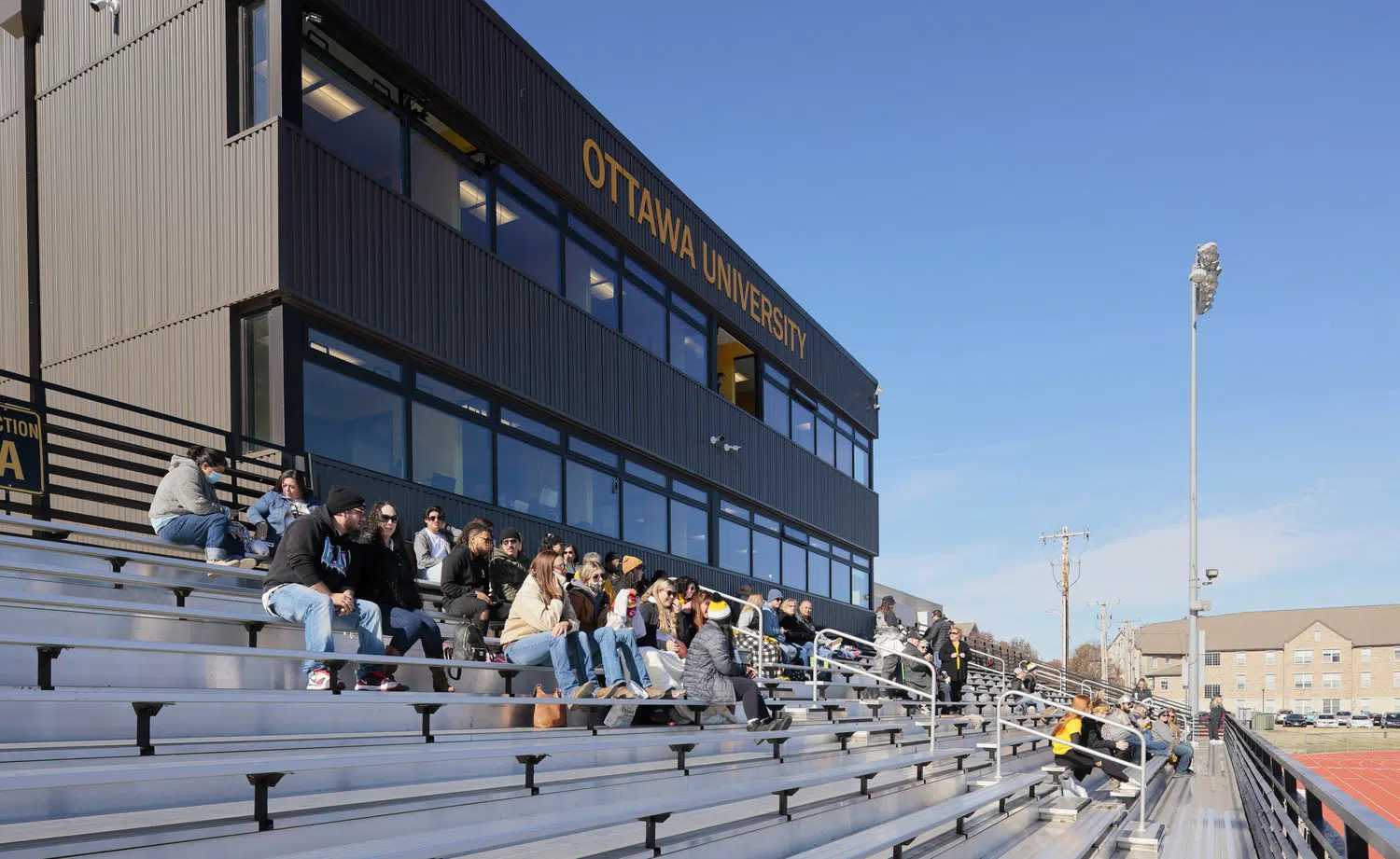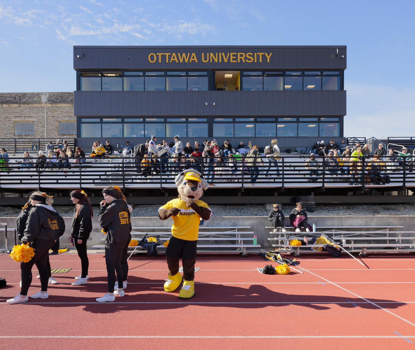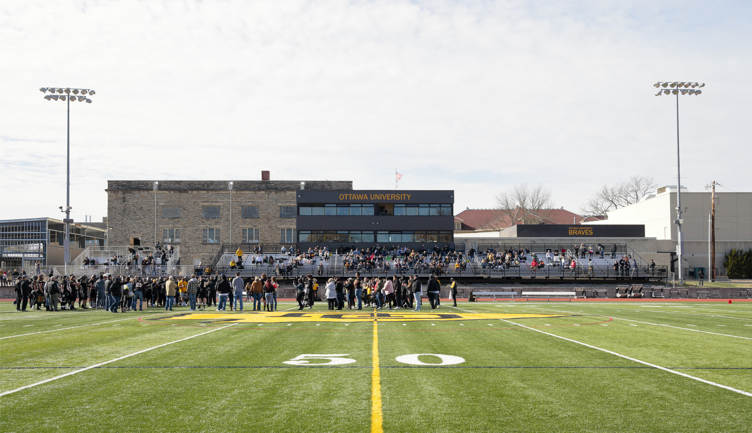 The three-level, 2,400 square foot press box at Braves Football Stadium can be seen from the heart of Ottawa University’s campus. It features a VIP area on the upper levels and Braves Hall of Fame Museum on the lower level.