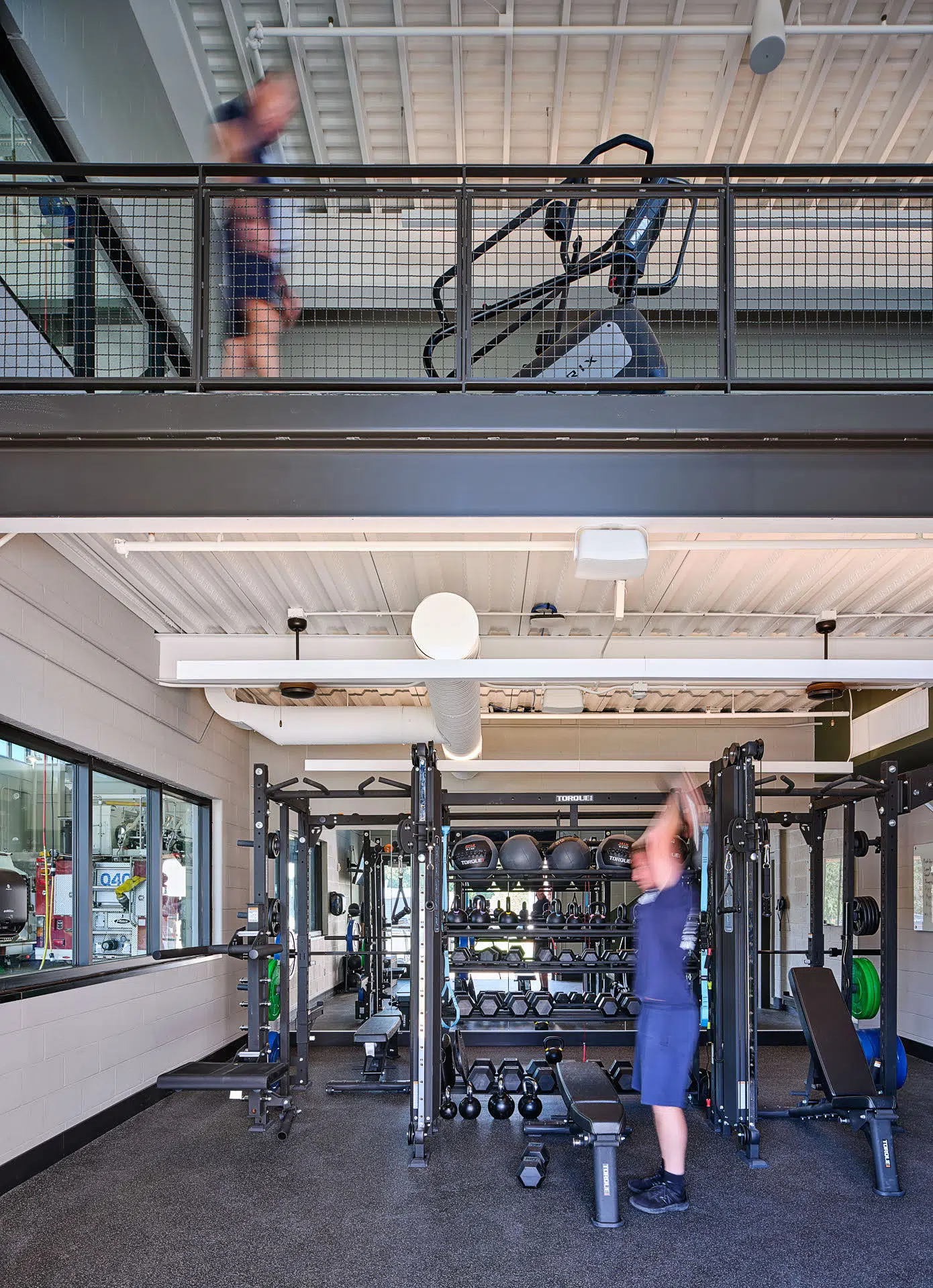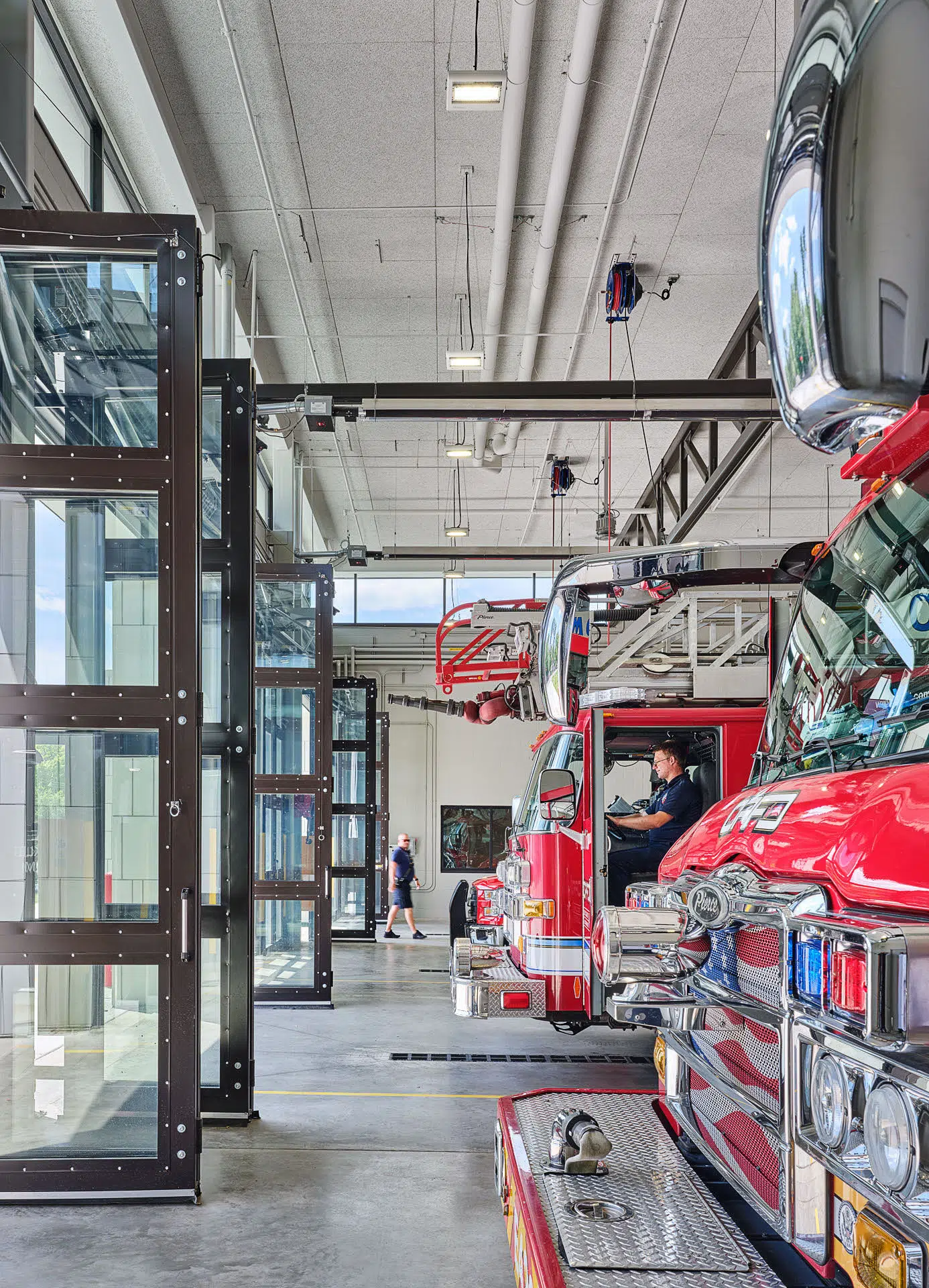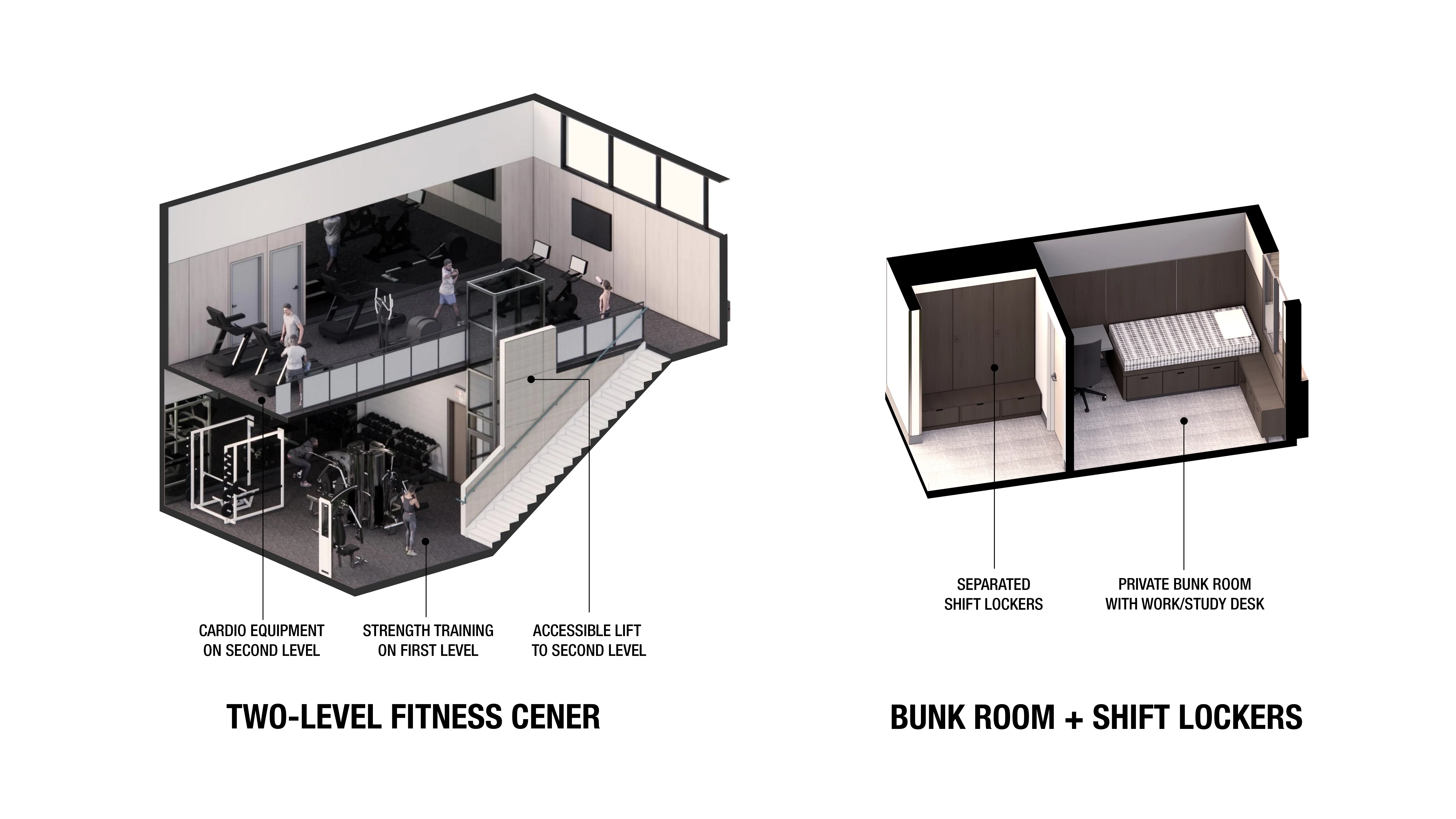All living spaces are designed to promote mental health and well-being. The station features a two-story fitness facility that opens to the rear apron for indoor and outdoor conditioning programs. Communal dining and gathering spaces encourage fellowship and socialization, while privacy, reflection, and rest are emphasized in the inclusive restrooms and individual sleeping quarters with separate, direct-access shift lockers.