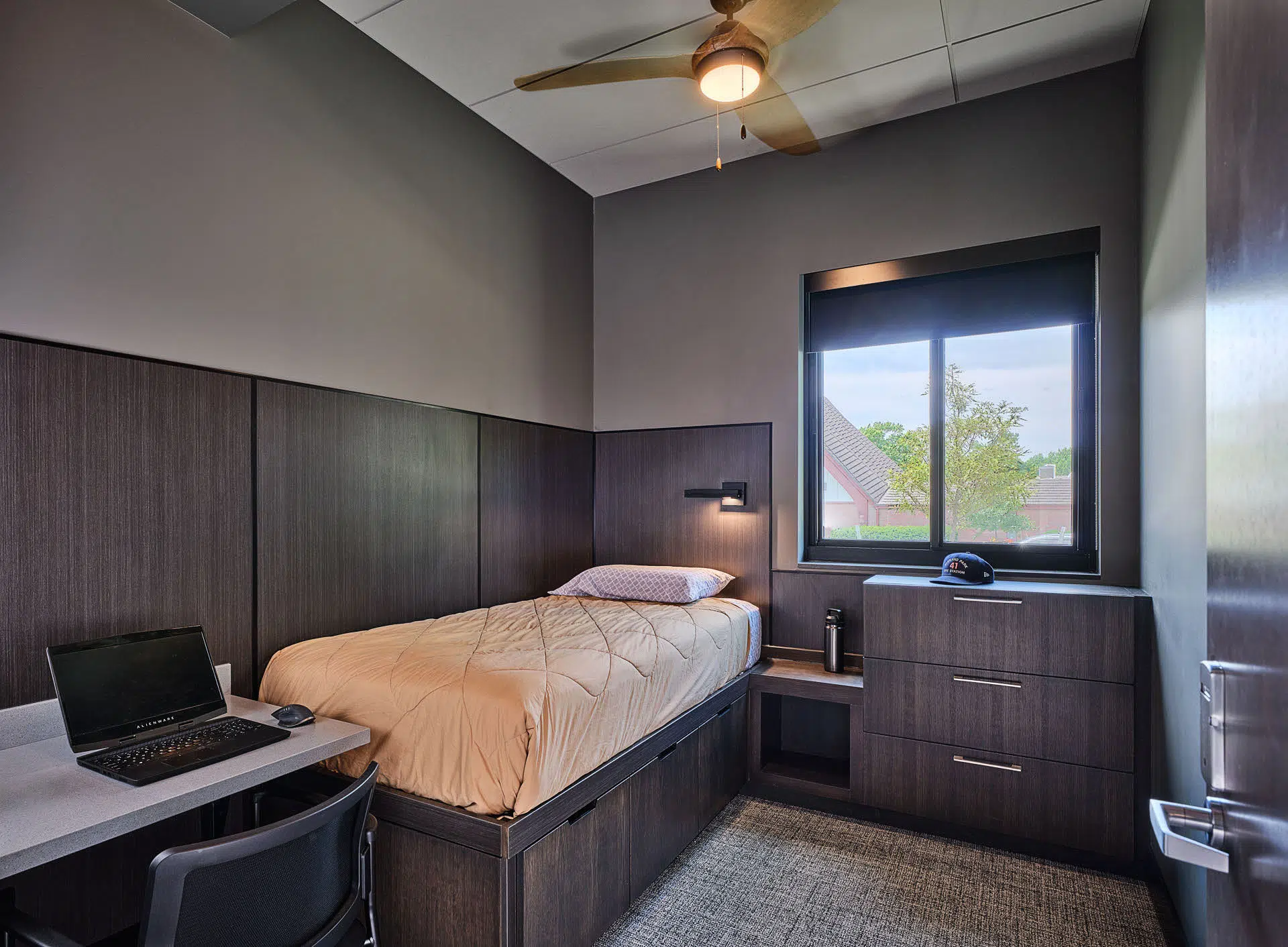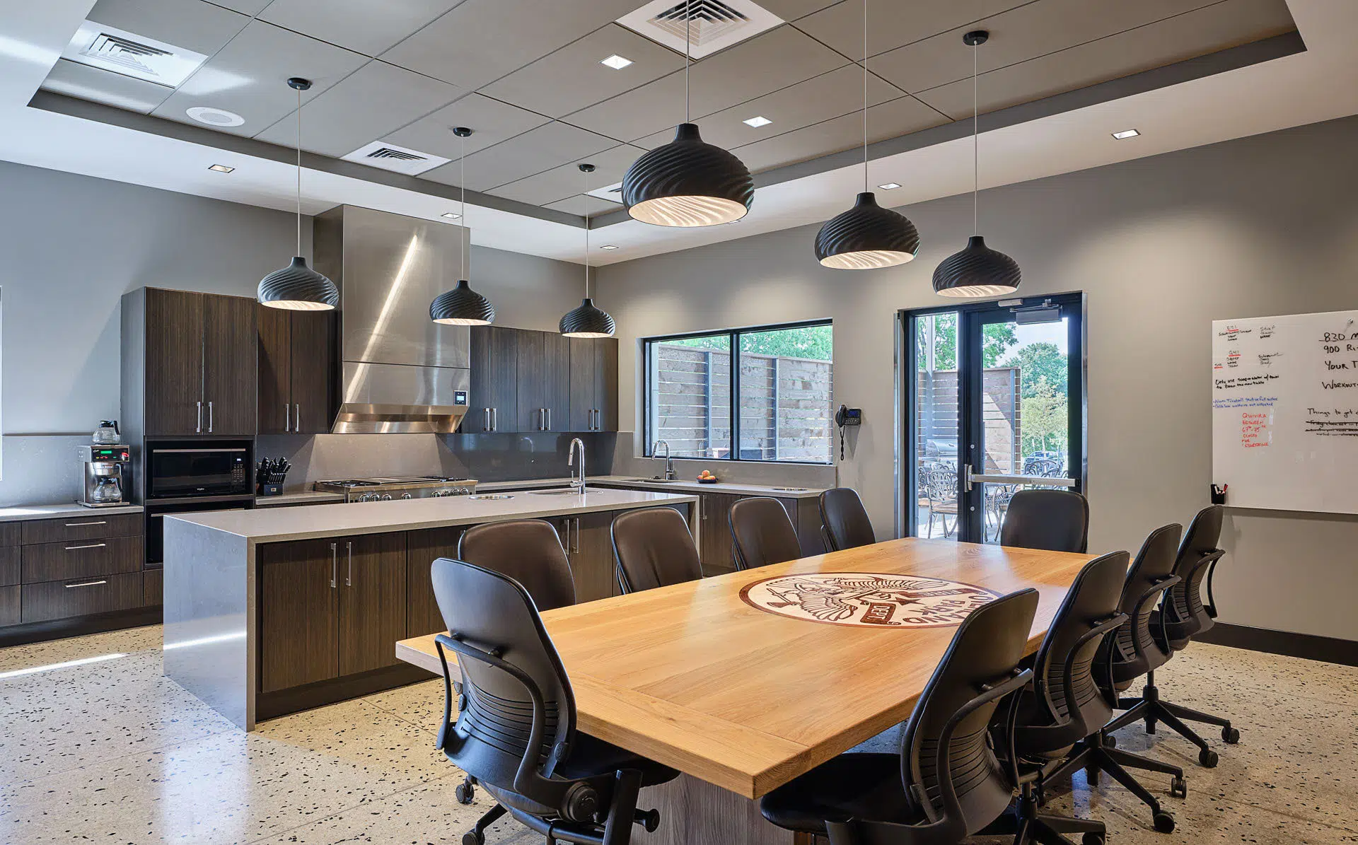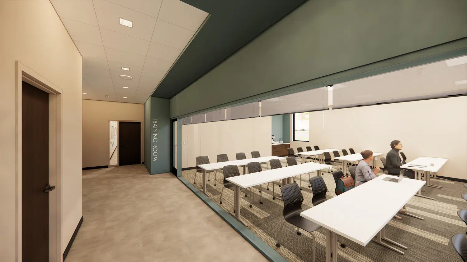 All living spaces are designed to promote mental health and well-being. The station features a two-story fitness facility that opens to the rear apron for indoor and outdoor conditioning programs. Communal dining and gathering spaces encourage fellowship and socialization, while privacy, reflection, and rest are emphasized in the inclusive restrooms and individual sleeping quarters with separate, direct-access shift lockers.