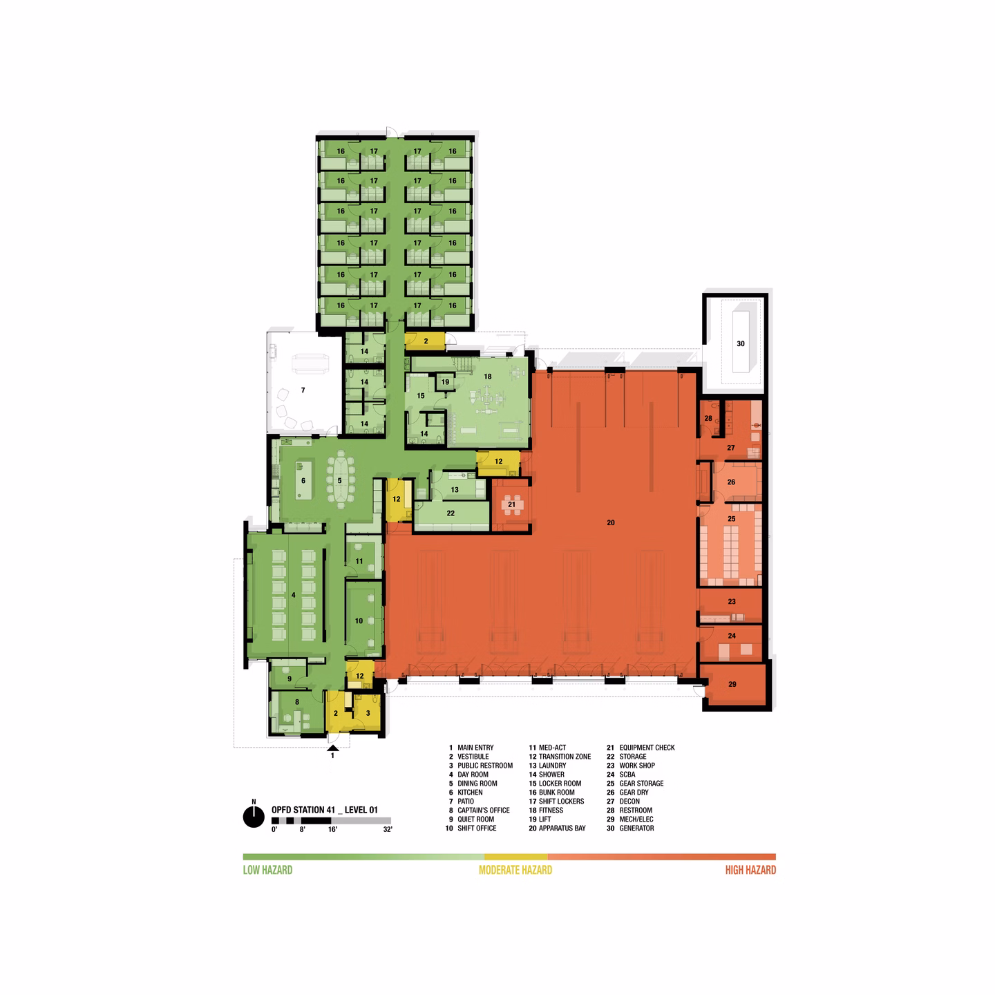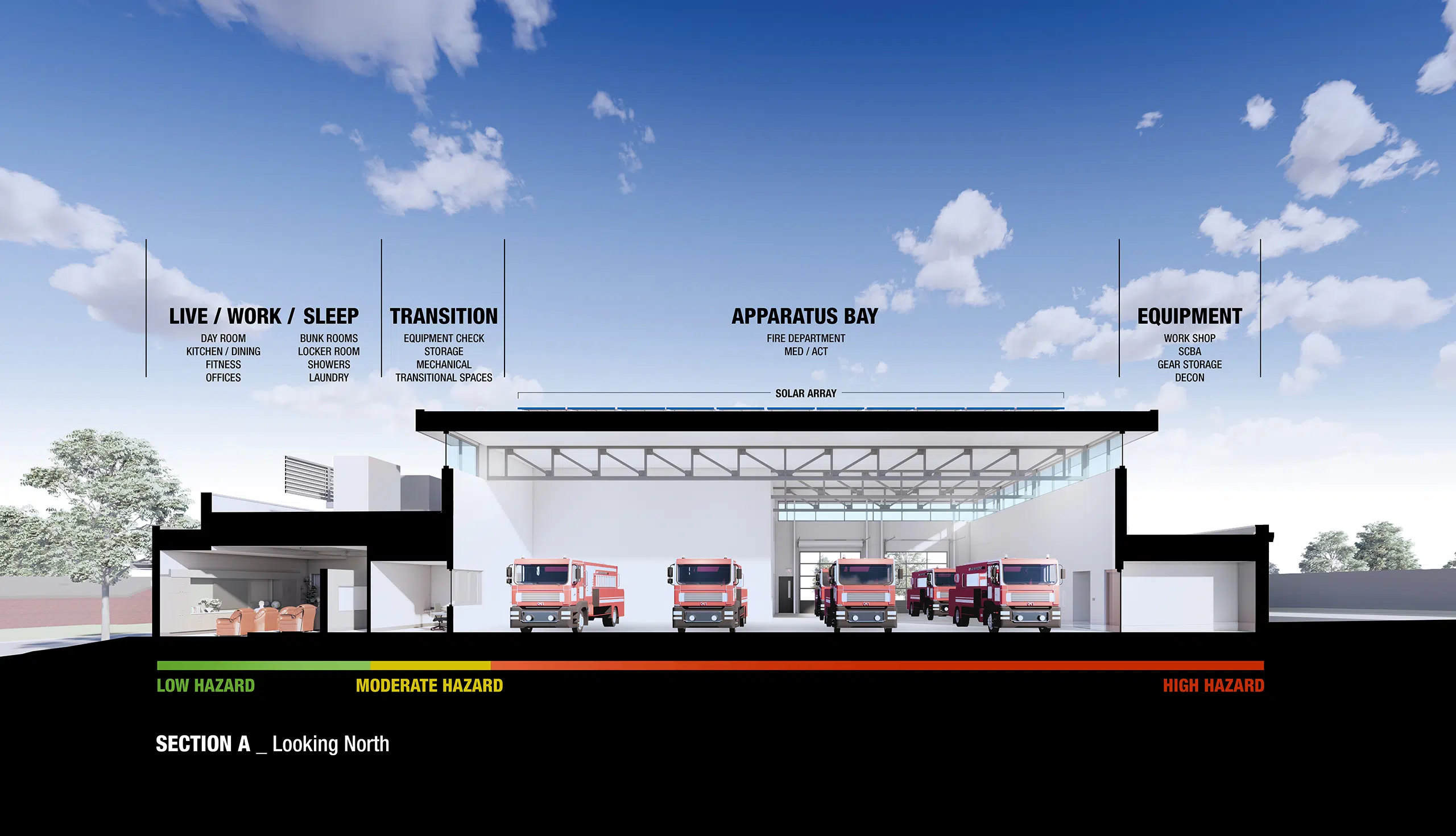 The design manages exposure to harmful substances through careful organization, prioritizing occupational health with strict contamination control measures. High hazard zones, including the drive-through apparatus bay, decontamination area and support spaces, are designed to contain and manage the highest risks. Moderate hazard transition zones serve as buffers, limiting transmission of and exposure to harmful carcinogens. Low hazard zones, which contain the station’s living spaces, provide a safe and comfortable environment for firefighters.