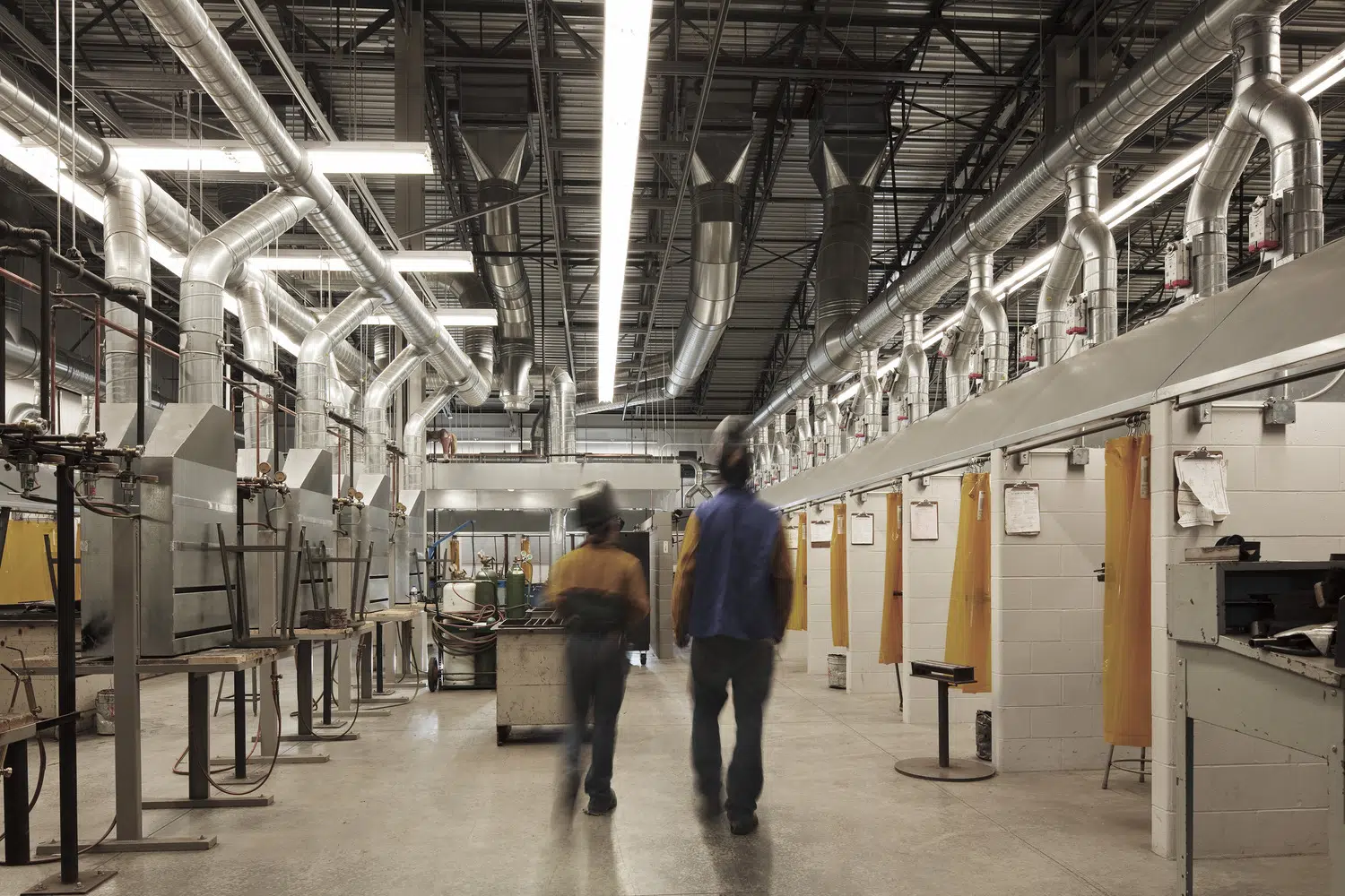 The new facility needed to be on one level to accommodate the industrial aspects of the educational programs on a very tight site. Nearly all spaces required at-grade access for deliveries of materials and to allow access of vehicles into the building. Additionally, the city had passed recent architectural design guidelines that preferred mechanical systems not be placed on the roof without extensive screening, and if they were placed on the ground, extensive screening was required. However, the project required a large amount of mechanical equipment required for exhaust and fresh air intake to accommodate the industrial uses of the building. In sum, these restrictions played a large part in the center’s eventual design.