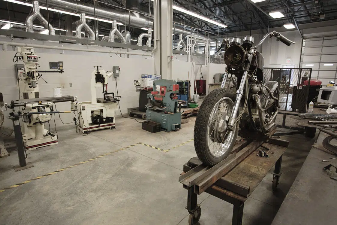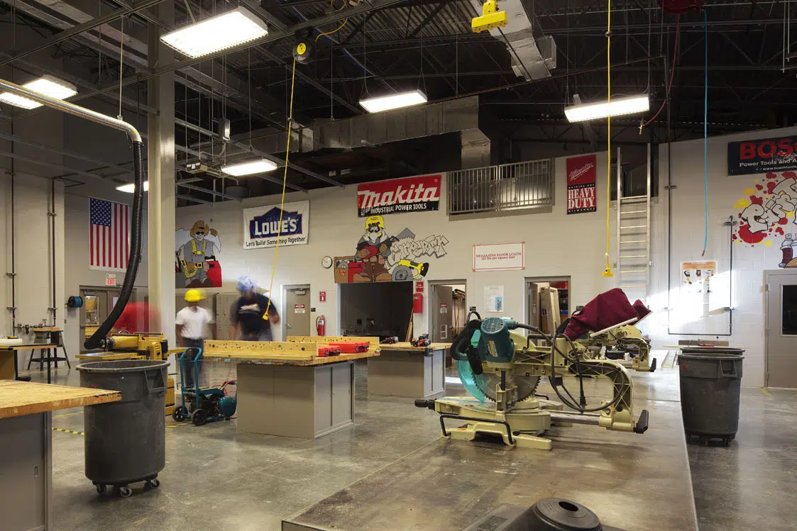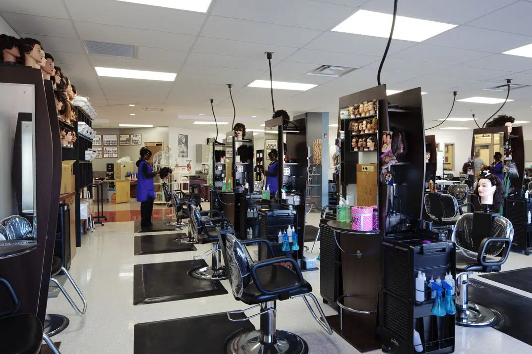The cosmetology program dictated very different requirements from the industrial programs in the rest of the new building. This program serves the public after normal school hours and needed to differentiate itself from the rest of the facility. Part of the design solution was to locate the program at a higher elevation at the main entry, which helped accommodate the grade difference on the site, and helped differentiate this program from the rest of the building. Locating this program at a 45-degree angle from the main facility and cladding it in Prairie Stone helped give it its own identity and addressed property line restrictions at the south end of the site.