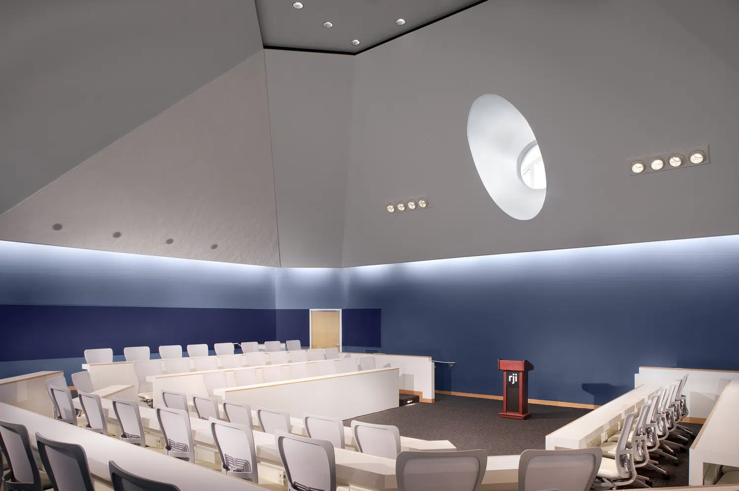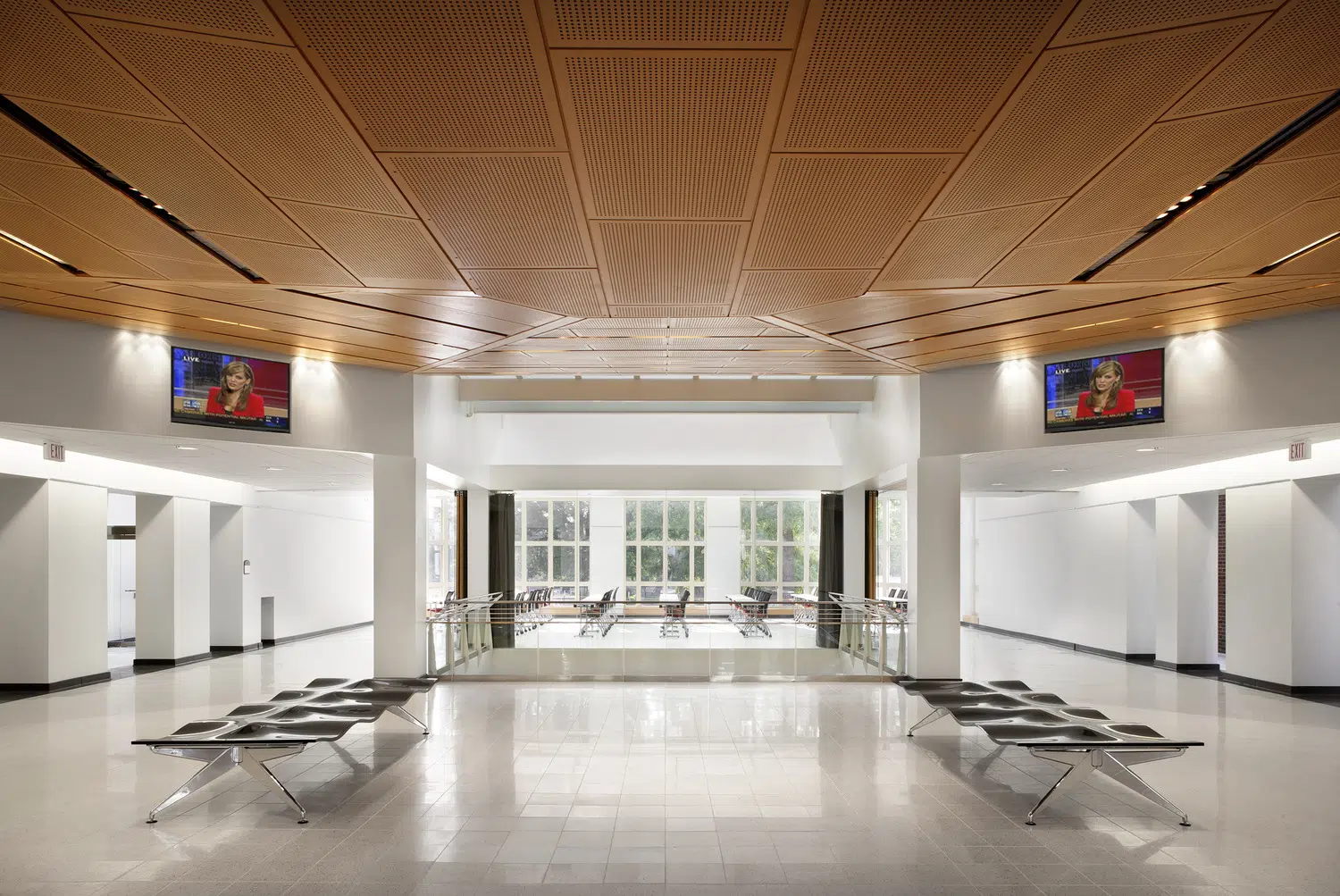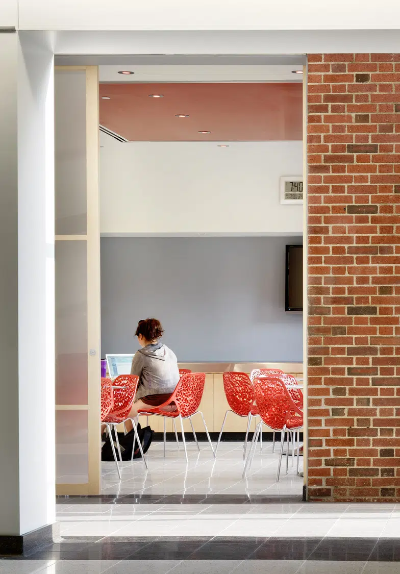 The resulting 47,000 SF facility is connected, functional and easily navigated. Inside, labs, classrooms, lecture halls, meeting rooms, library facilities, office spaces and other resources provide modern amenities with a user-friendly aesthetic and easily accessible technology. The new RJI facility creates continuity and a sense of place within the Quadrangle while enhancing the School of Journalism and the overall campus.